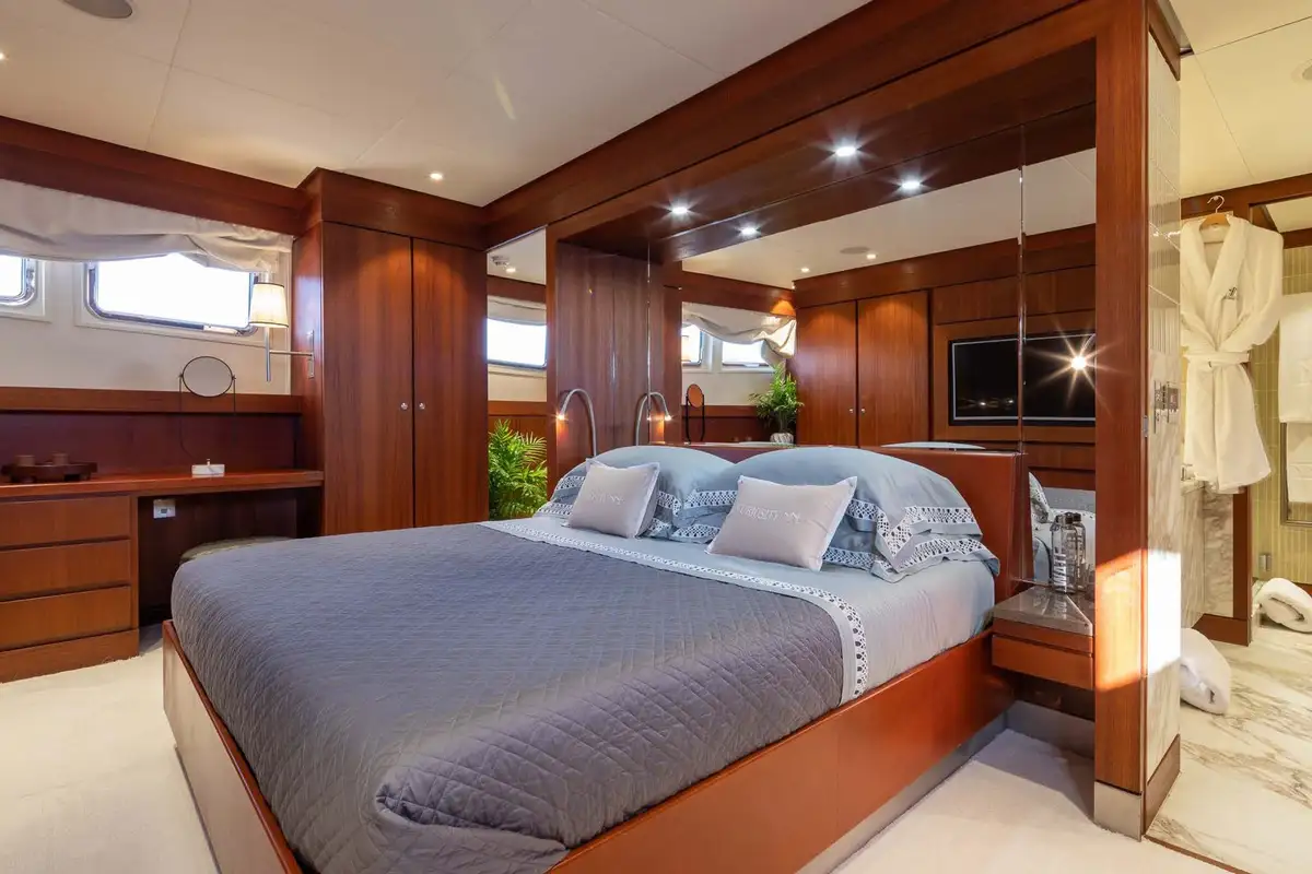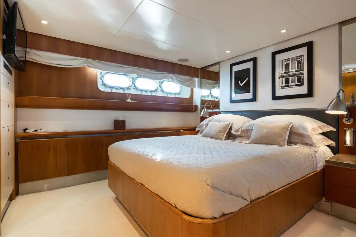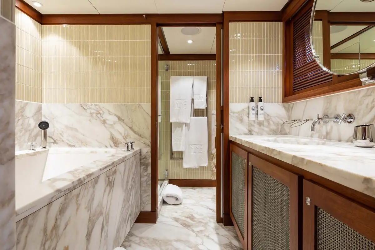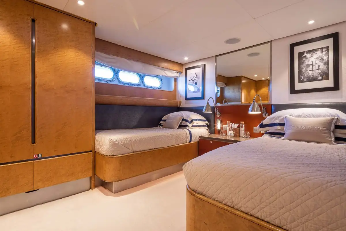CURIOSITY can accommodate 12 guests in 6 elegant suites; these include a main deck master double suite, with a private office, and an upper deck double VIP suite that opens out onto the al fresco lounge area of the upper deck. On the lower deck one finds two double suites and two twin suites, all cabins are immaculately presented and have en suite bathroom facilities.