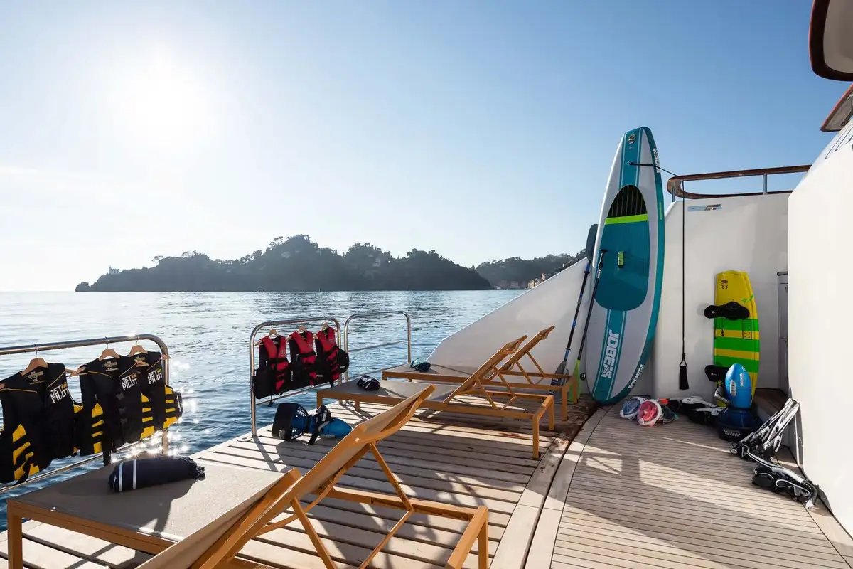 CURIOSITY has a wealth of water toys and towable equipment (wakeboards, three-person inflatable banana, waterskis etc), PWC, six Yamaha sea scooters and kayaks and SUPs all to keep you and your party fully entertained while enjoying this unique yacht.