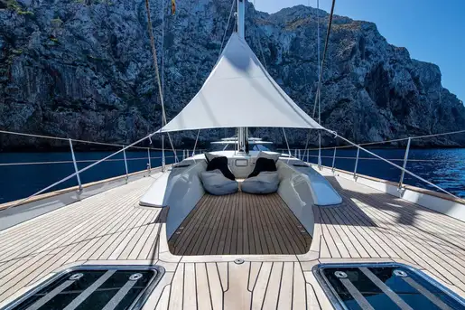 Up on deck you’ll have a good variety of places to relax while sailing from one destination to the next, including a snug and secure passenger cockpit with ample seating and a bimini top for shade. There are also seats and day beds further aft, and a recessed relaxation space on the foredeck with a nest of cushions.