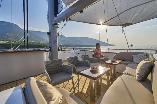 Designed and purpose-built to cruise the lovely islands and mainland coasts of the Adriatic, DALMATINO is exceptionally spacious for a 44-metre sailing vessel. She has an excellent variety of outside spaces for relaxing, dining, lounging and partying, with plenty of seats and day beds in full sun and others in deep, cool shade. There’s a large jacuzzi on the sundeck where you’ll also find two separate sunbathing areas and a sociable lounge with a bar.