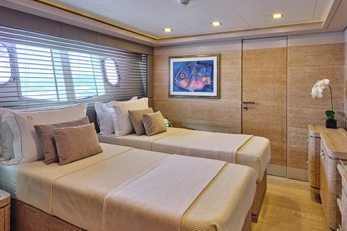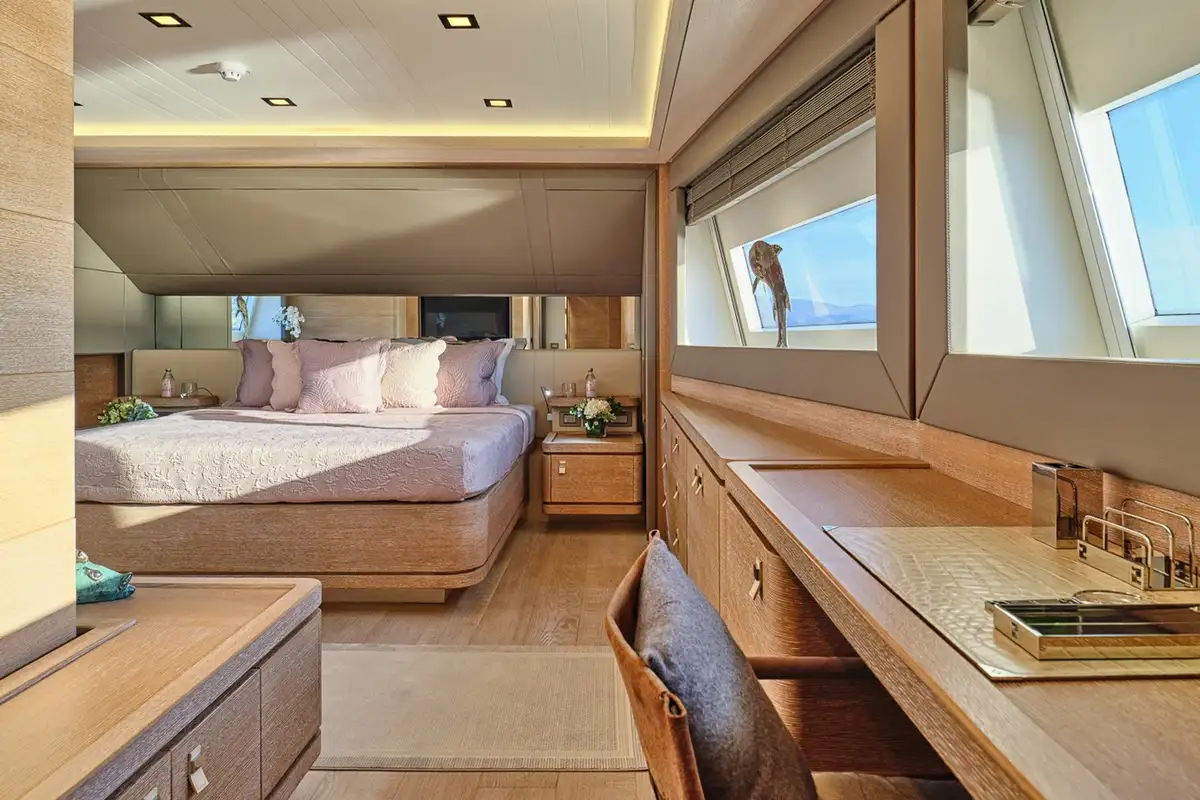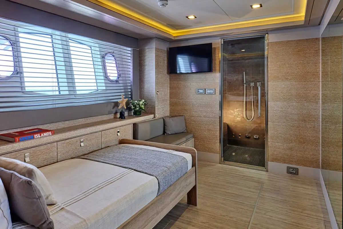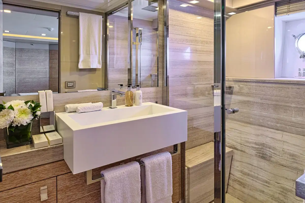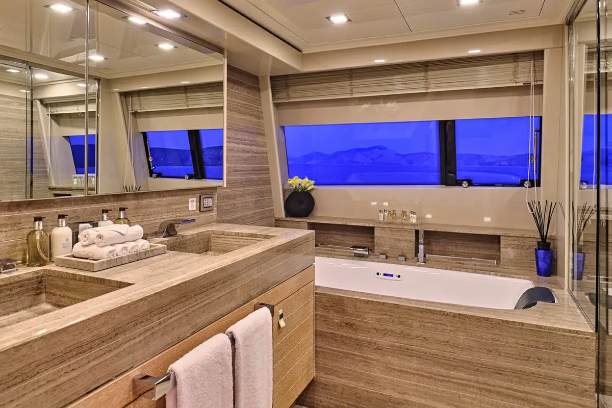 With the primary dining area on the upper deck, the main deck lounge has a notably spacious lounge. The master suite, up front on the main deck level, has an L-shaped main cabin with a study area, a large walk-in closet and a full size bathtub in the marble-clad en suite bathroom. The other guest cabins are two doubles and two twins, each with a private en suite bathroom.