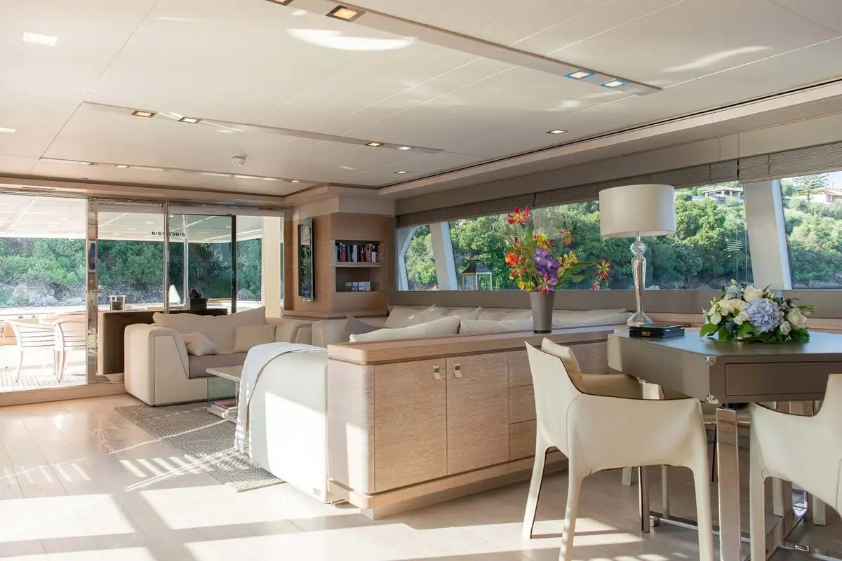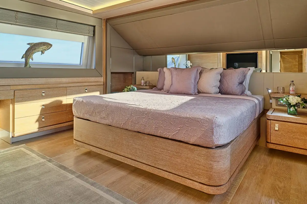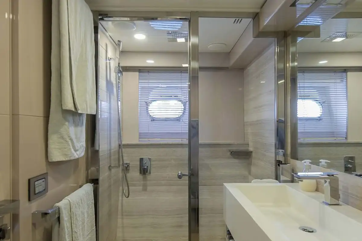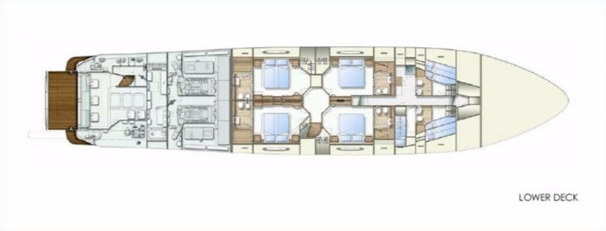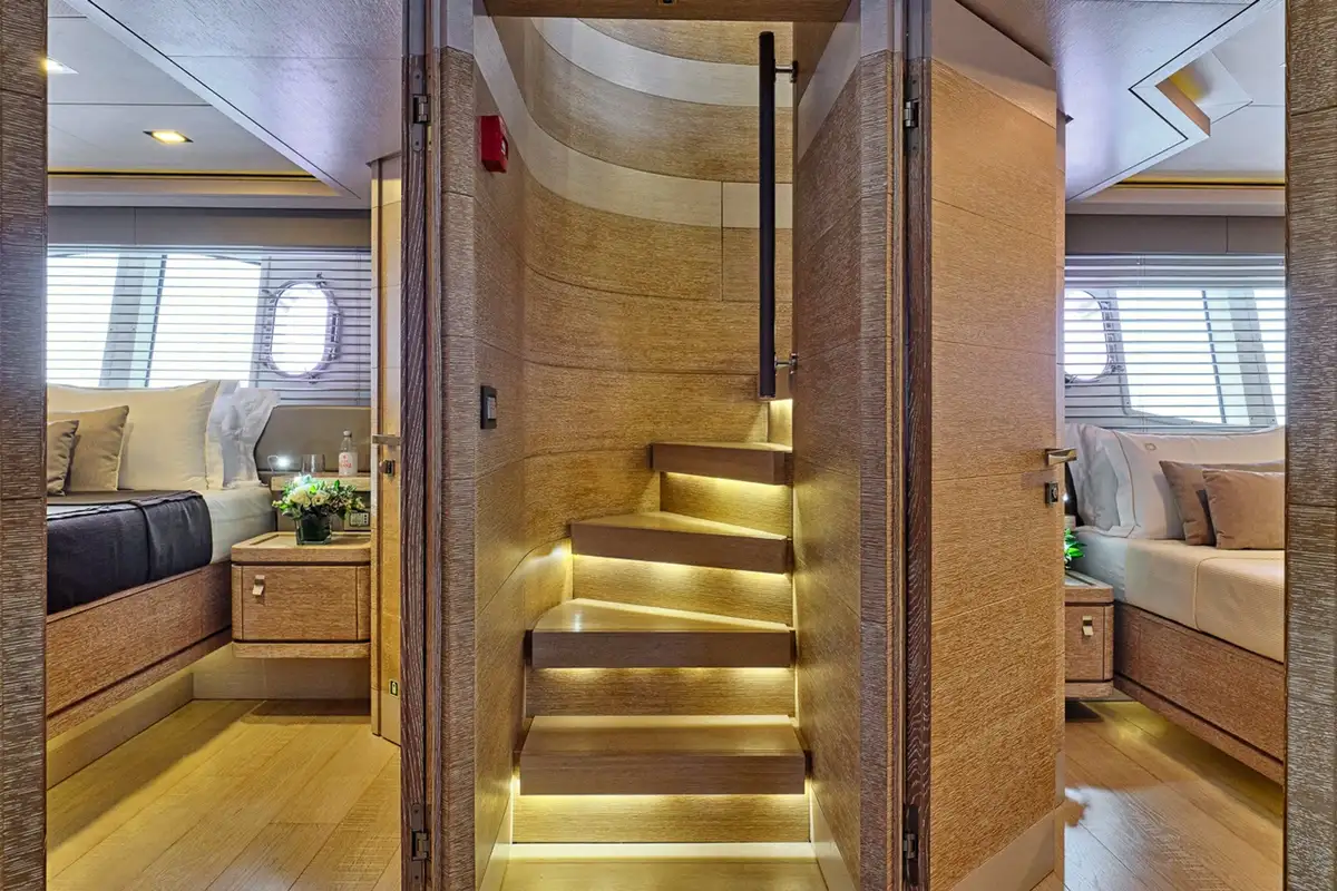 With the primary dining area on the upper deck, the main deck lounge has a notably spacious lounge. The master suite, up front on the main deck level, has an L-shaped main cabin with a study area, a large walk-in closet and a full size bathtub in the marble-clad en suite bathroom. The other guest cabins are two doubles and two twins, each with a private en suite bathroom.