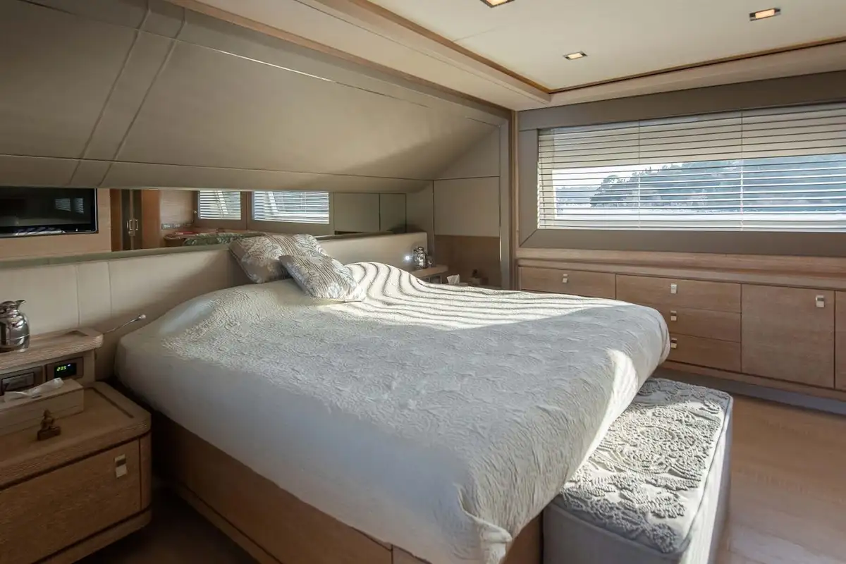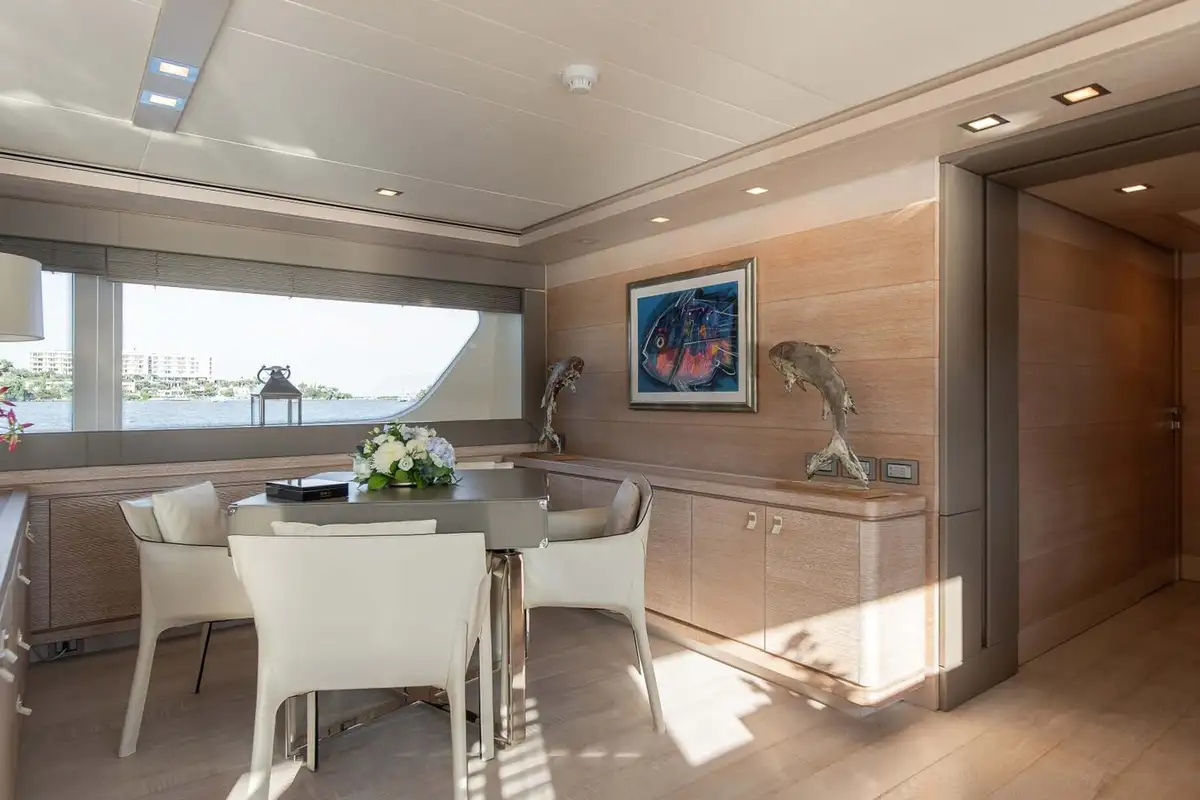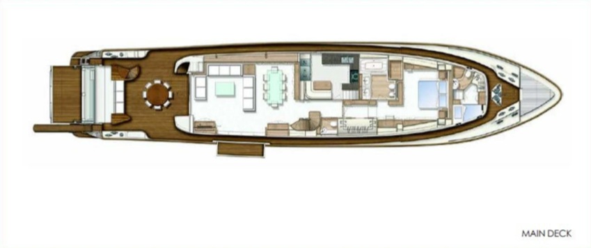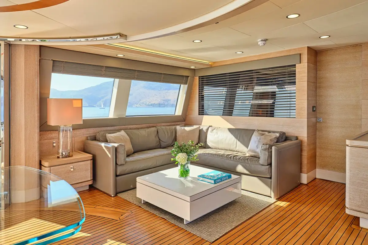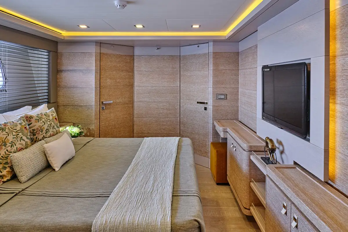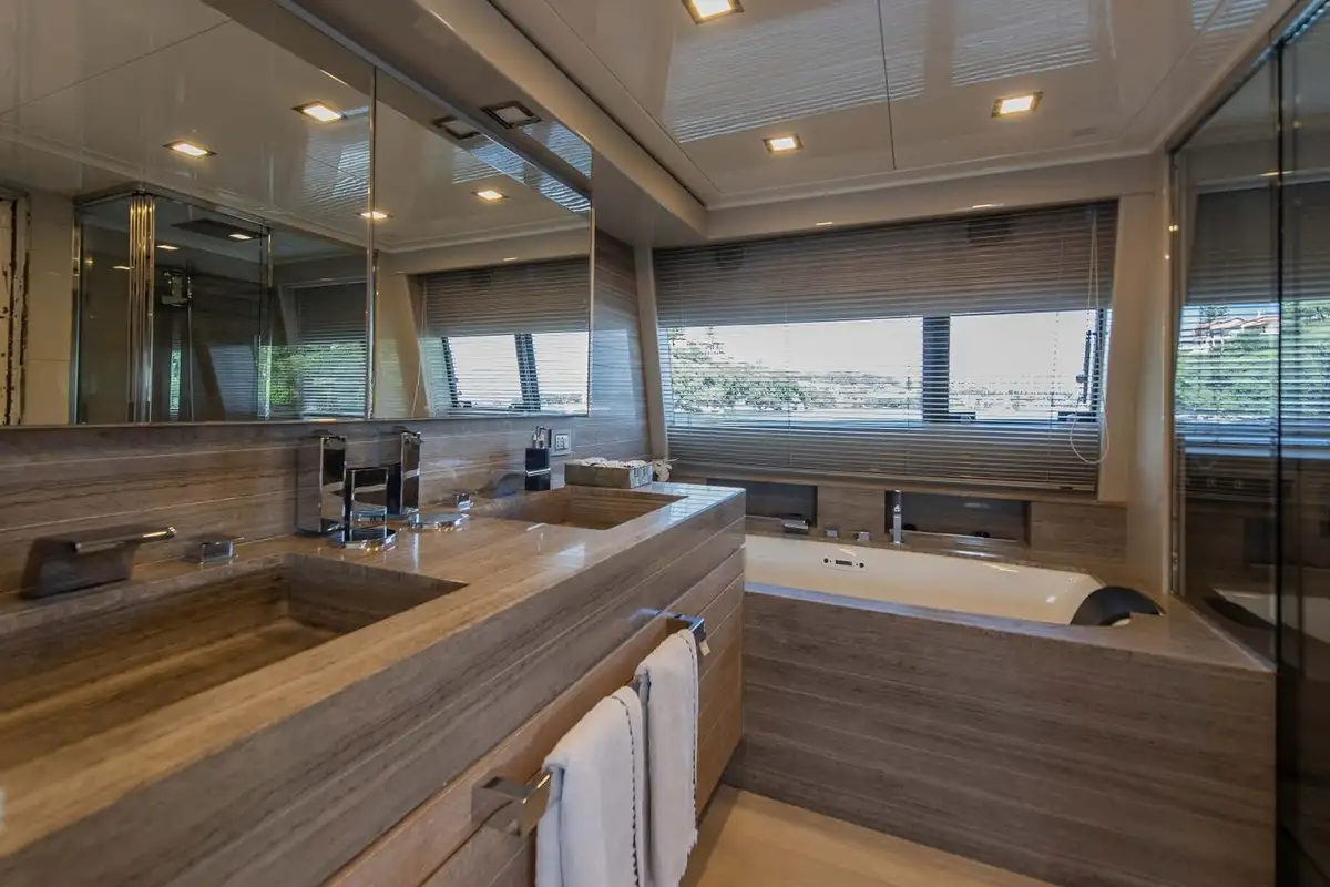 With the primary dining area on the upper deck, the main deck lounge has a notably spacious lounge. The master suite, up front on the main deck level, has an L-shaped main cabin with a study area, a large walk-in closet and a full size bathtub in the marble-clad en suite bathroom. The other guest cabins are two doubles and two twins, each with a private en suite bathroom.