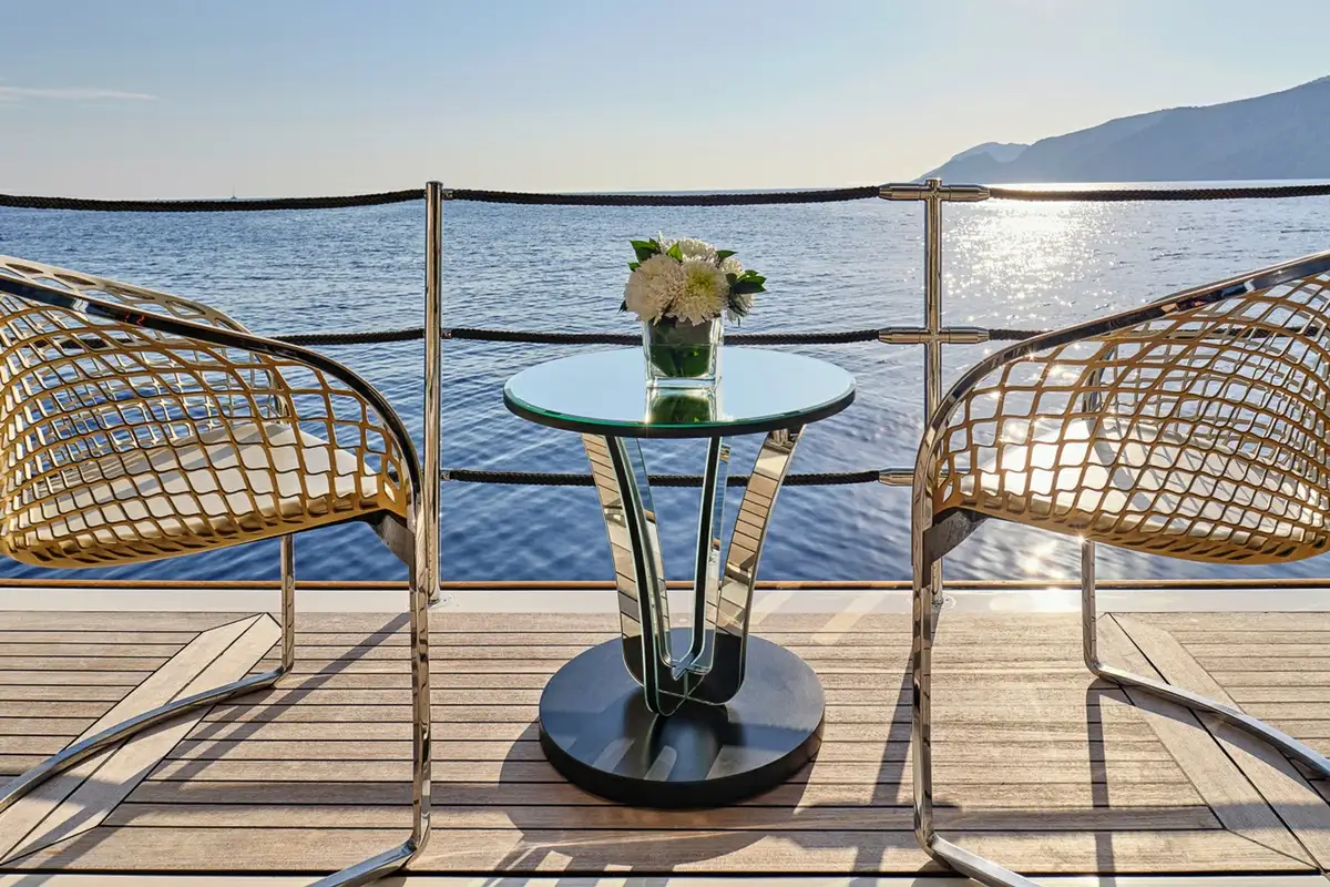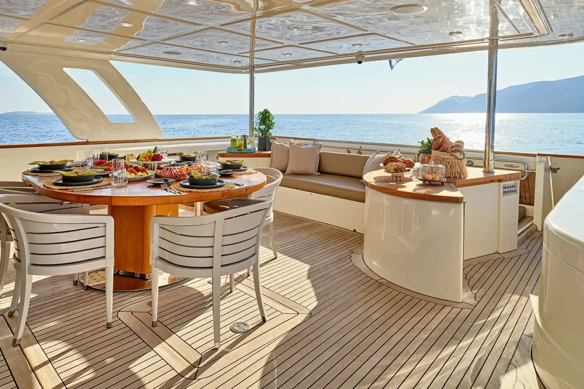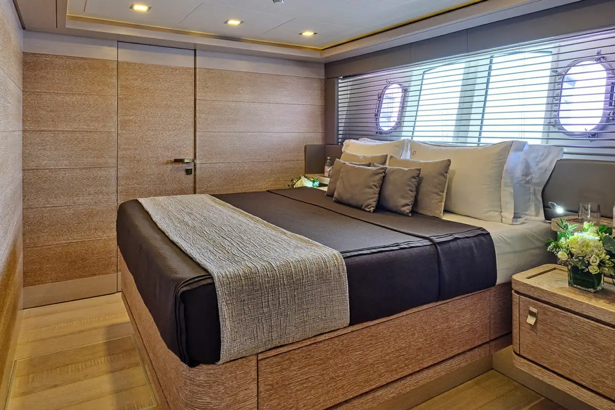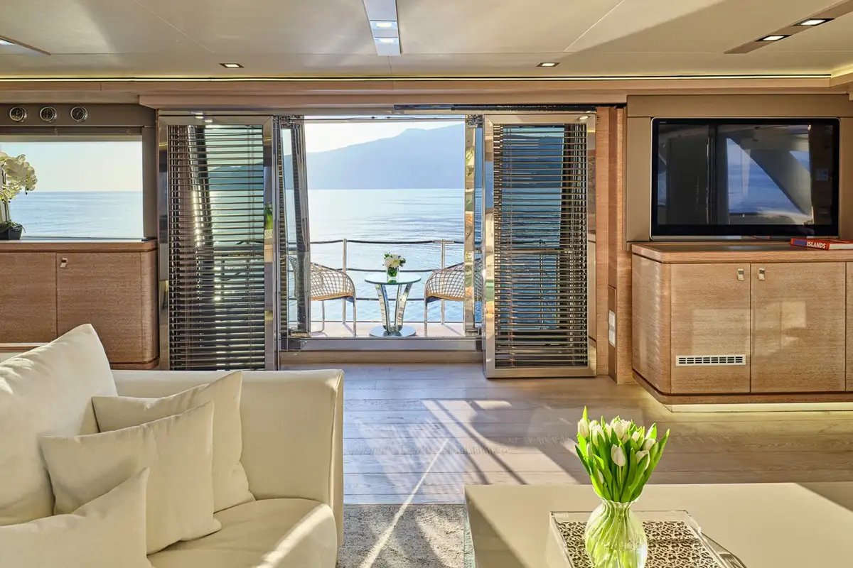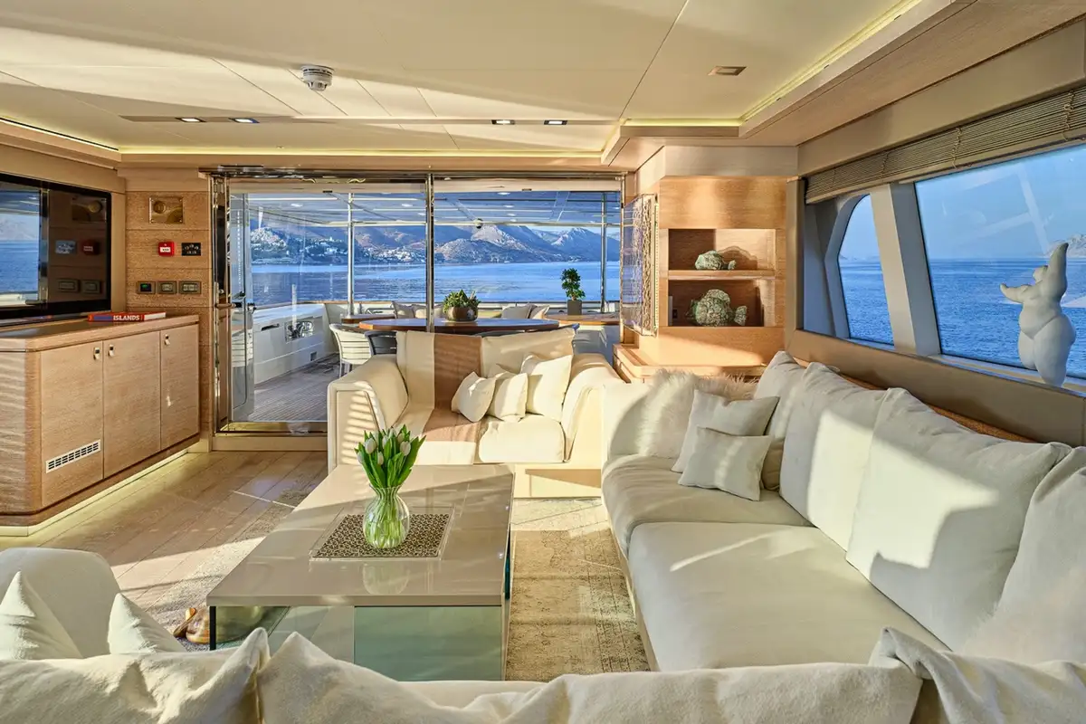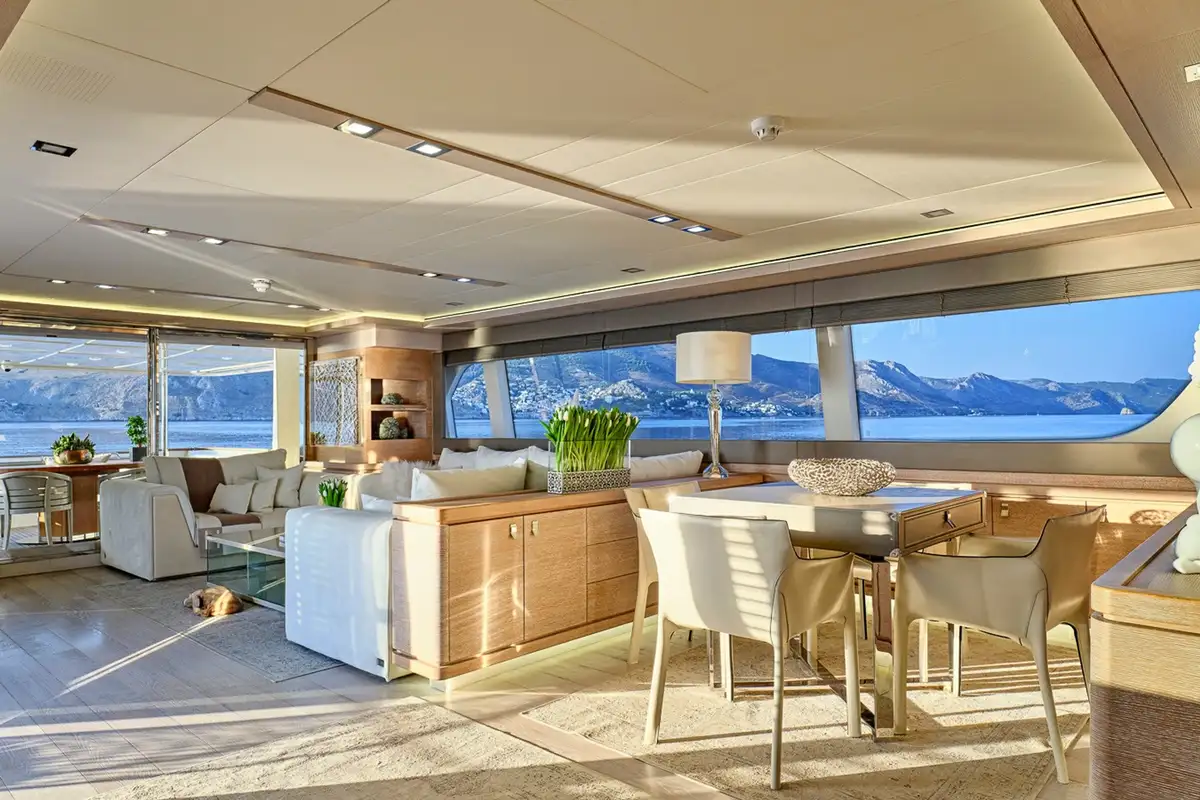 Key features include the all-new, bright and welcoming interior décor, an outside balcony terrace on one side of the lounge, and the spectacular inside-outside dining space on the upper deck. With very large through-hull windows in the lower deck cabins, as well as in the master suite above them on the main deck level, all guests on board can enjoy an abundance of natural light. She also has stabilisers to smooth her motion at sea, whether she’s anchored or en route to the next destination, and another bonus is relatively low fuel consumption.