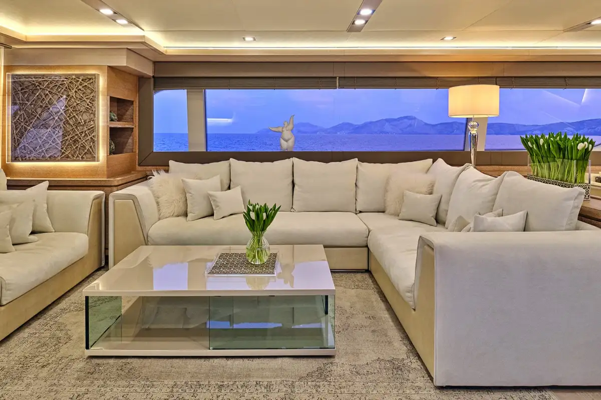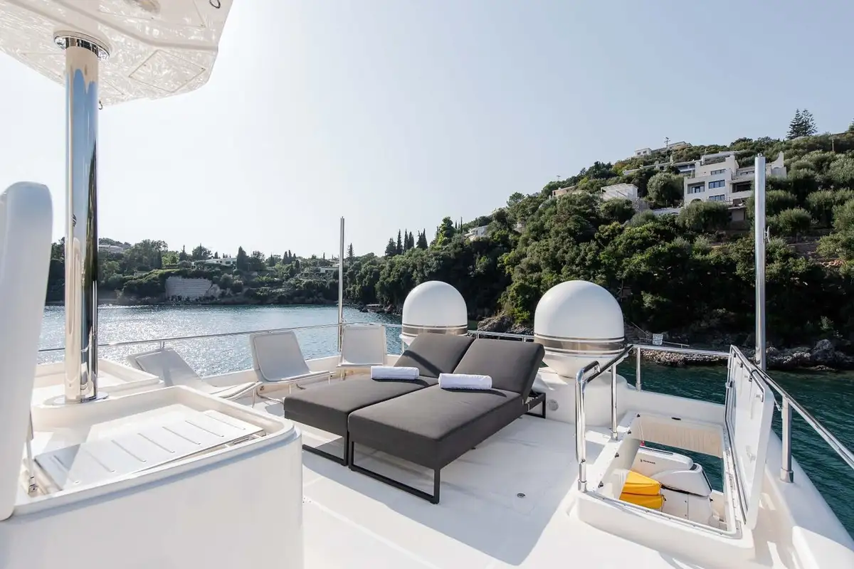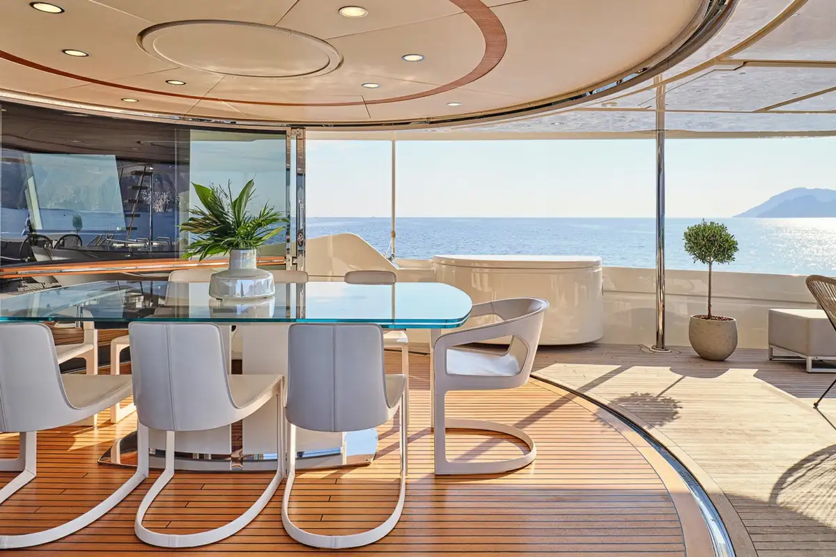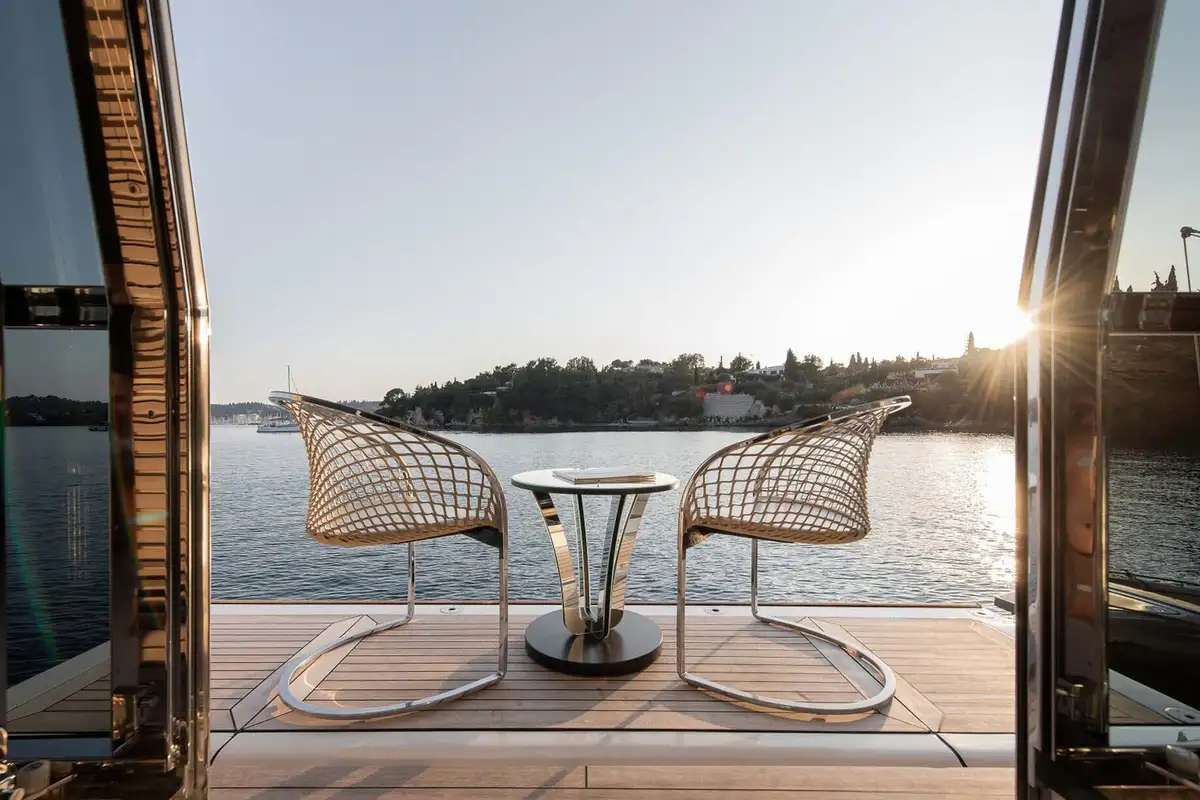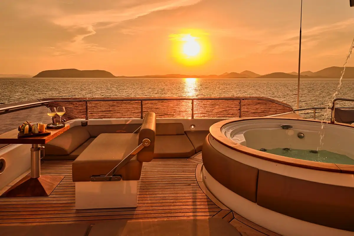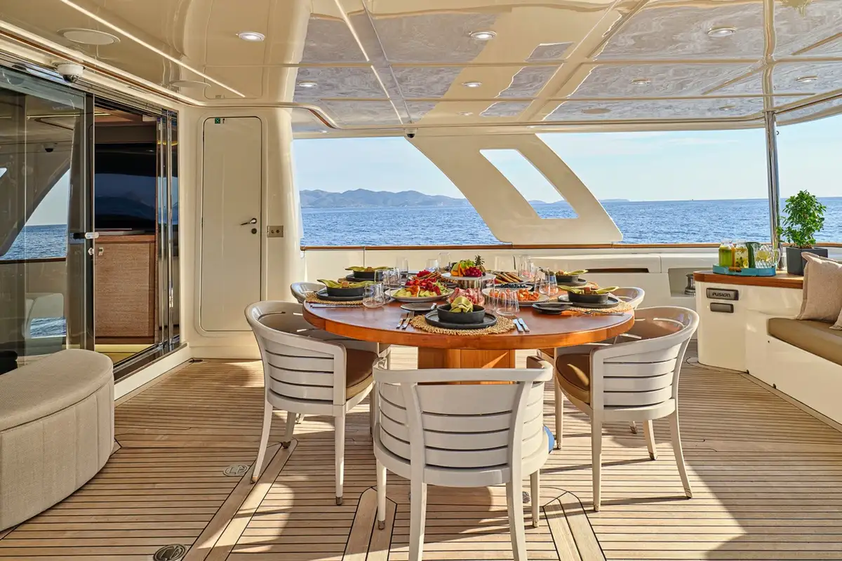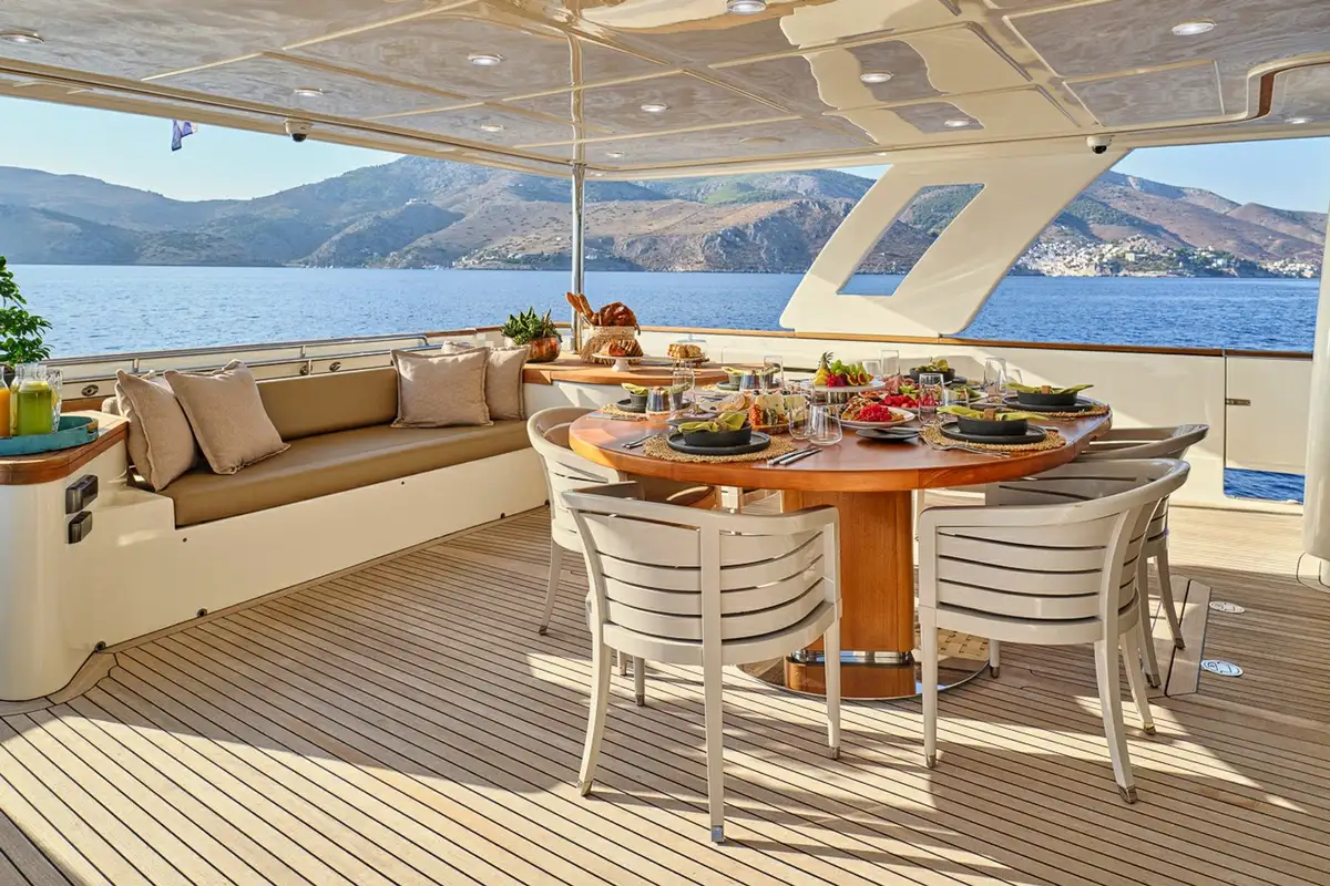 Key features include the all-new, bright and welcoming interior décor, an outside balcony terrace on one side of the lounge, and the spectacular inside-outside dining space on the upper deck. With very large through-hull windows in the lower deck cabins, as well as in the master suite above them on the main deck level, all guests on board can enjoy an abundance of natural light. She also has stabilisers to smooth her motion at sea, whether she’s anchored or en route to the next destination, and another bonus is relatively low fuel consumption.
