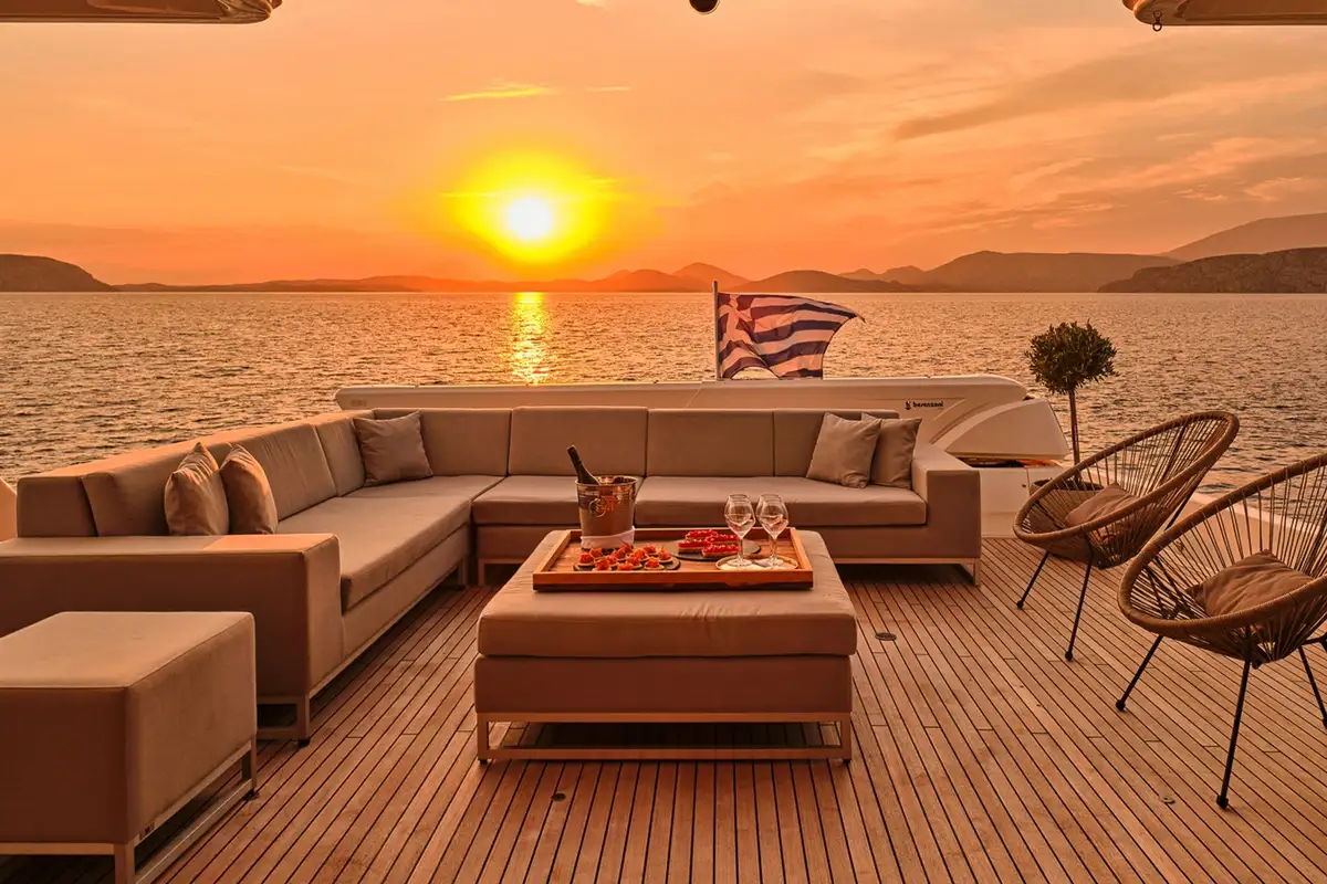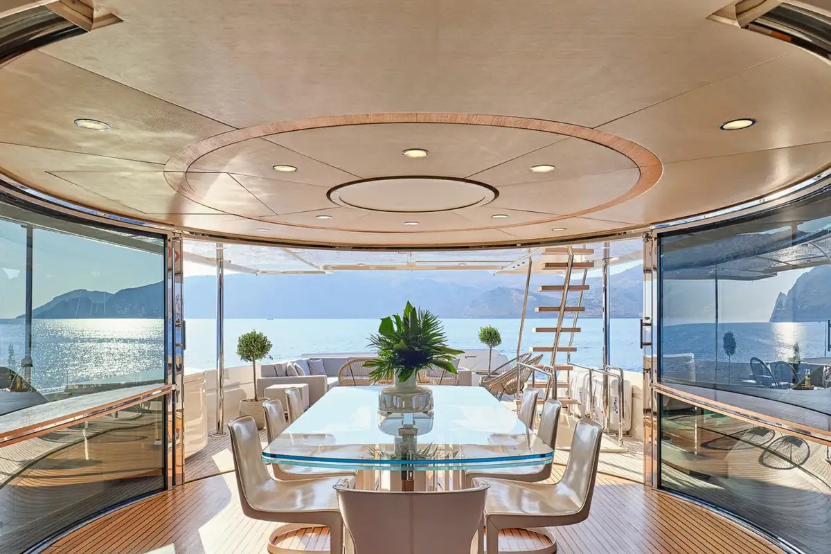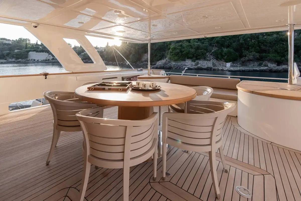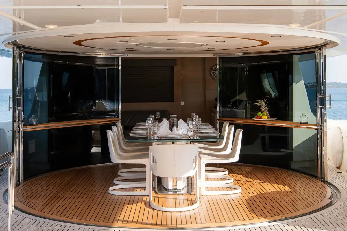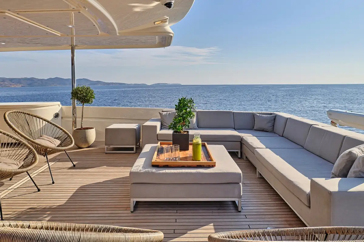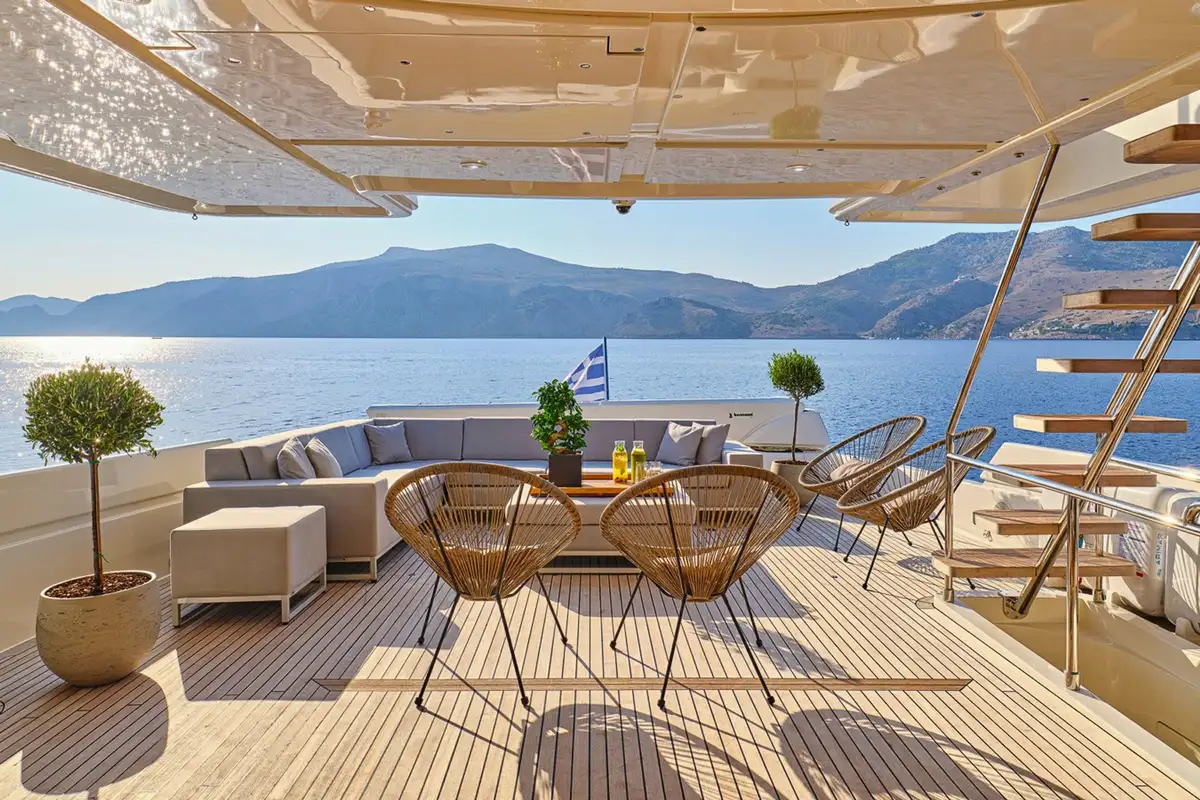 Key features include the all-new, bright and welcoming interior décor, an outside balcony terrace on one side of the lounge, and the spectacular inside-outside dining space on the upper deck. With very large through-hull windows in the lower deck cabins, as well as in the master suite above them on the main deck level, all guests on board can enjoy an abundance of natural light. She also has stabilisers to smooth her motion at sea, whether she’s anchored or en route to the next destination, and another bonus is relatively low fuel consumption.