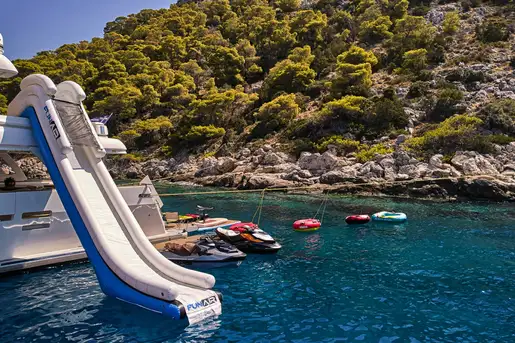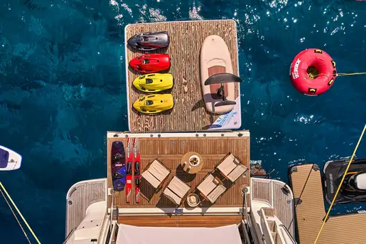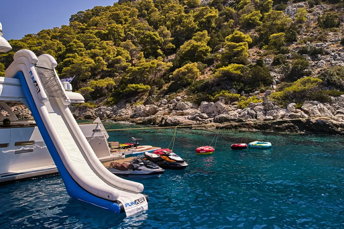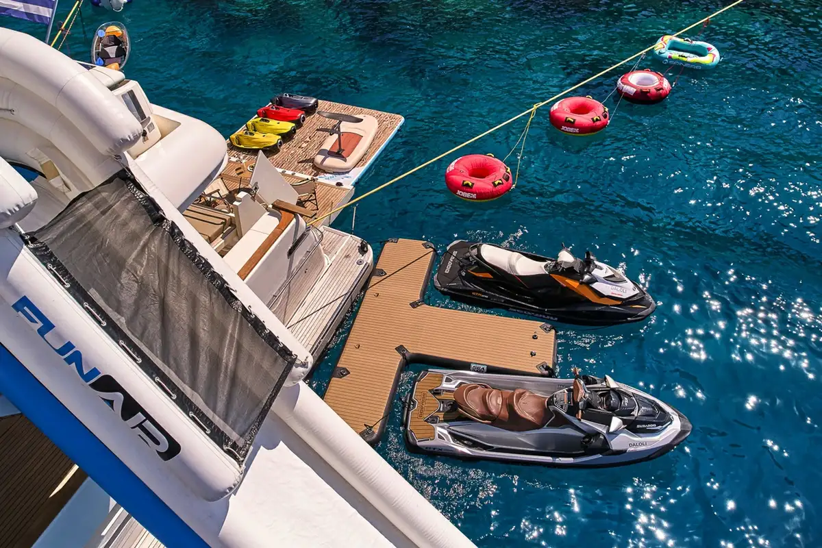 DALOLI carries an excellent range of watersports equipment. This includes an 8m (26.3ft) chase boat with a wakeboard, waterskis for all ages and a variety of inflatable tows, a fleet of two jetskis and three SeaBob underwater scooters, a swimming platform and a waterslide from the upper deck to the sea, plus a canoe, paddleboards, an electric mini scooter, a beach party setup and more.