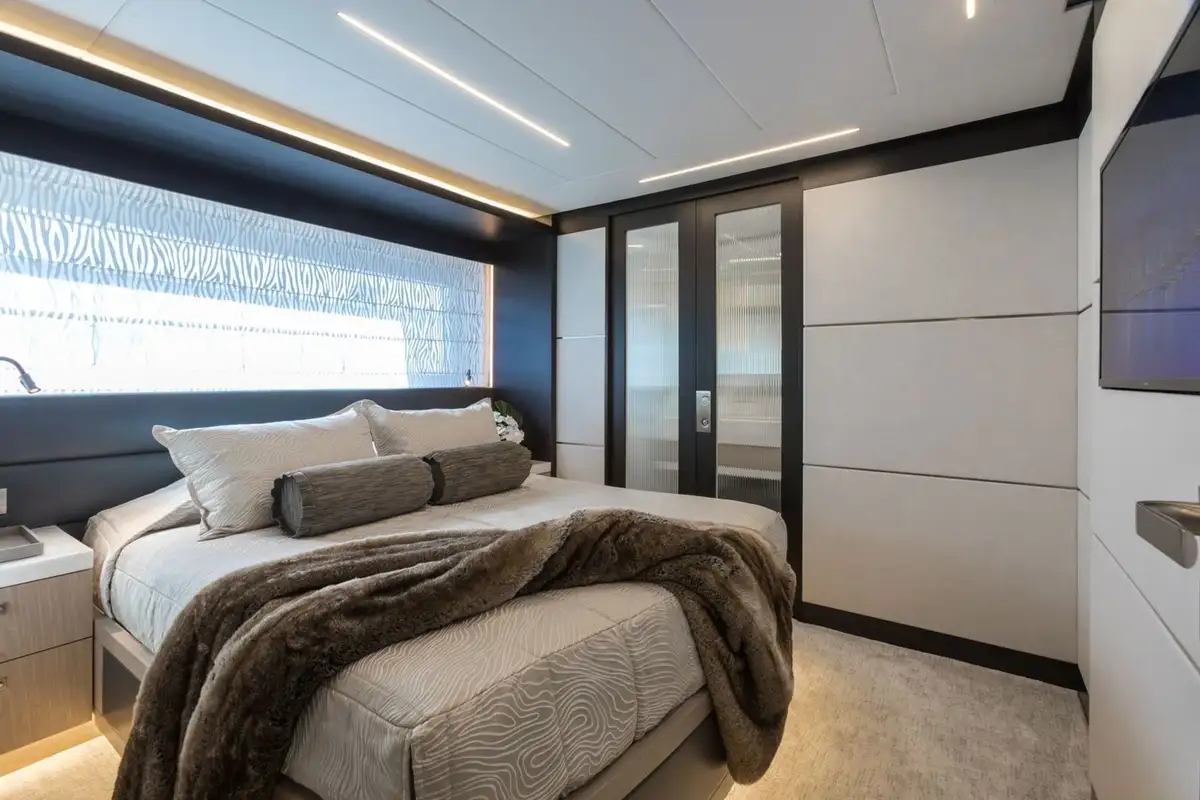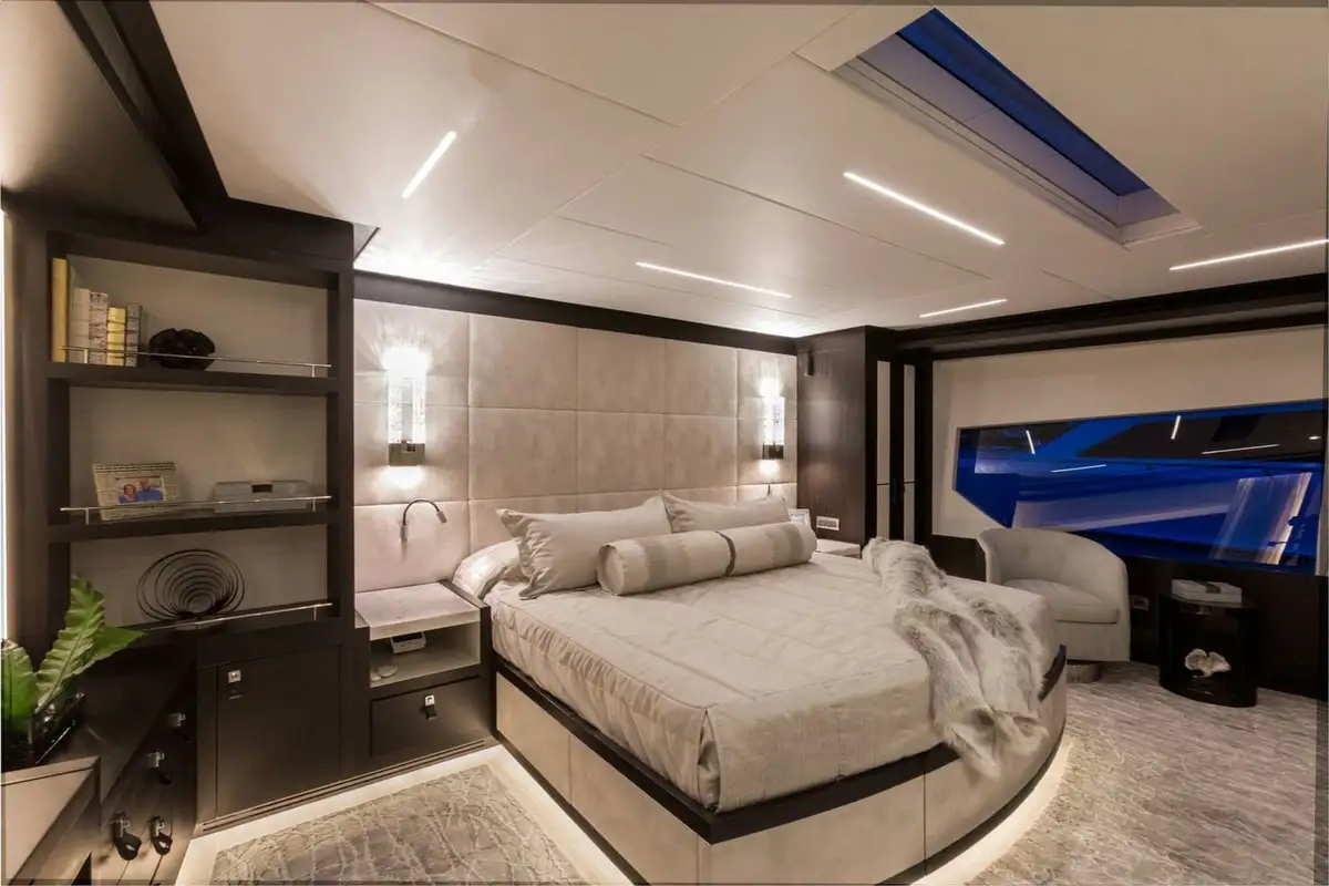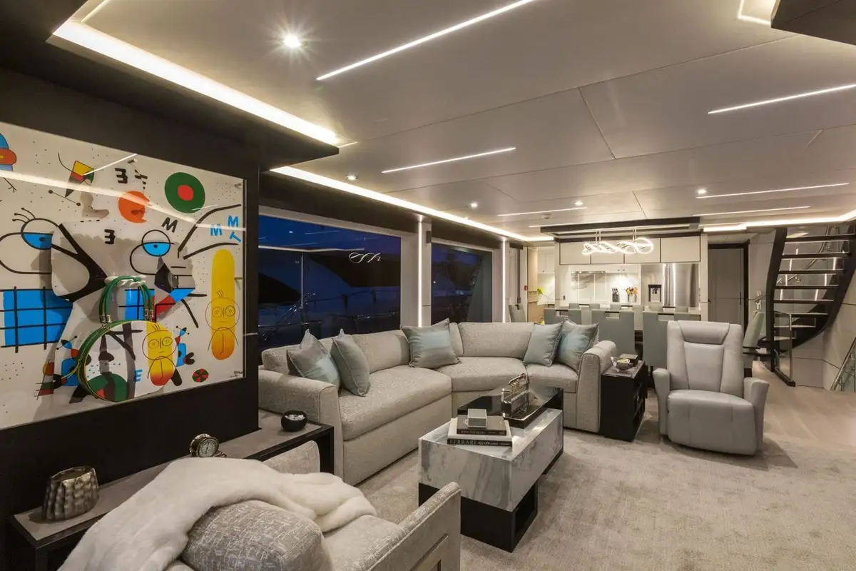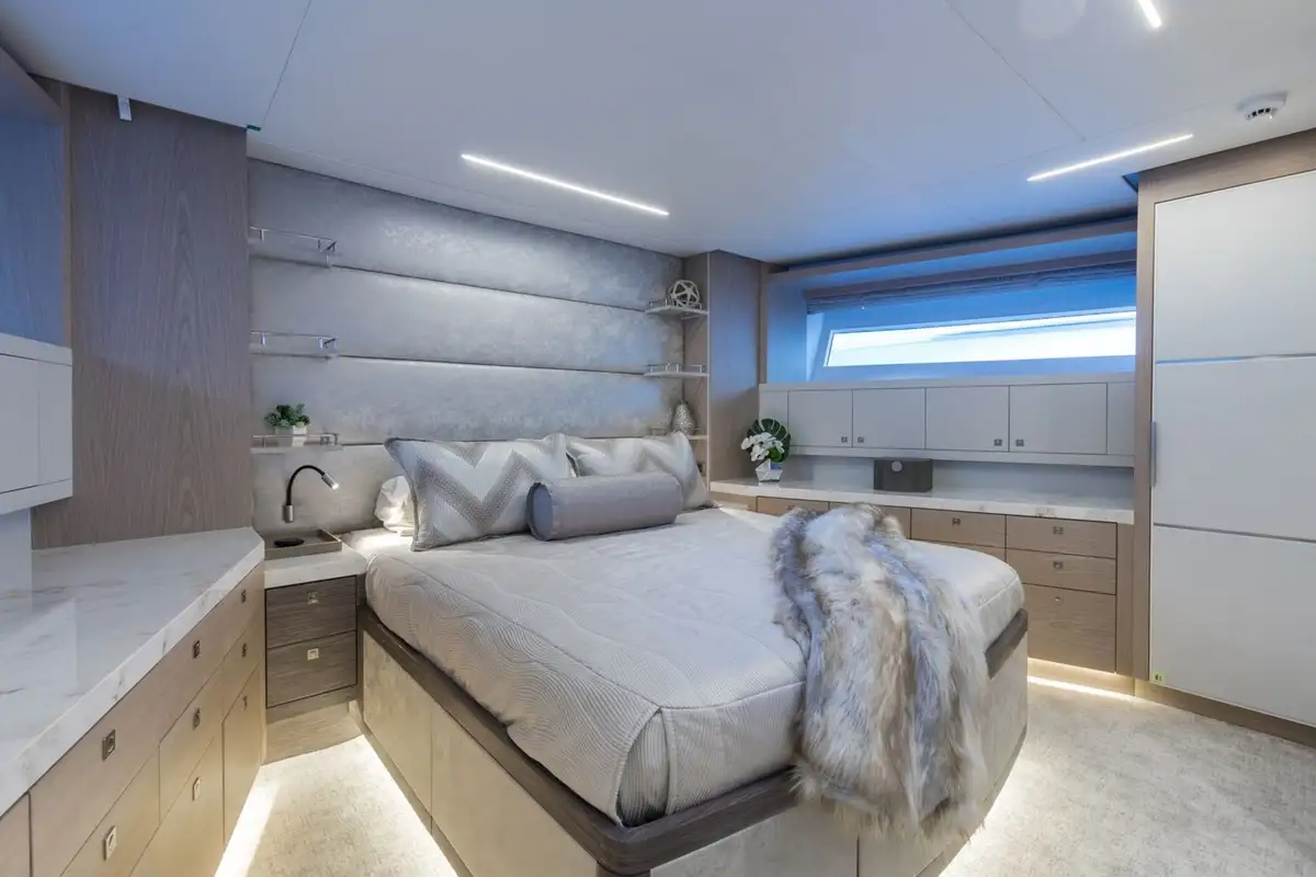 Key features include an extended pilothouse with a sky lounge and office space. The contemporary interior boasts soft neutral tones with pops of color, reflecting the onboard fun factor found on this yacht. A luxurious beach club is a haven for watersports lovers, with a bar, kitchenette, TV, lounge, day head and hydraulic swim platform. DAY ONE comes equipped with a variety of water toys providing fun for all ages. These include SeaDoo Sparks, inflatable paddle boards, inflatable kayaks, snorkel equipment and light fishing gear. The addition, the towed tender tempts exploration around every corner.