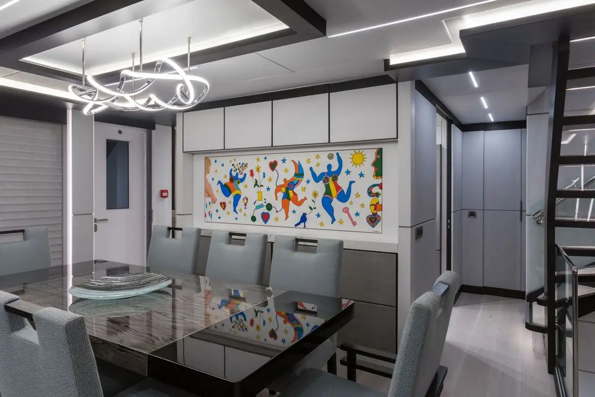 An abundance of exterior deck space includes multiple options for al fresco dining, including seating on the foredeck, paired with oversized sunpads and retractable umbrella to create a sunbather’s heaven. Further outdoor seating is found on the main deck aft, while the upper aft deck dining area provides the ultimate indoor/outdoor layout. The interior dining table easily accommodates 8 guests.