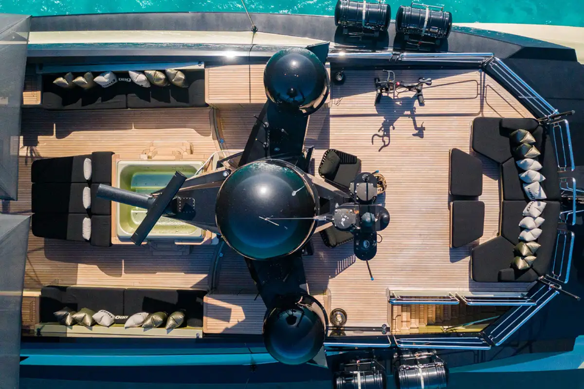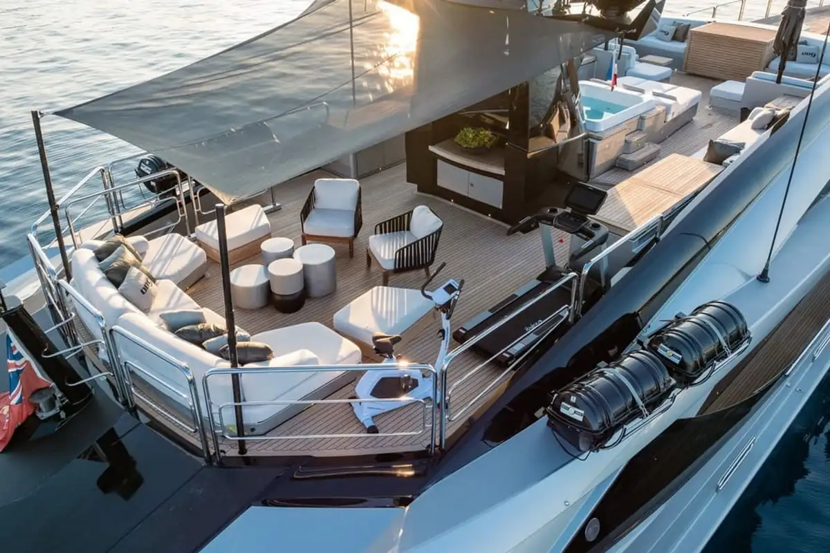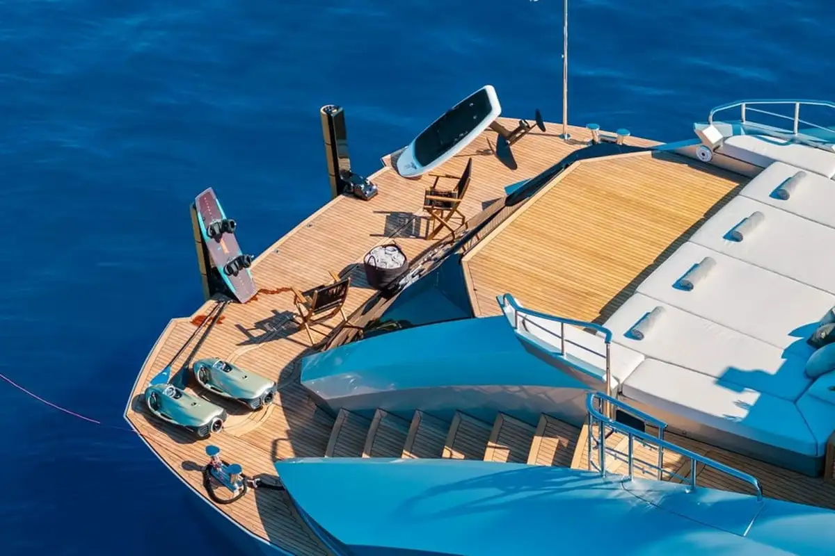 The sun deck is home to one of her two jacuzzis and there are plenty of lounges and daybeds to sunbathe and relax - or work up a sweat on the exercise equipment - as the world races by. There's another jacuzzi on the main deck aft, overlooking the large swim platform where the crew has the yachts many toys ready to go, and a huge sunpad to stretch out on after your dip.