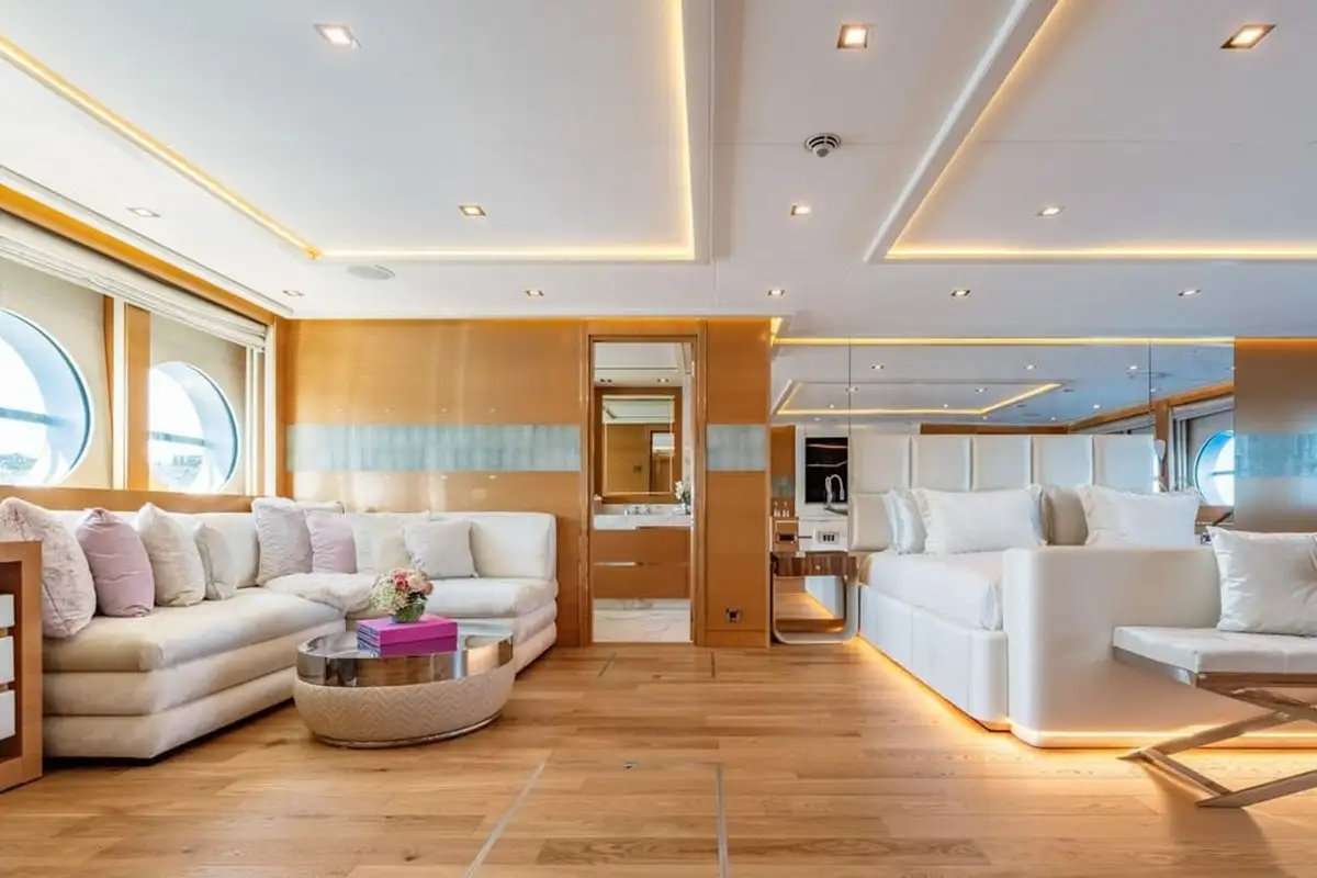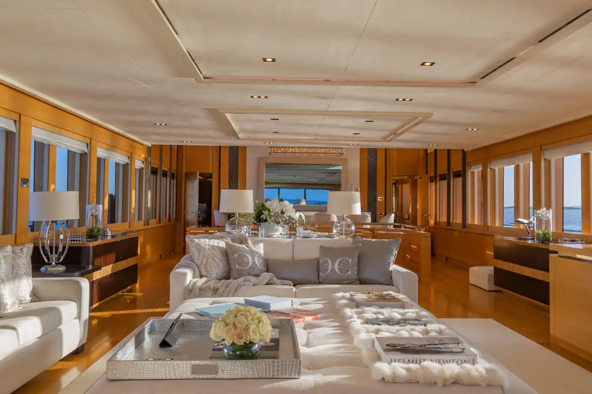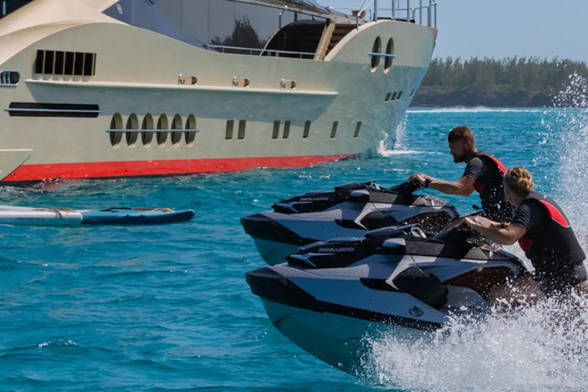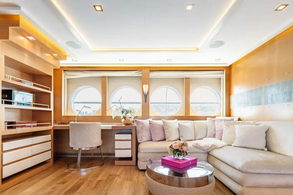 The sun deck is home to one of her two jacuzzis and there are plenty of lounges and daybeds to sunbathe and relax - or work up a sweat on the exercise equipment - as the world races by. There's another jacuzzi on the main deck aft, overlooking the large swim platform where the crew has the yachts many toys ready to go, and a huge sunpad to stretch out on after your dip.