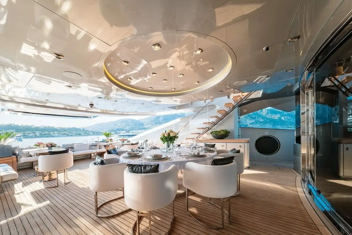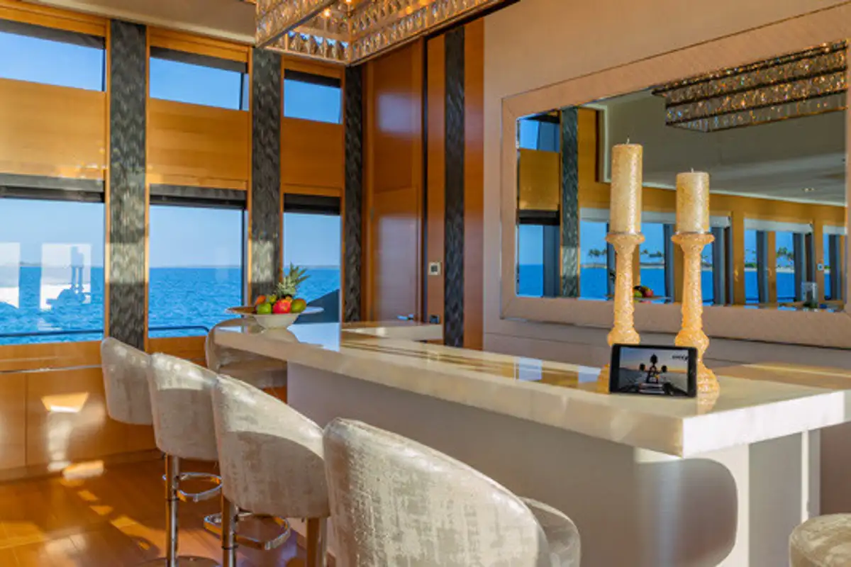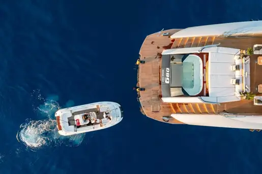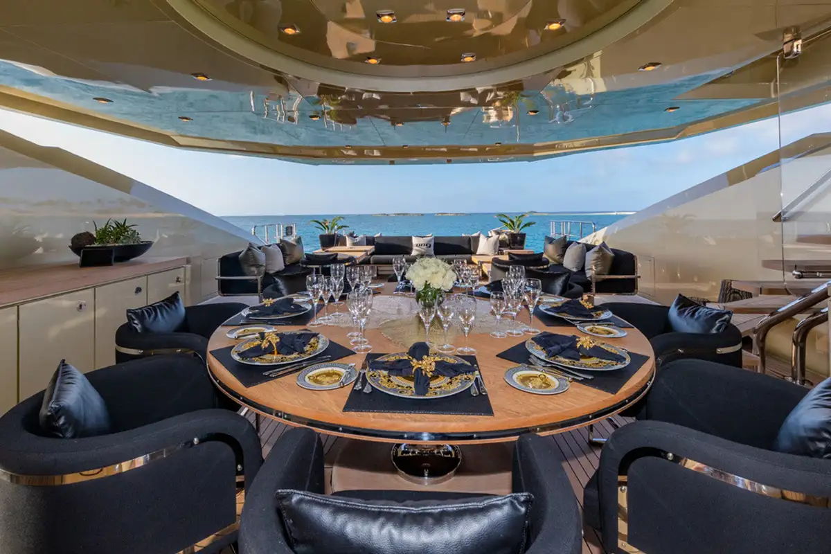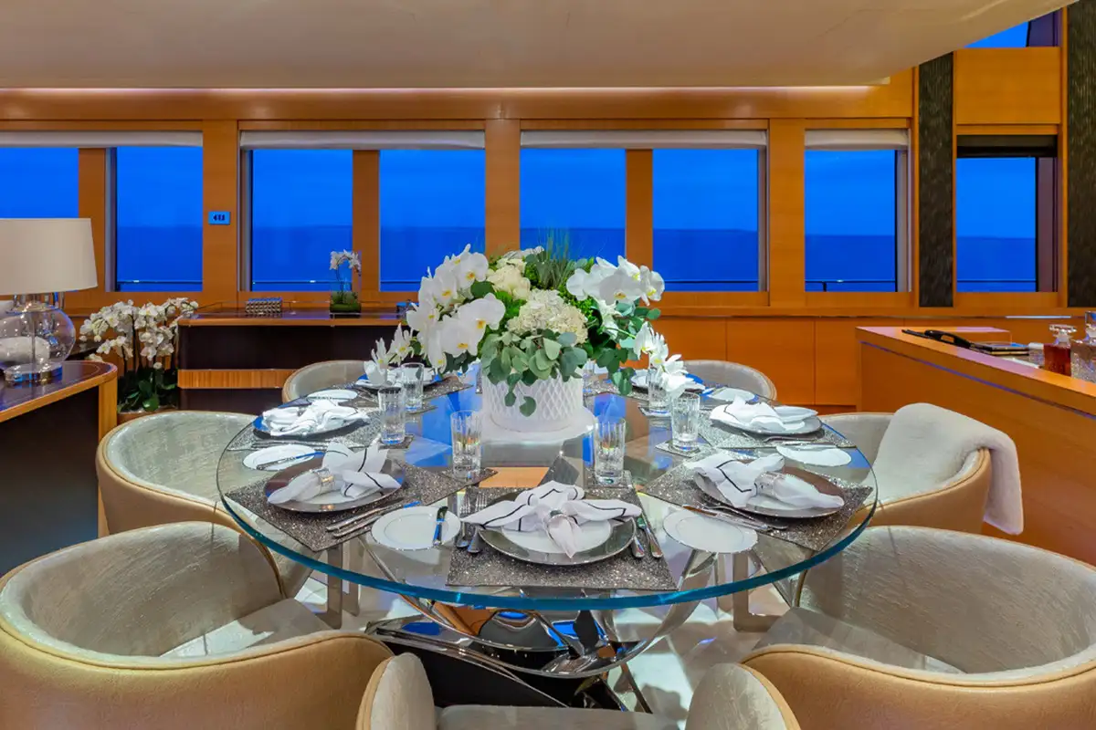 Celebrate the sunset with your favourite cocktail in the foredeck lounge before taking dinner in the formal dining room. After dinner relive the day relaxing with your guests in the spacious main saloon or head up to the sun deck where the crew has set up the yacht's outdoor cinema.