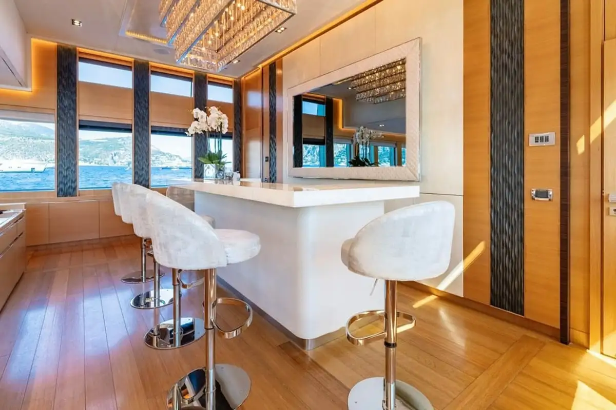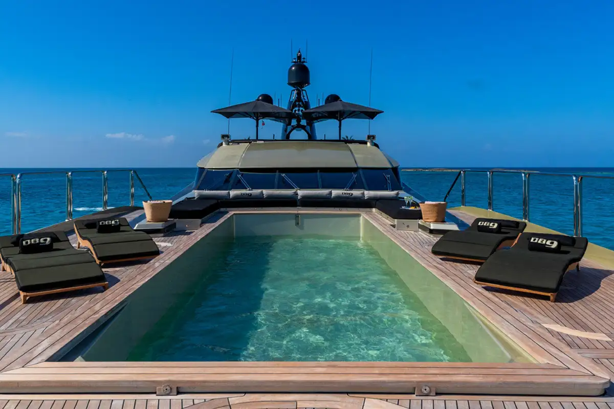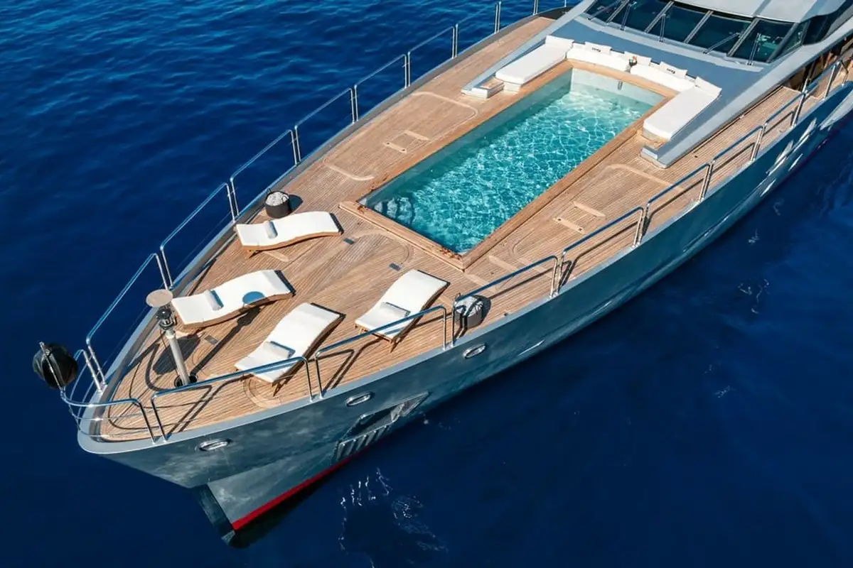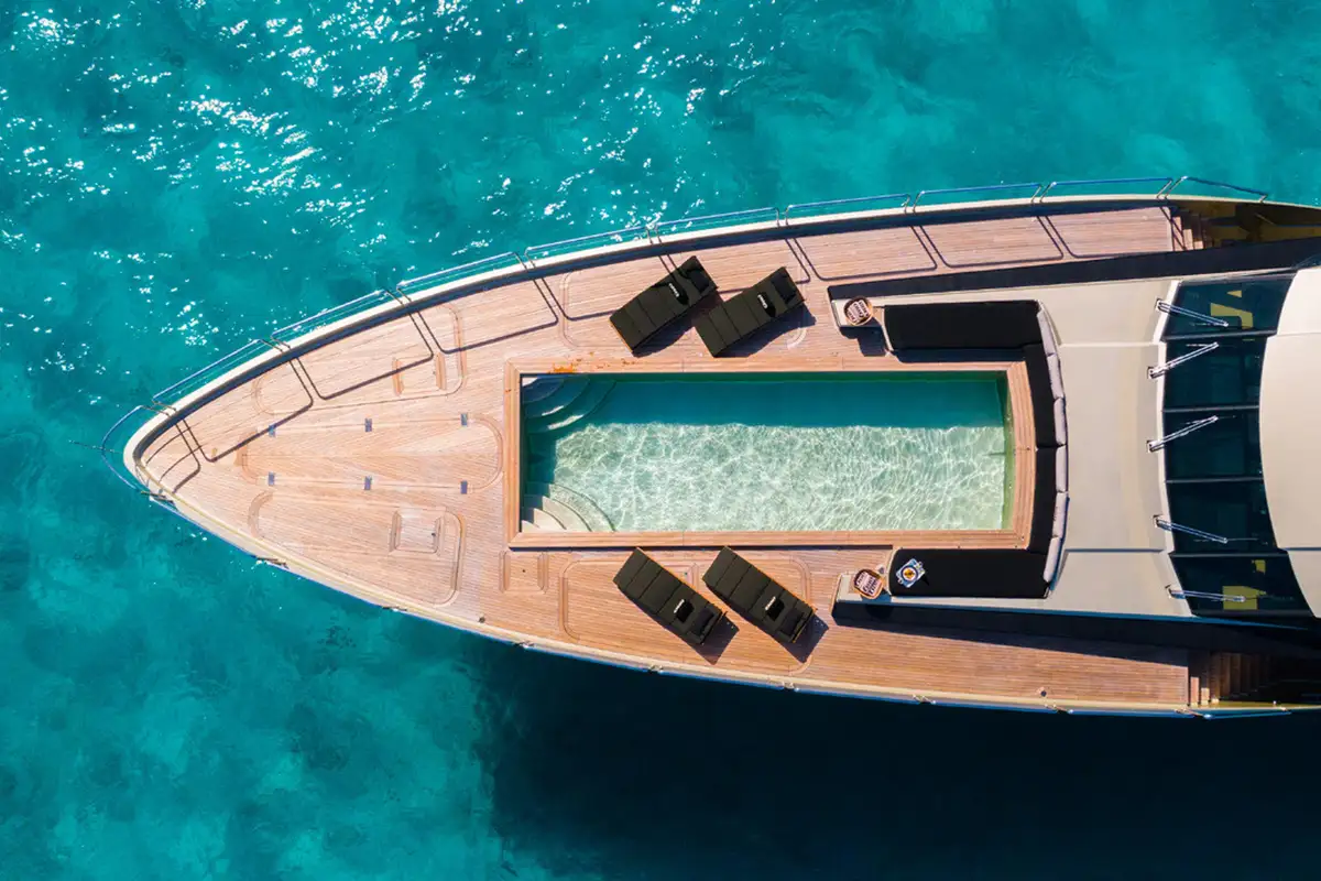 There's lounge seating next to the sun pad where you can enjoy an aperitif as the music plays while you wait for the talented chef's sumptuous gourmet experience at the open-air dining table just a few steps away. Serious swimmers will step out on the walkaround sidedecks to head for the foredeck where an inviting 8m (26ft) pool surrounded by sunloungers lays glinting under the sun.