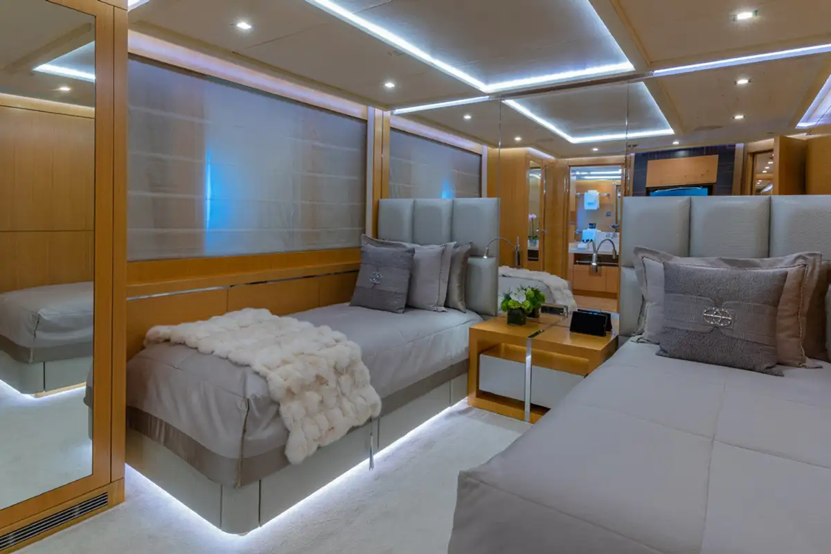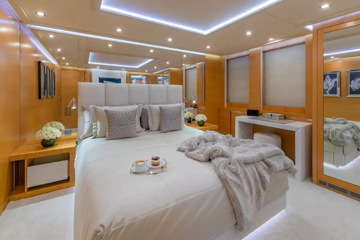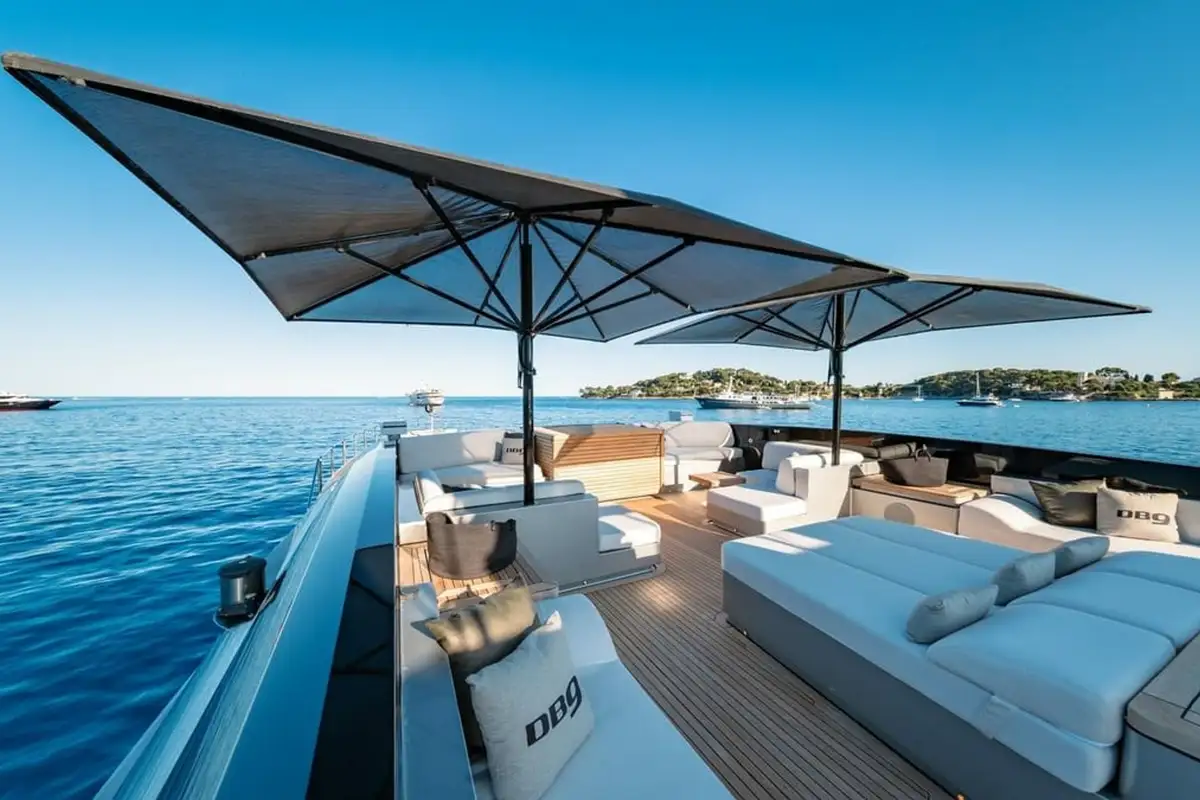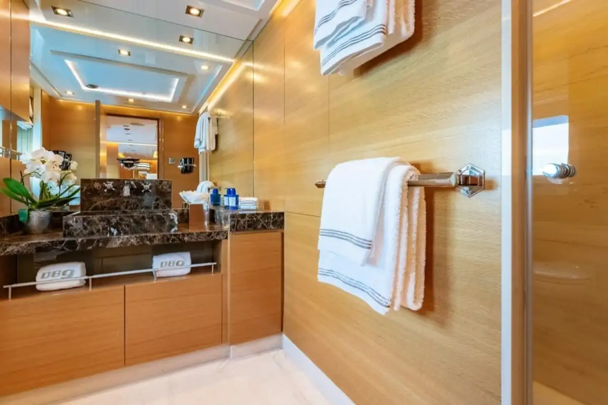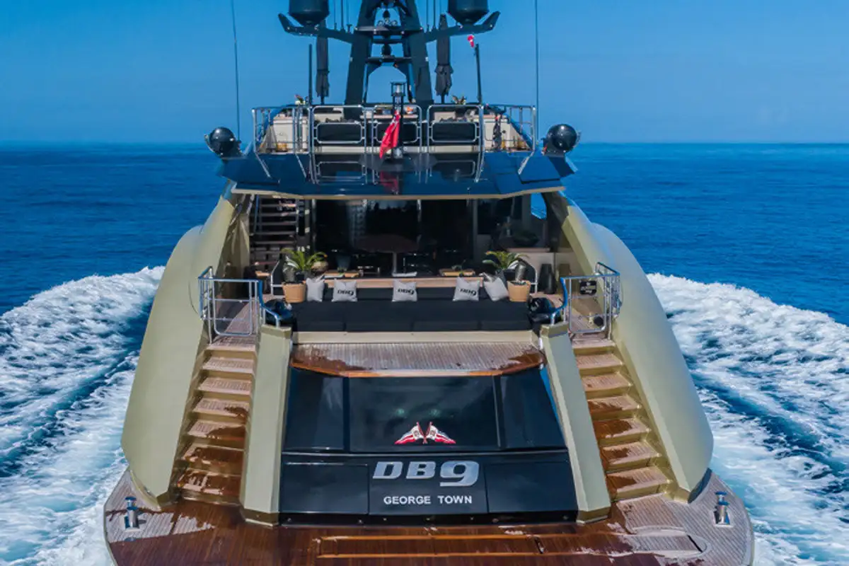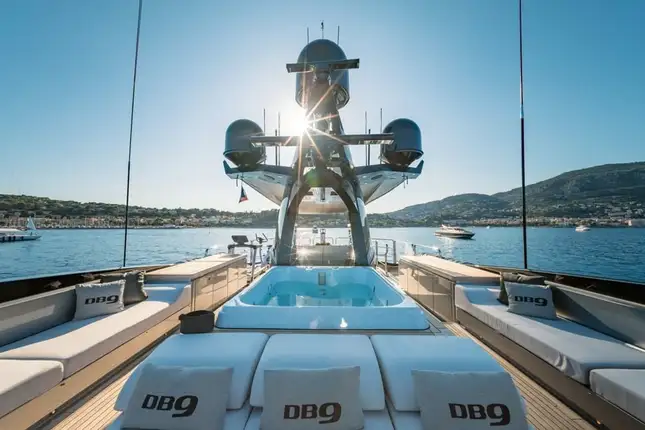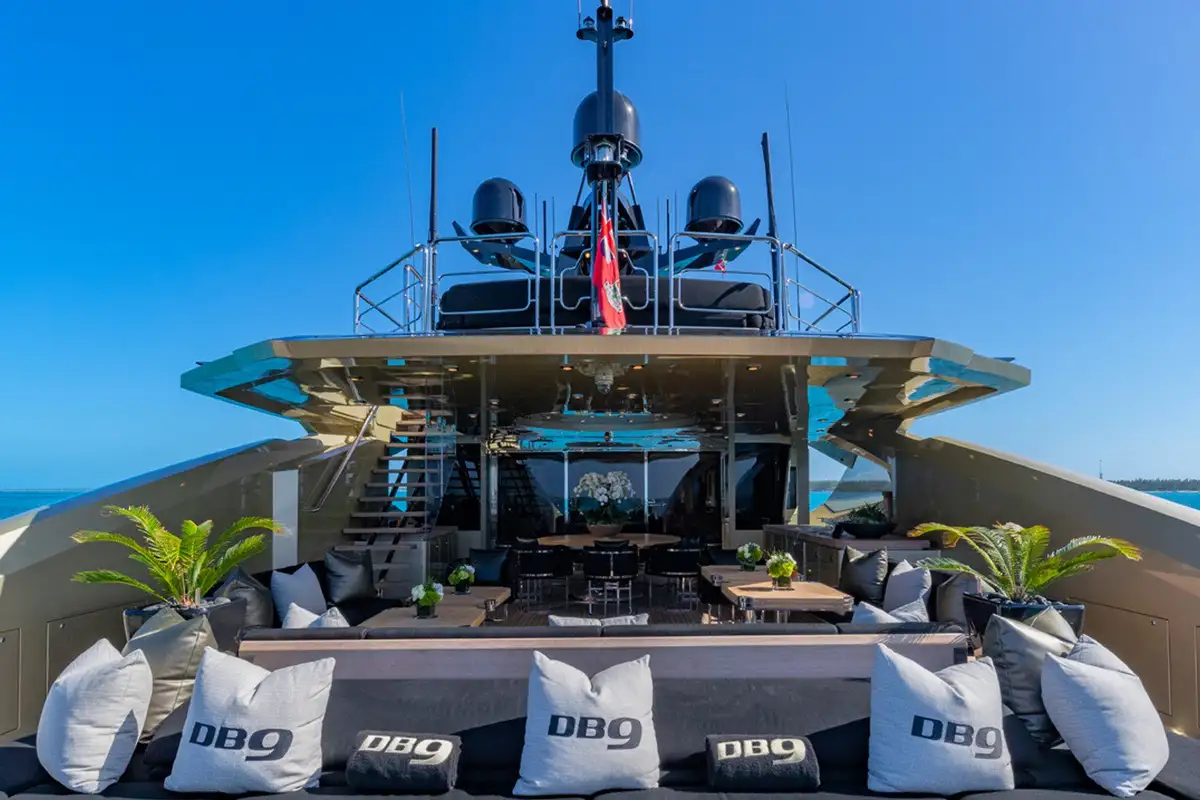 DB9 has accommodation for 12 guests across her five luxurious staterooms. Located aft on the lower deck, DB9’s full-beam master suite is accessed by a private staircase and features both a walk-in wardrobe plus a large en suite bathroom.