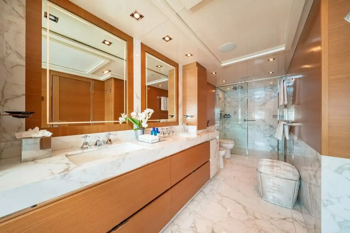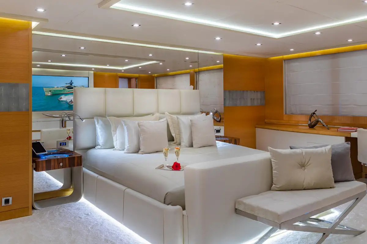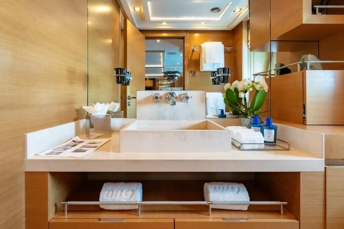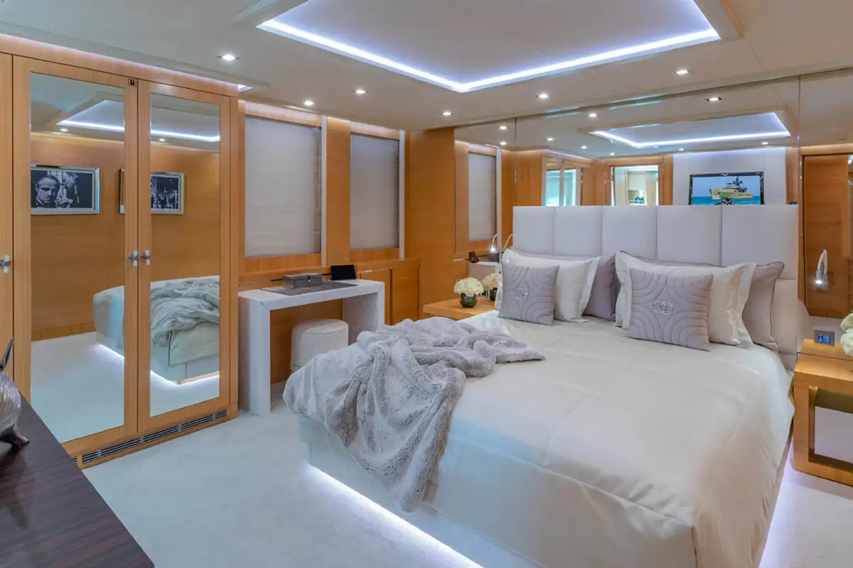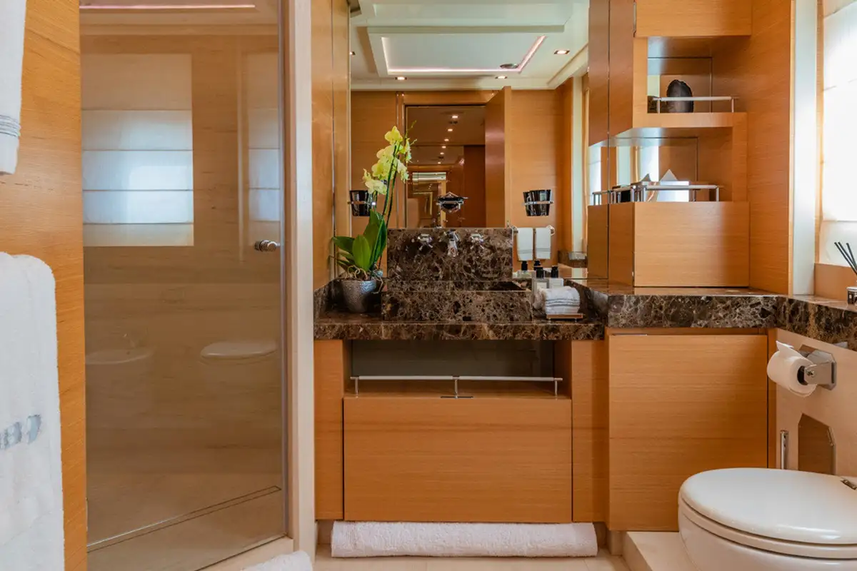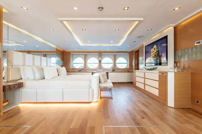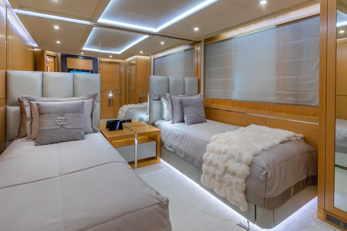 DB9 has accommodation for 12 guests across her five luxurious staterooms. Located aft on the lower deck, DB9’s full-beam master suite is accessed by a private staircase and features both a walk-in wardrobe plus a large en suite bathroom.