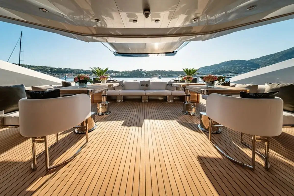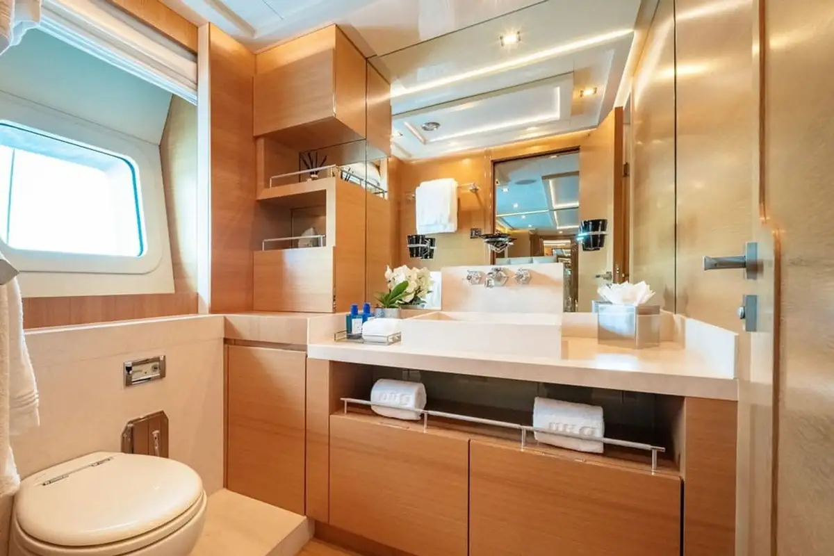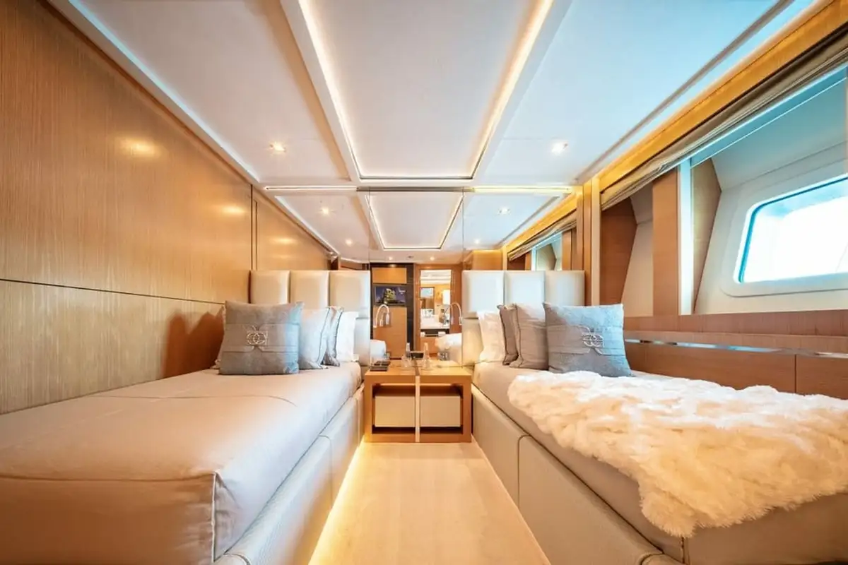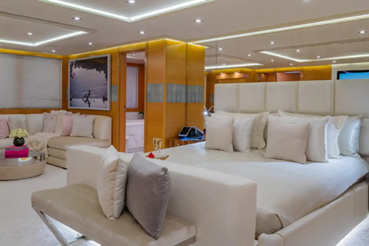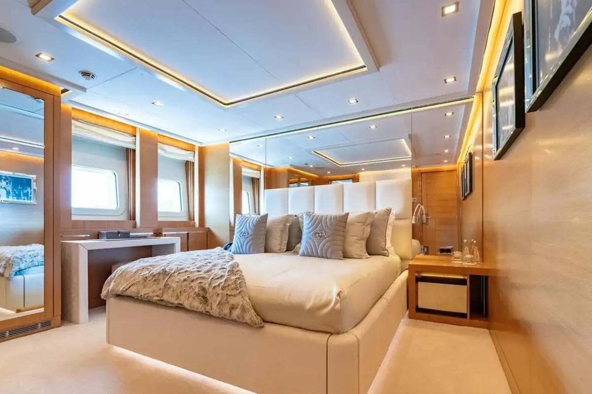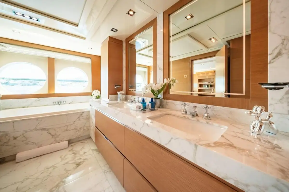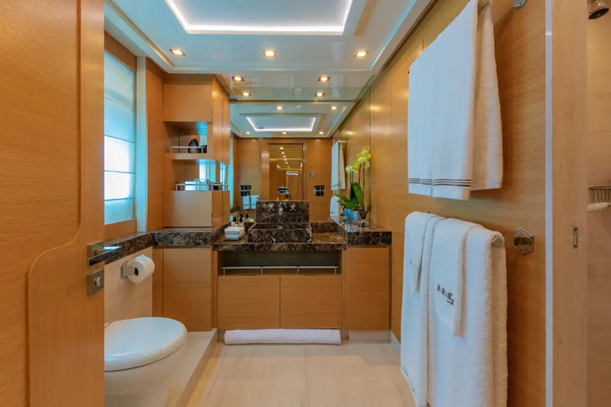 DB9 has accommodation for 12 guests across her five luxurious staterooms. Located aft on the lower deck, DB9’s full-beam master suite is accessed by a private staircase and features both a walk-in wardrobe plus a large en suite bathroom.