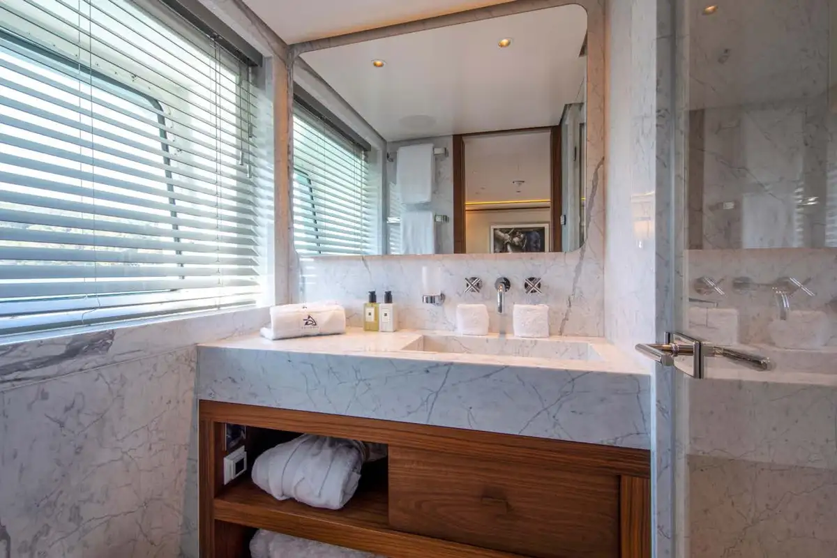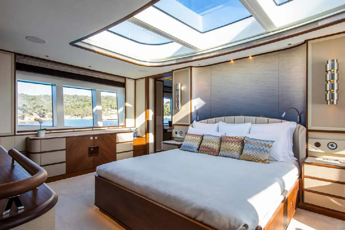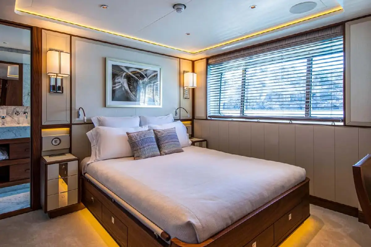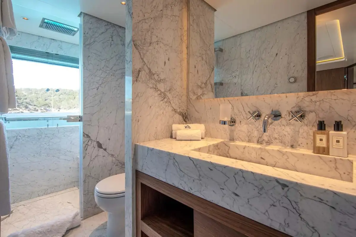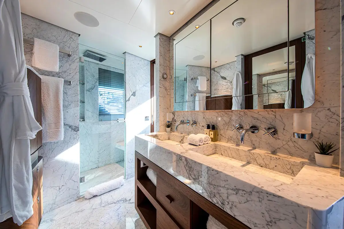 As the blinds over your king-sized berth open, you look to an azure blue sky greeting you through DELTA ONE’s large overbed skylights. It’s another morning on board this fantastic yacht. What will you do today? From the moment you and your guest caught sight of this imposingly beautiful yacht everyone has been besotted by her and all she has to offer.