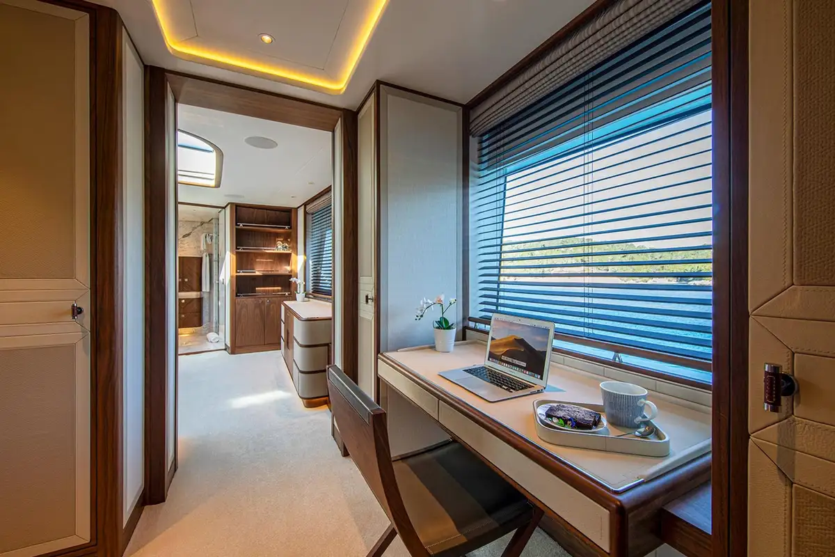 Even now, lying in bed, you’re still wowed by your full-beam suite. With your private office behind and a cosy lounge area to port, you notice new details like the cylindrical stainless-steel lights, the faultless joinery, and the attention to detail. Soon it will be time to freshen up in your majestic full-beam en suite marble-lined bathroom. And then to breakfast. You idly wonder if there’s time for a crafty spin on the exercise bike or some gym time in the beach club area before breakfast – maybe tomorrow. The lure of freshly brewed coffee and breakfast in the morning light it too great.
