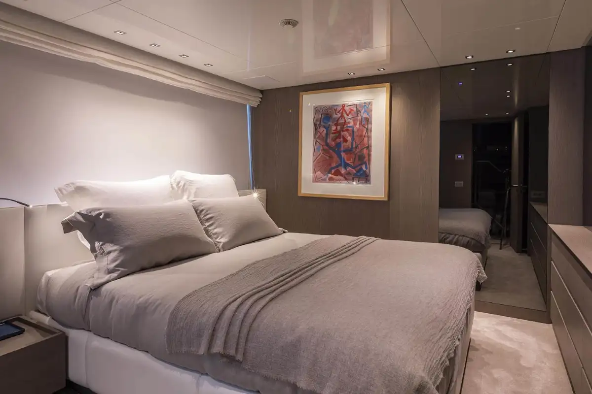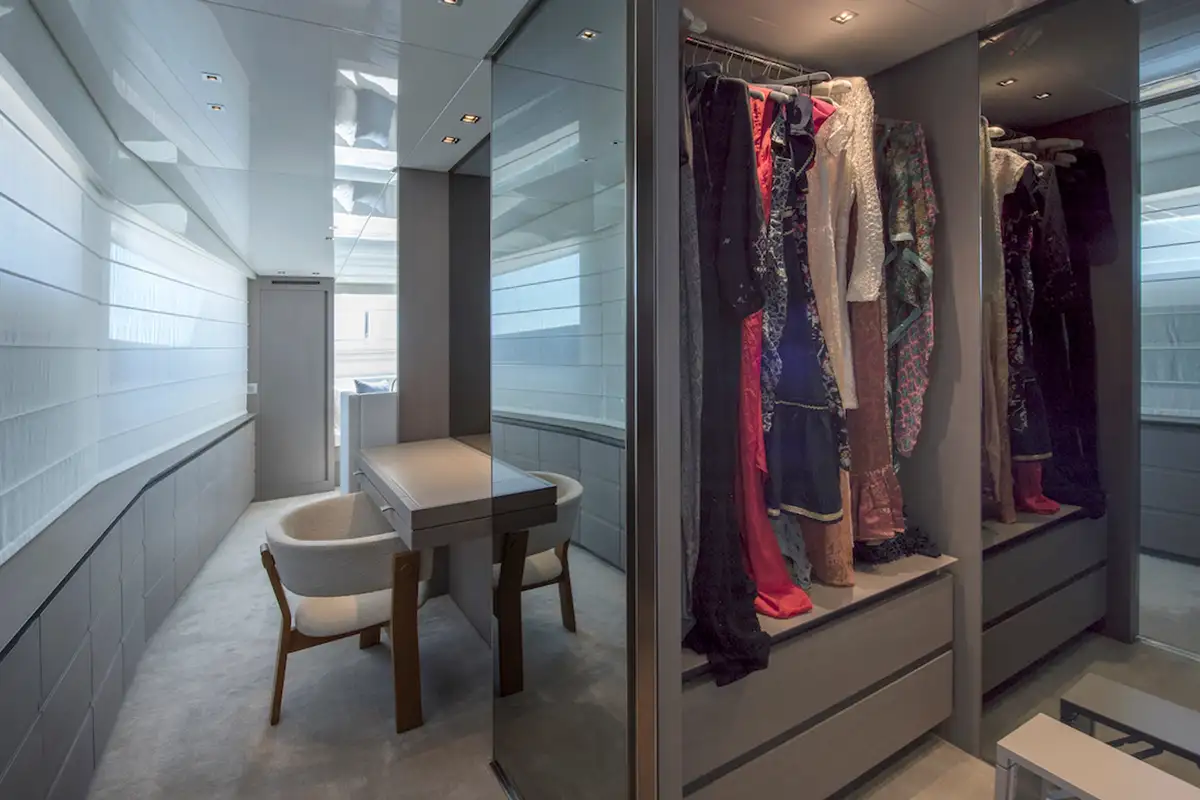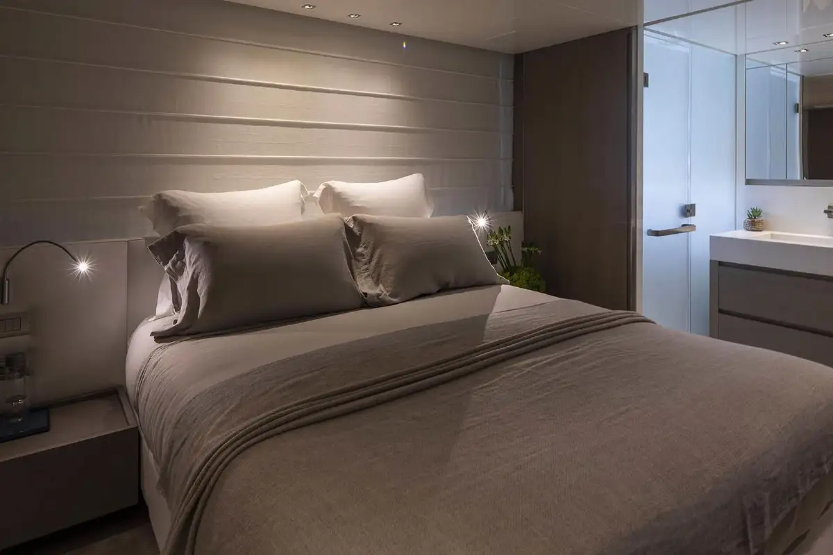 The Master suite is positioned on the main deck forward and there is a walk-in wardrobe, a writing desk with forward windows and skylights for an abundance of natural light. A daybed is fitted beneath the forward windowsill, where a widescreen TV is concealed when not in use. The bathroom behind the bedroom is fitted with his-and-hers sinks and a shower. The VIP staterooms both have a deck/vanity along with a large wardrobe.