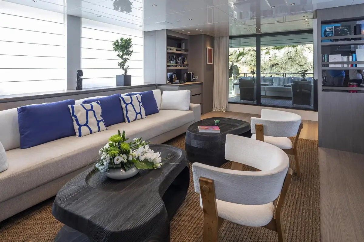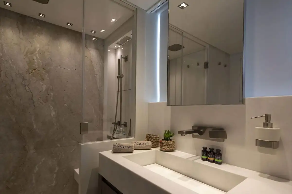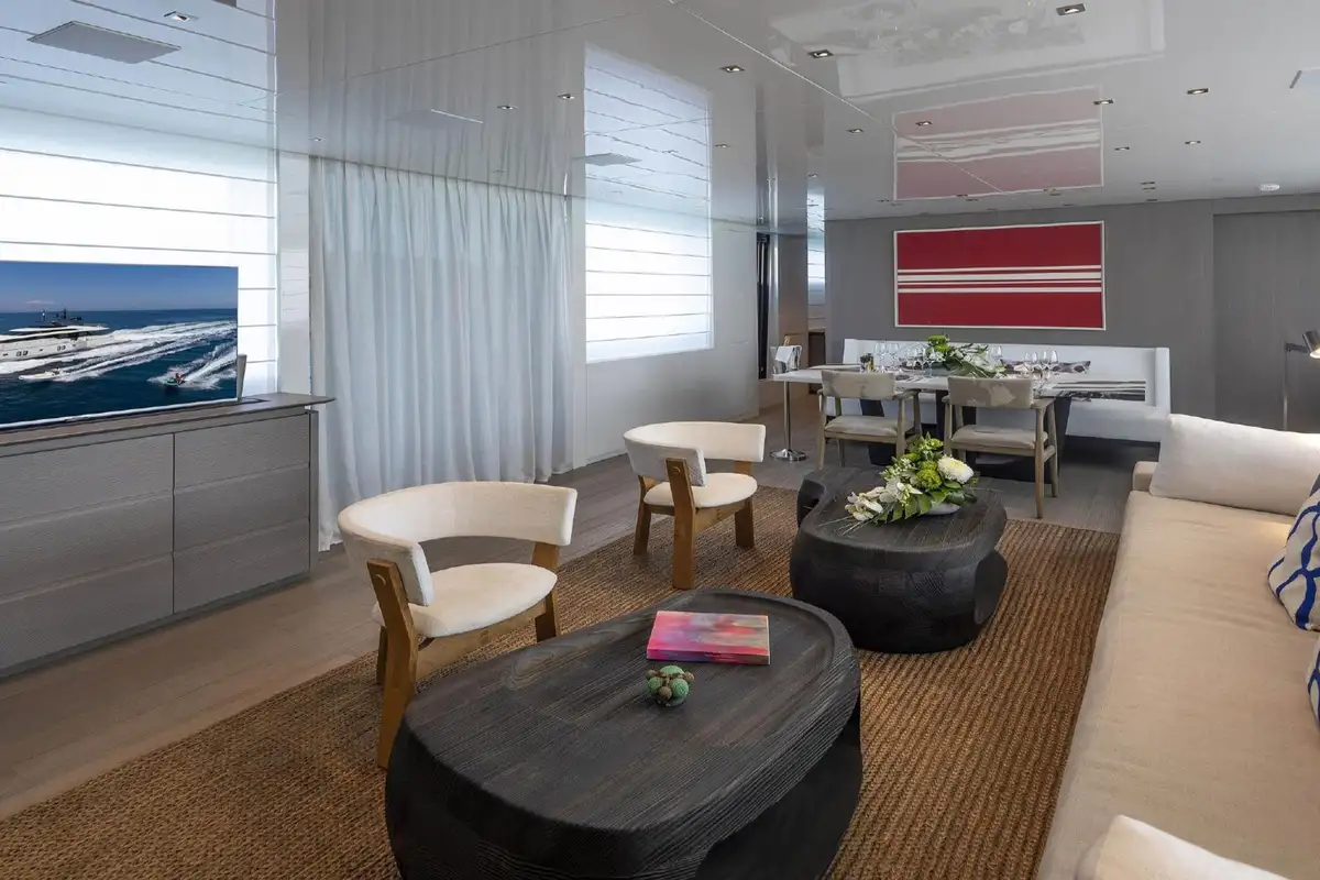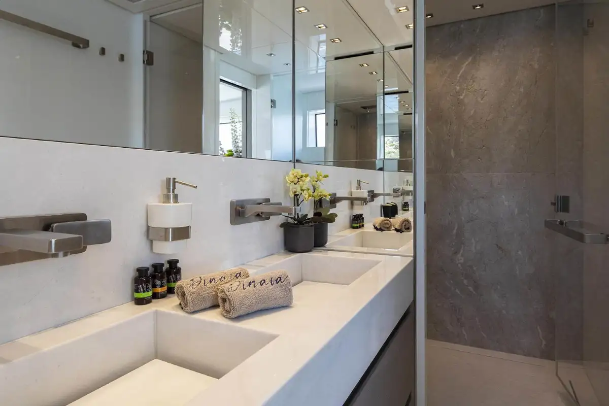 The Master suite is positioned on the main deck forward and there is a walk-in wardrobe, a writing desk with forward windows and skylights for an abundance of natural light. A daybed is fitted beneath the forward windowsill, where a widescreen TV is concealed when not in use. The bathroom behind the bedroom is fitted with his-and-hers sinks and a shower. The VIP staterooms both have a deck/vanity along with a large wardrobe.