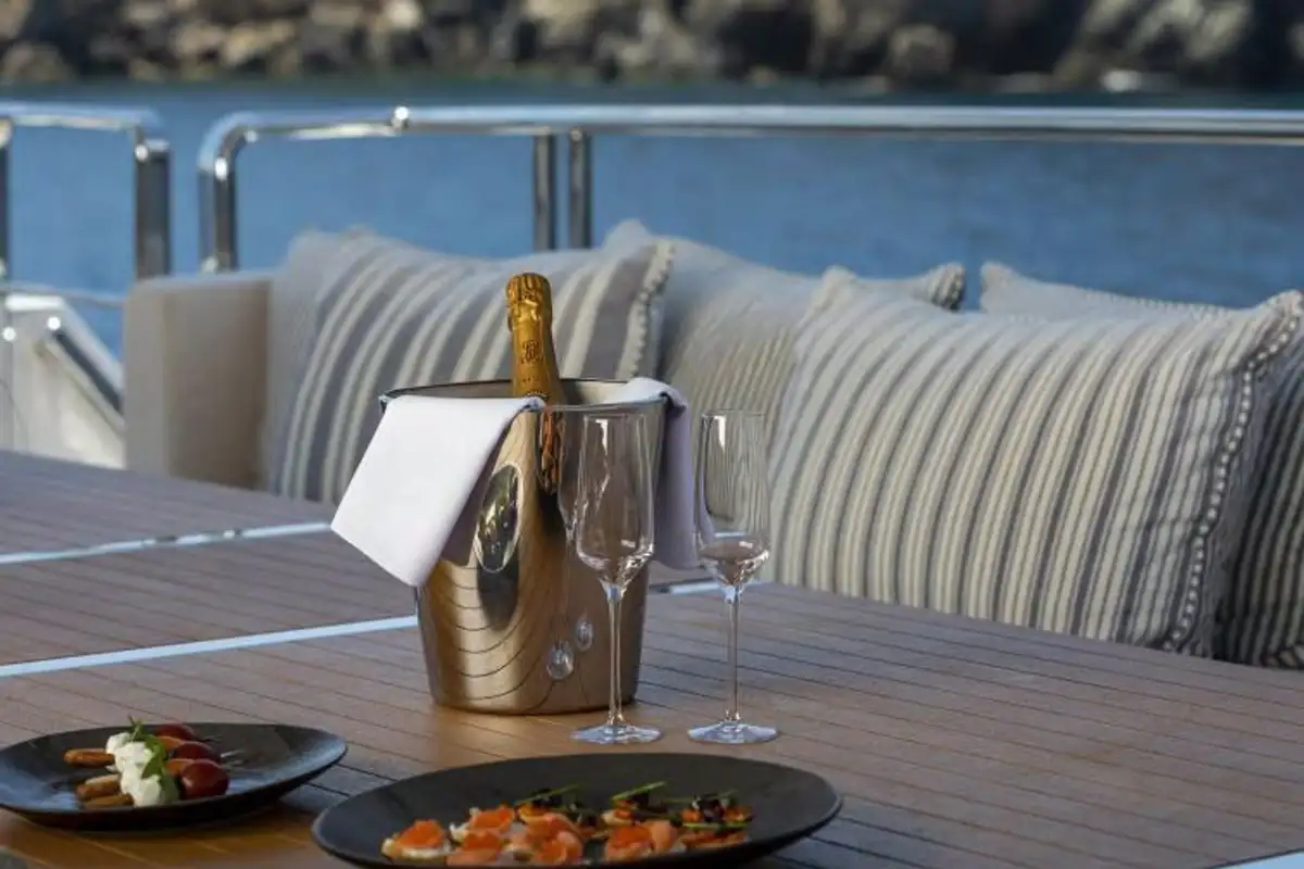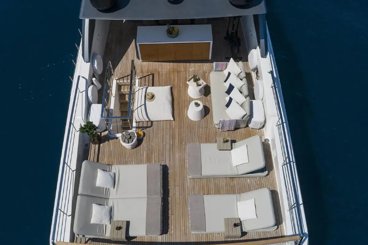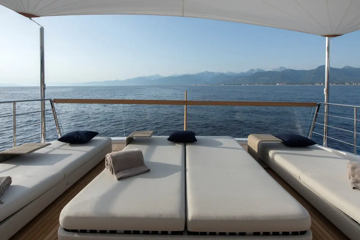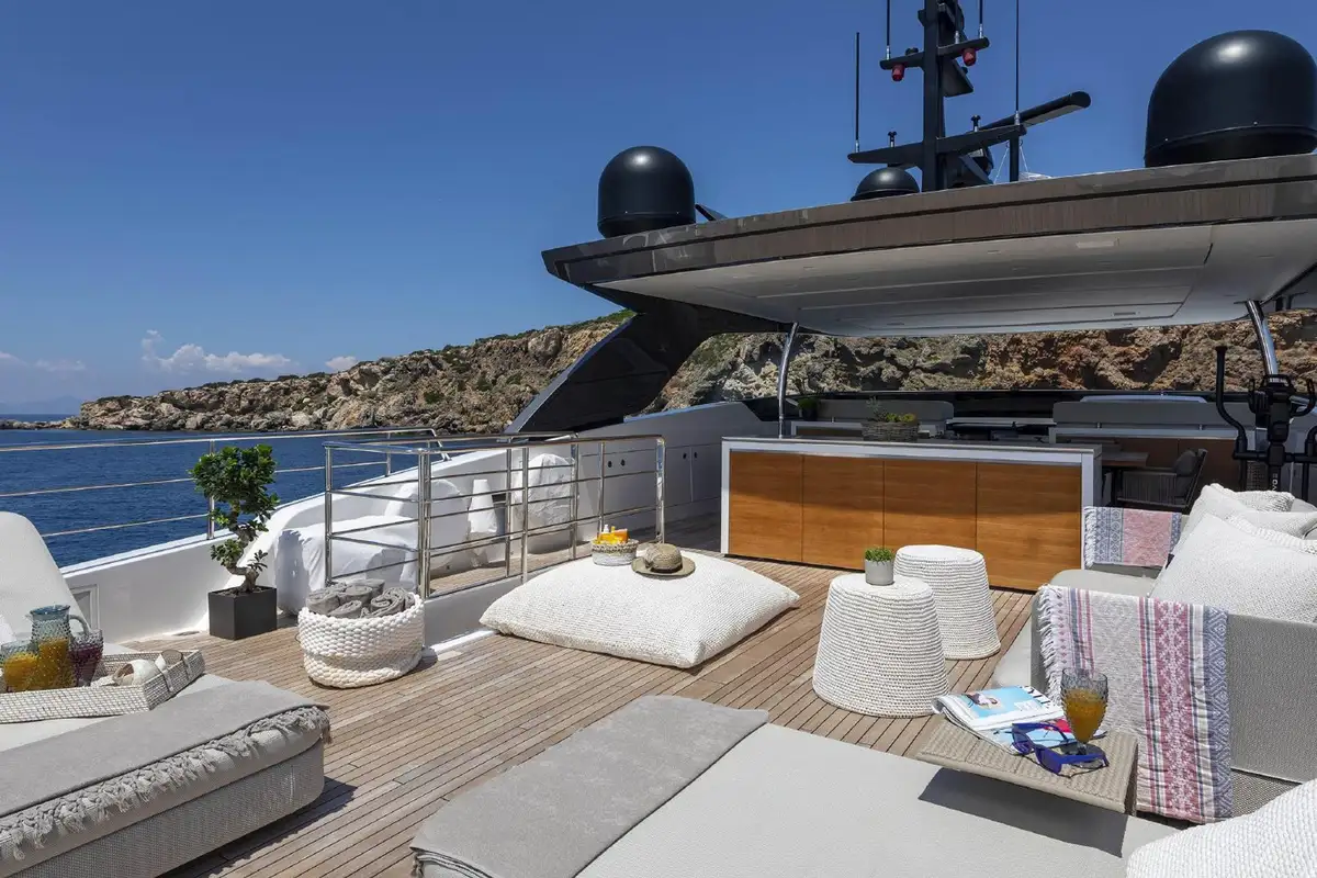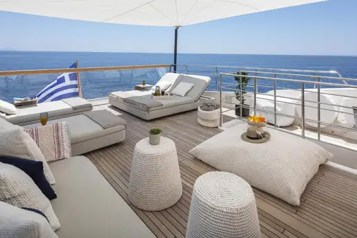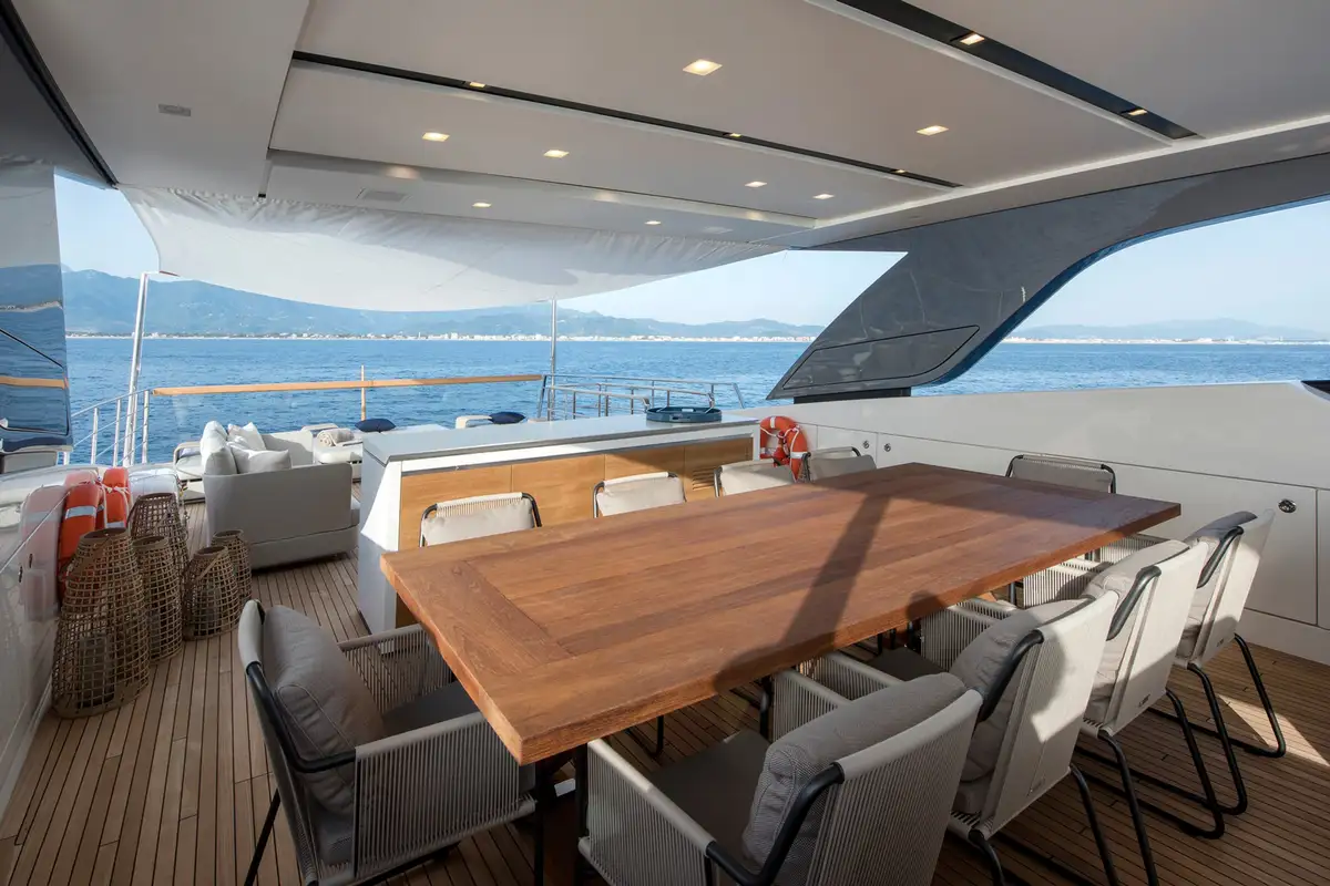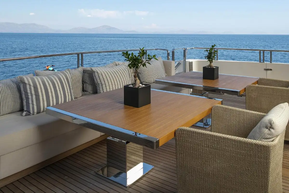 A port staircase leads to the upper deck, where a double sunpad can be found to the stern with a sofa/sunpad to port and starboard. A canvas shade can be placed above which also covers the sofa and cushions amidships. A wet bar and alfresco dining table to seat 10 are placed beneath the hardtop.