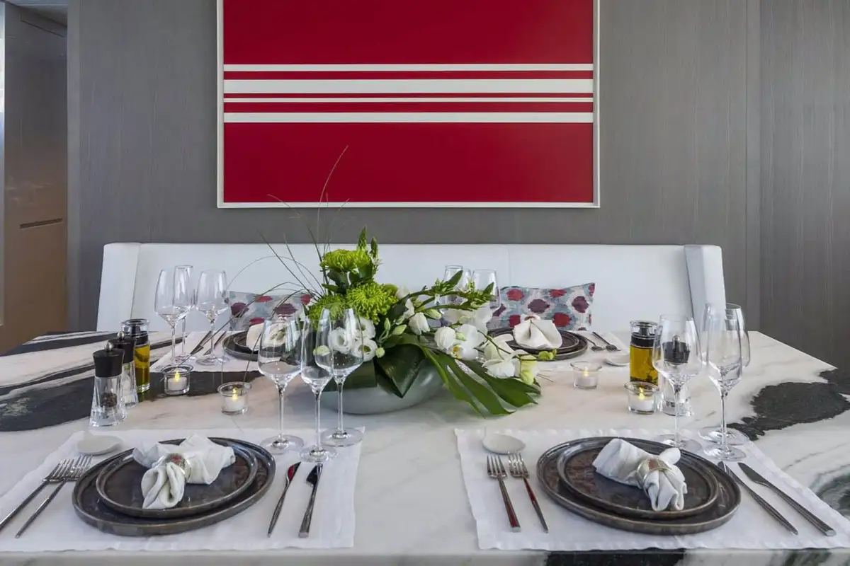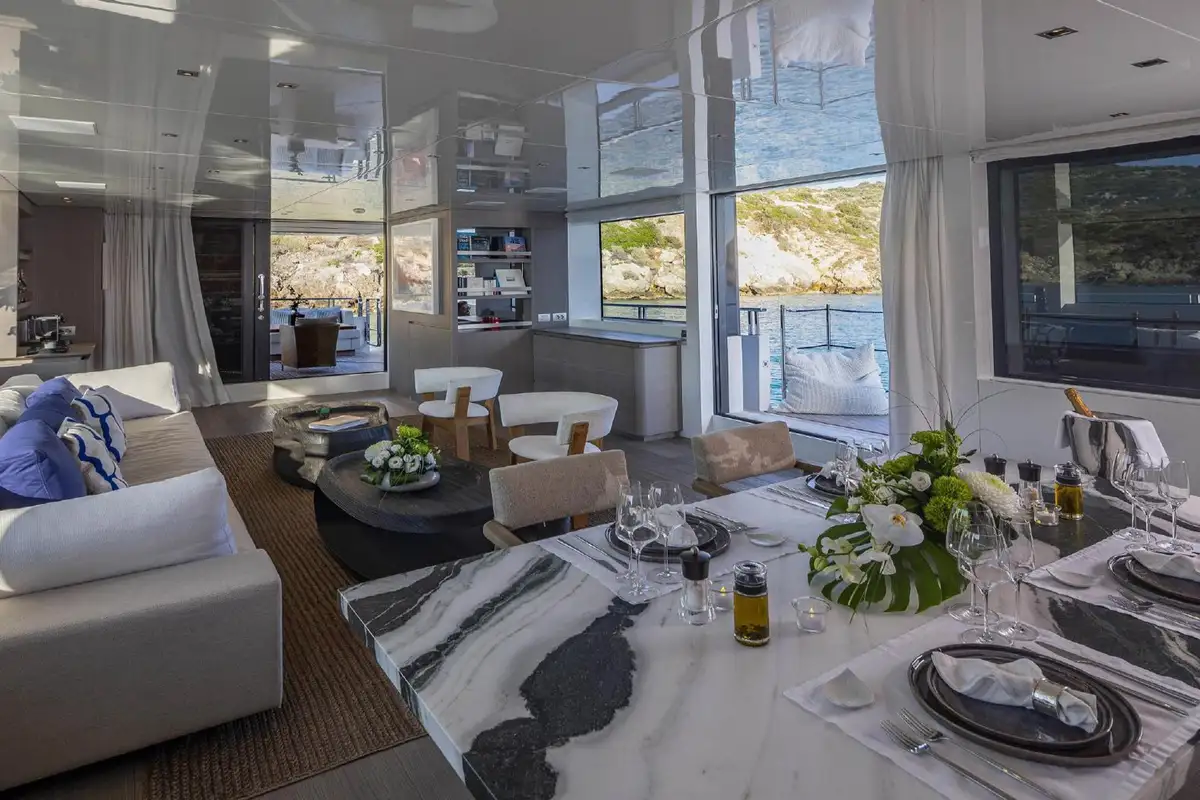 The main foyer and galley is placed amidships with the formal dining area immediately behind, providing a minimalist environment for the group to enjoy a meal in elegant surroundings.