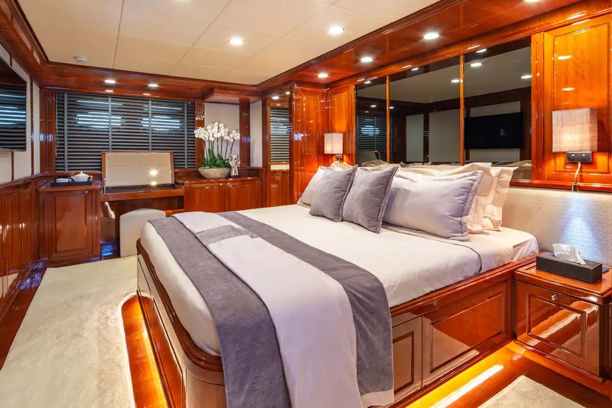 The recently refurbished saloon is a magnificent space: welcoming and stylish. A long seating offers space to relax with friends and loved ones. Opposite the plush sofa, there’s a rise-up TV, so you won’t miss sports or the latest movies. Ahead of the lounge is the formal dining area. It is here (and the al fresco dining area in the cockpit) where DIVINE’s professional chef can excite your senses with their talents. Every meal is served by DIVINE’s highly skilled and professional crew, for whom nothing is too much trouble.