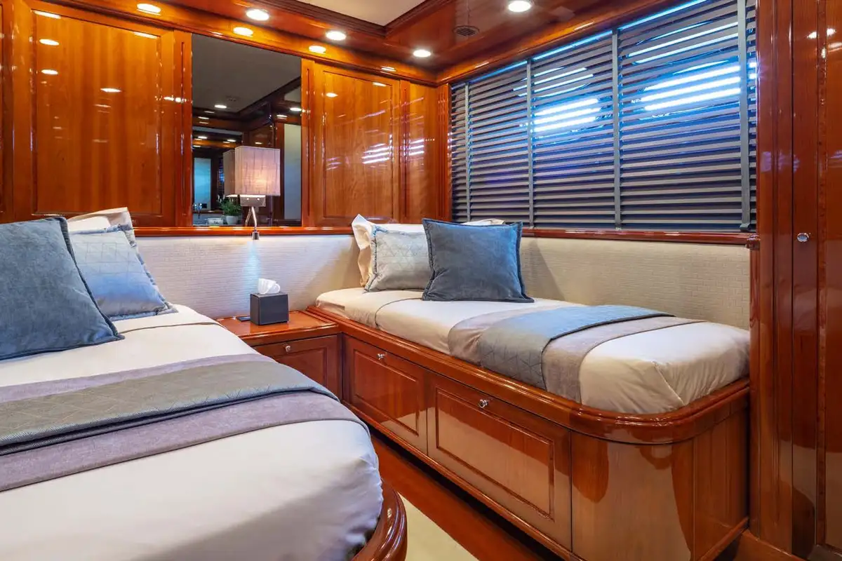 The wonderful master suite is located on the lower deck. Here you’ll find a beautiful full-beam suite with resplendent high-gloss wood panelling and light furnishings. To starboard is a desk area and the stunning en suite bathroom, to port is sofa seating and dressing room. Ahead of this beautiful suite, there are two spacious twin-berth suites each with en suite facilities and an additional pullman berth. Forward, is the full-beam double VIP suite. Similar to the master suite, it has sofa seating, a desk, and an en suite bathroom. A third spacious double suite is located on the main deck, its 180-degree panoramic windows allow light to fill this lovely space.