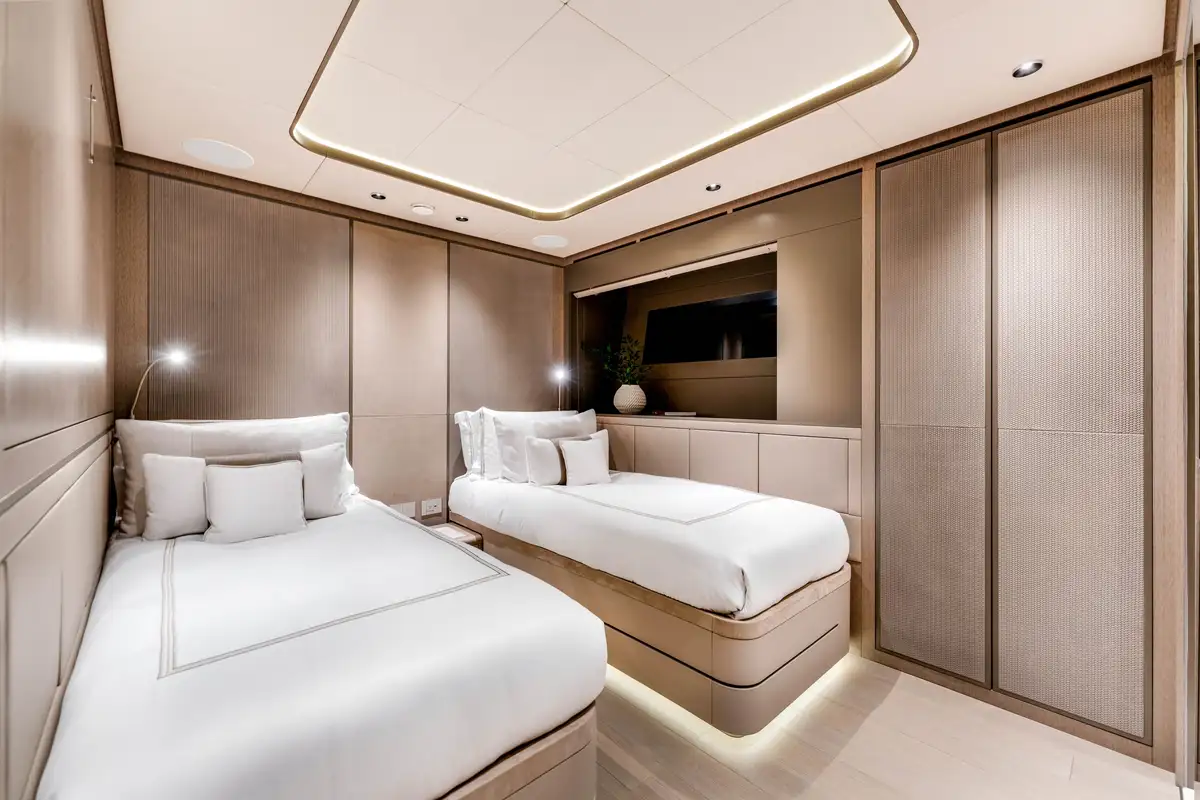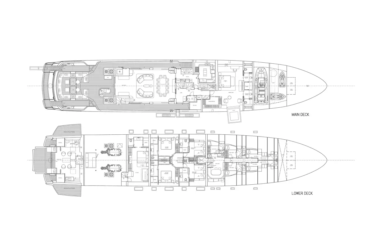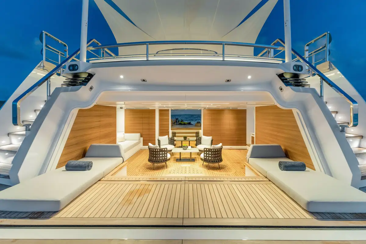 The beach club on DOKINHA is a true retreat, offering fold-out terraces on three sides that connect guests directly to the water. With teak wall panelling, built-in towel rails, and comfortable loose seating, this space is ideal for lounging, diving into water sports, or simply enjoying the close connection to the ocean. Zero-speed stabilisers guarantee a smooth and comfortable experience whether at anchor or cruising. A towed tender is also available to explore nearby destinations with ease.