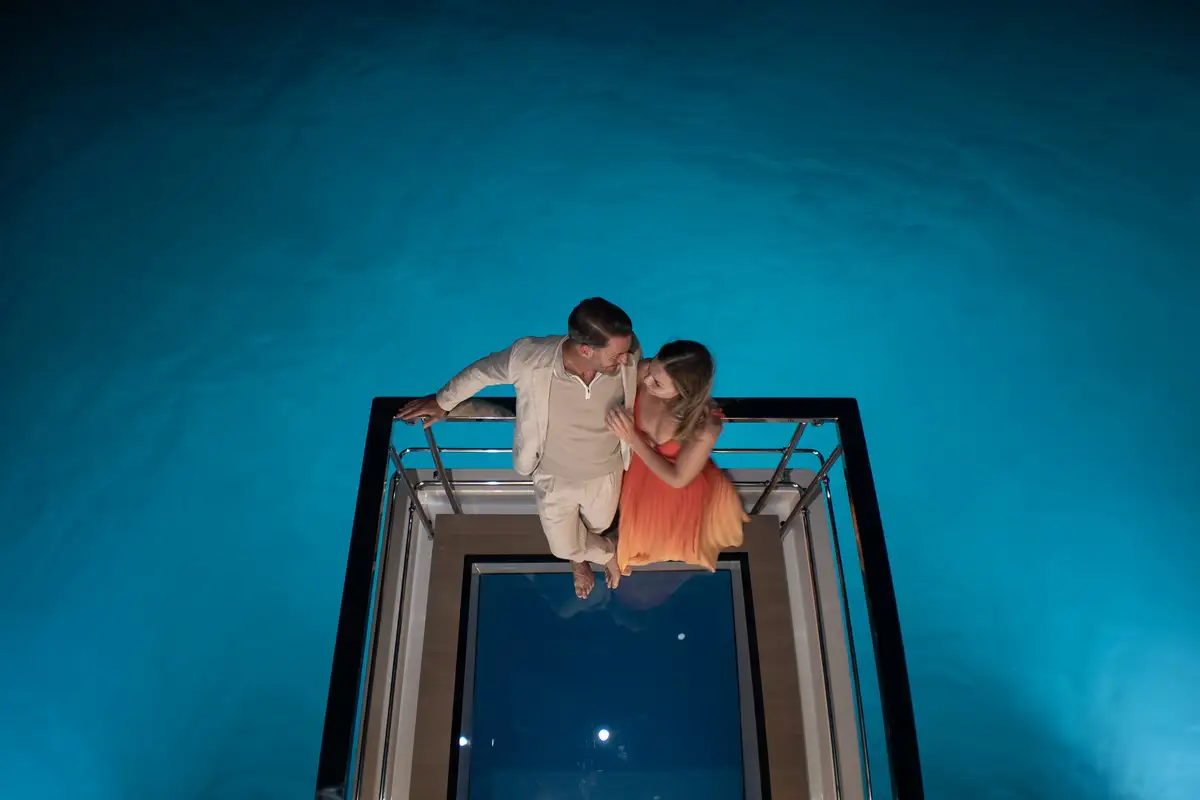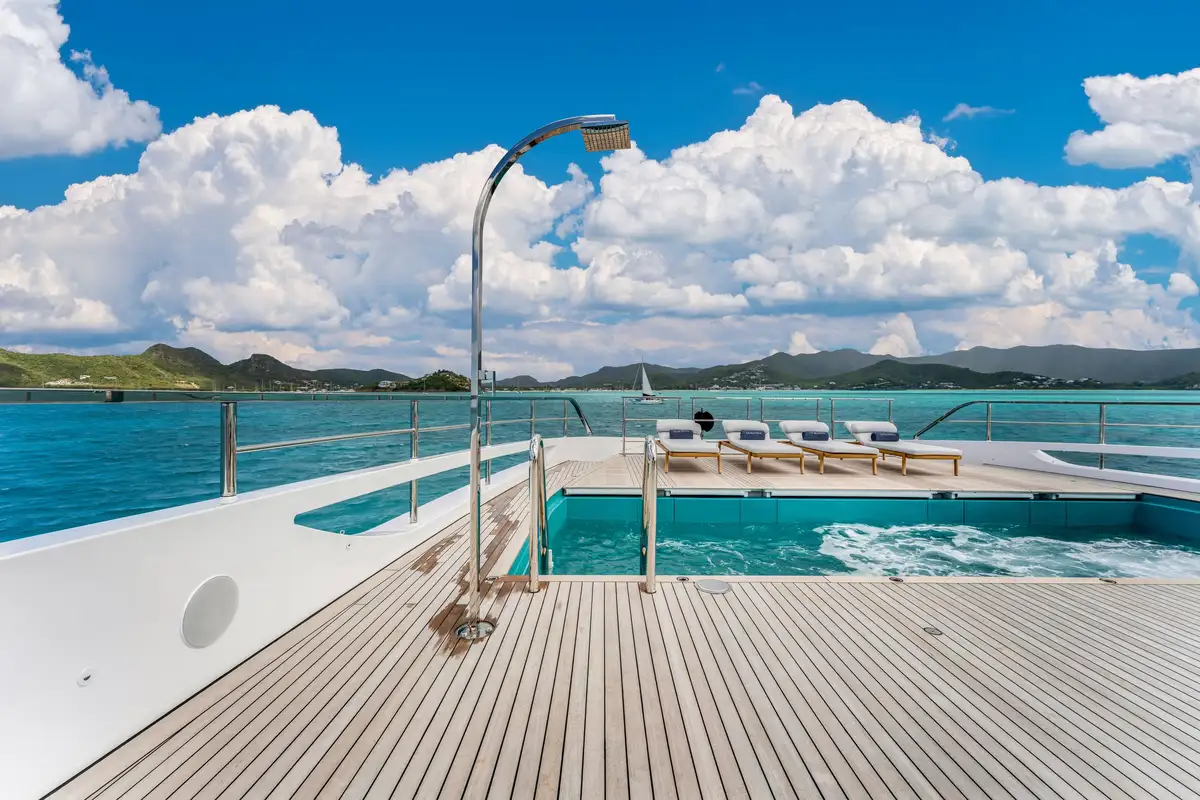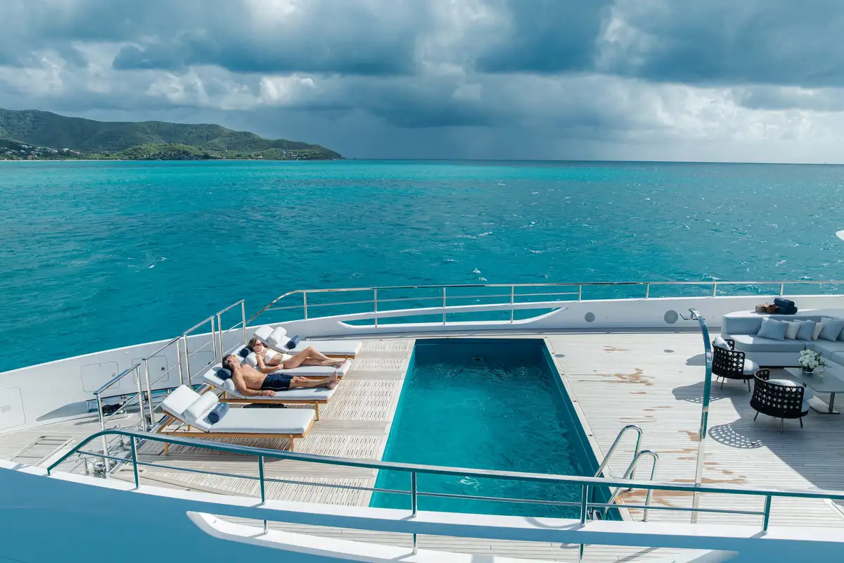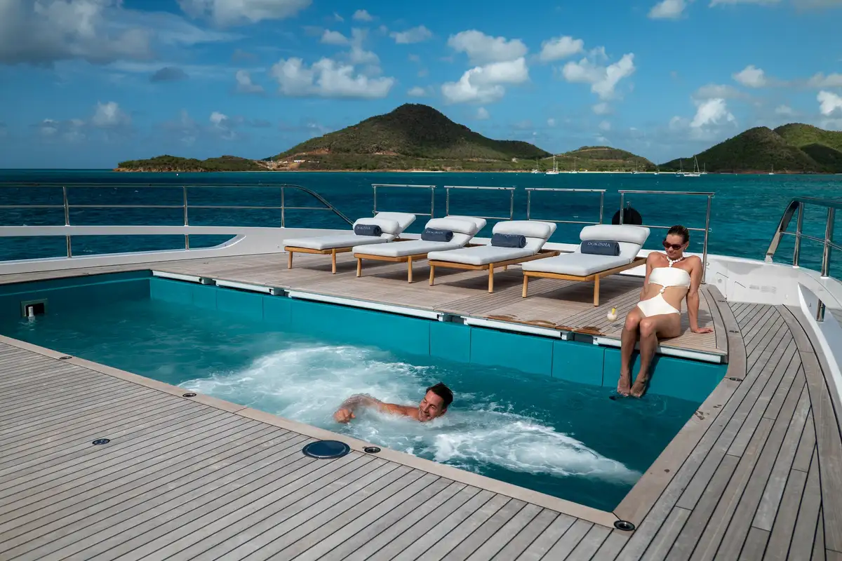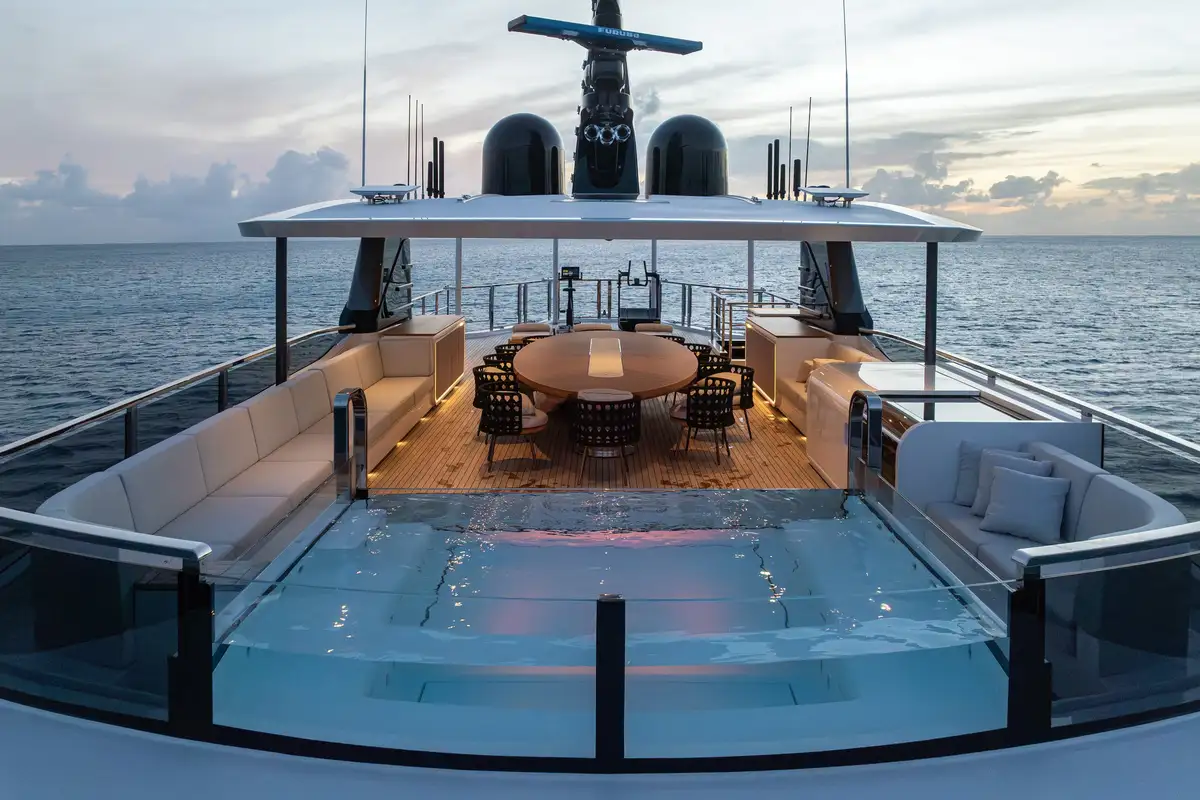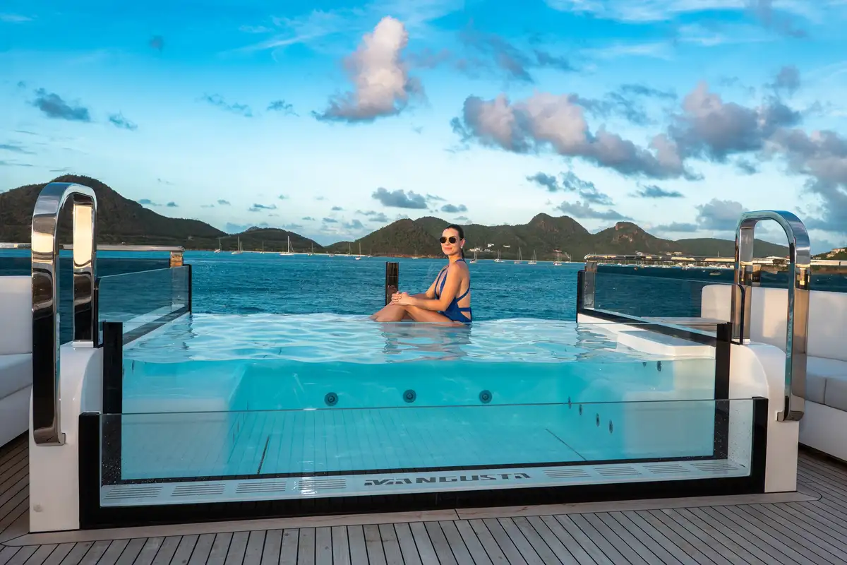 The foredeck features the largest infinity pool ever created by Mangusta, offering semi-submerged sunbeds. For those seeking more excitement, the sun deck is a vibrant space for entertainment, complete with a jacuzzi, an al fresco dining area, and workout equipment.
