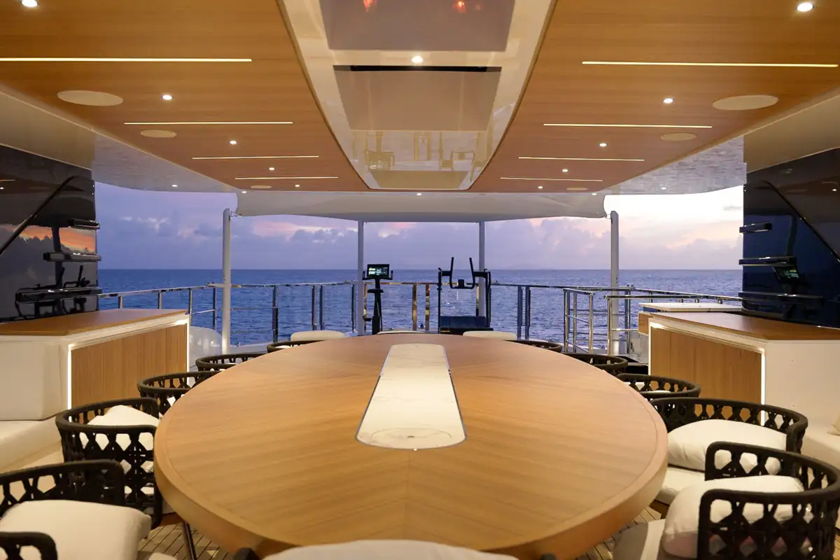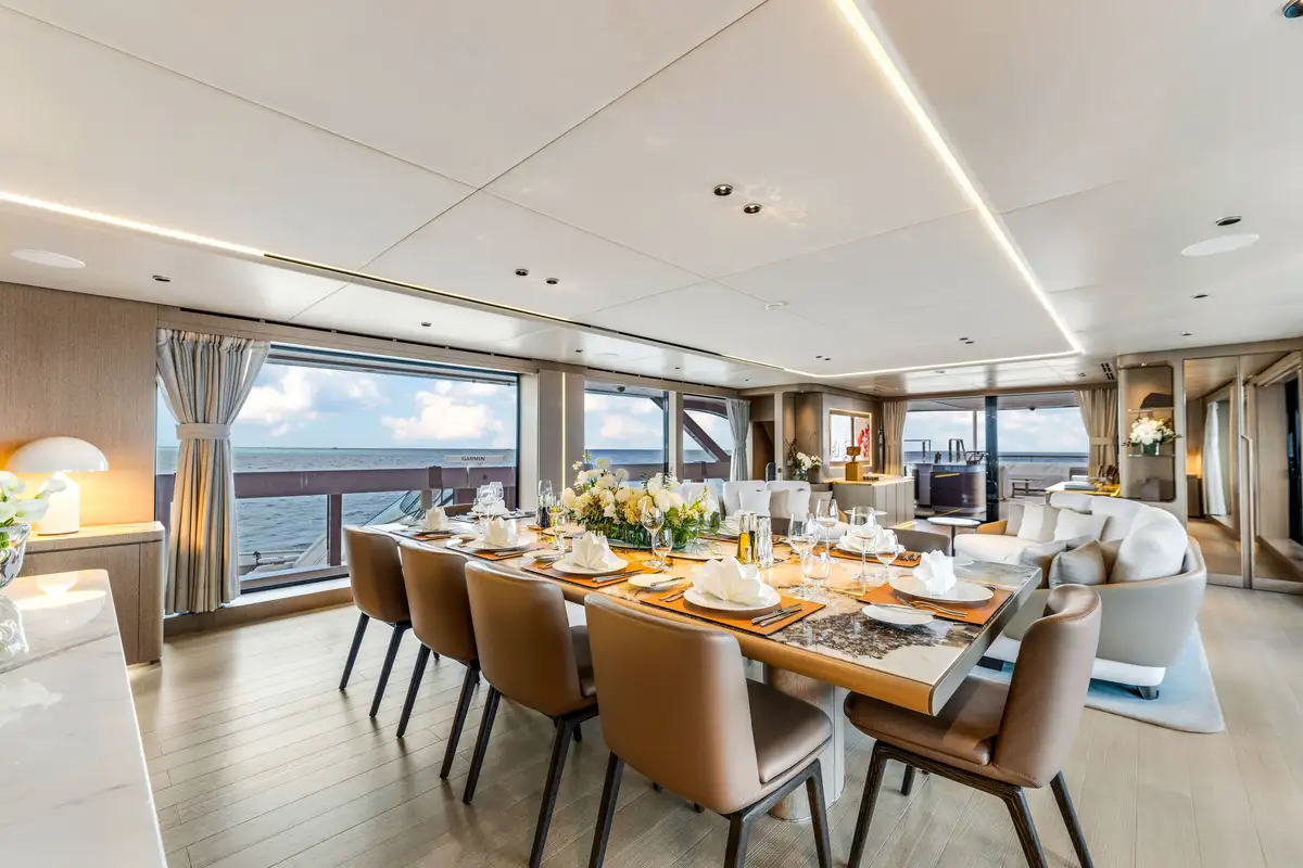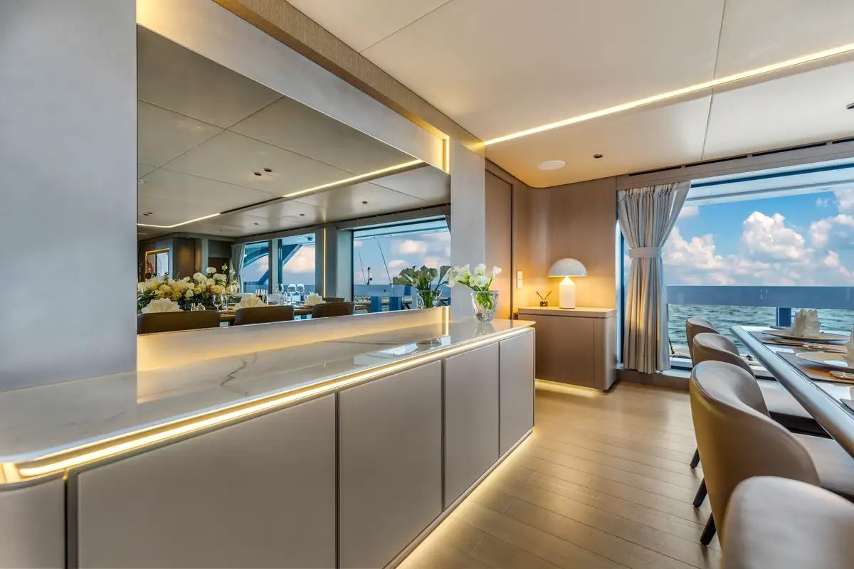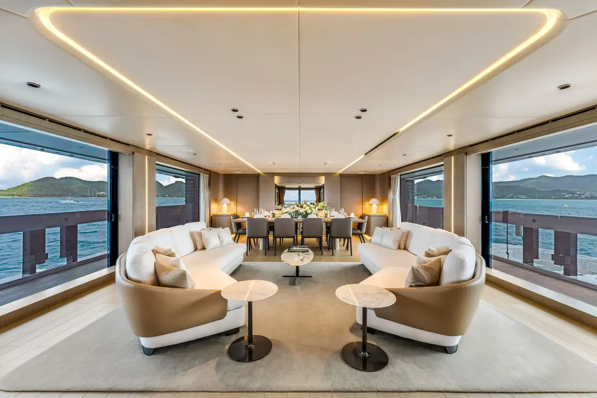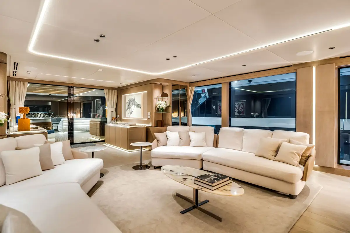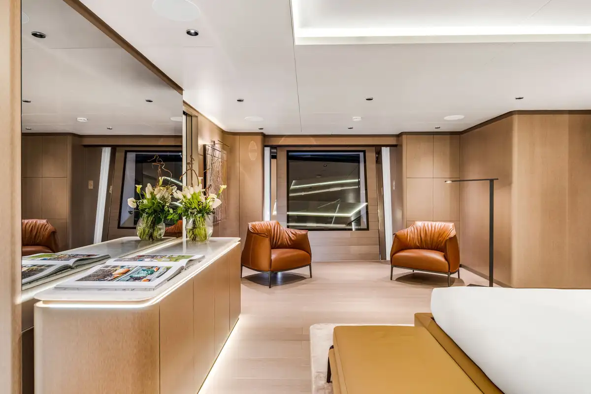 The yacht’s expansive interiors are bathed in natural light, with floor-to-ceiling windows providing stunning views. The seamless flow between indoor and outdoor spaces gives a feeling of openness throughout the yacht.
