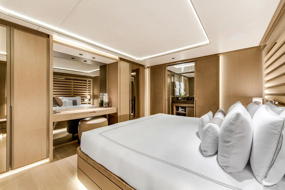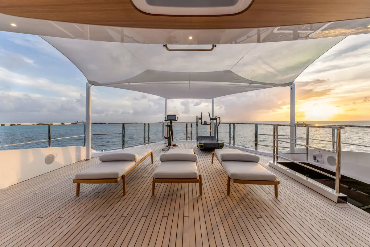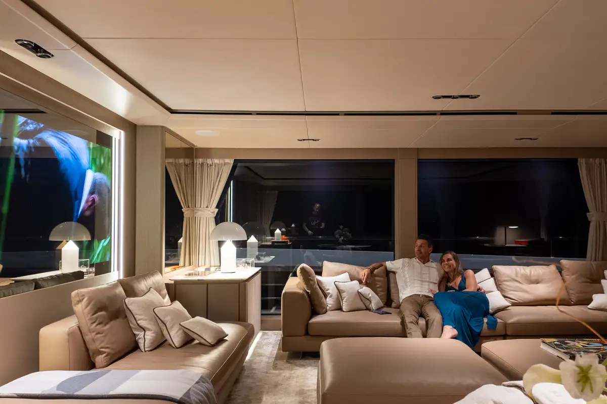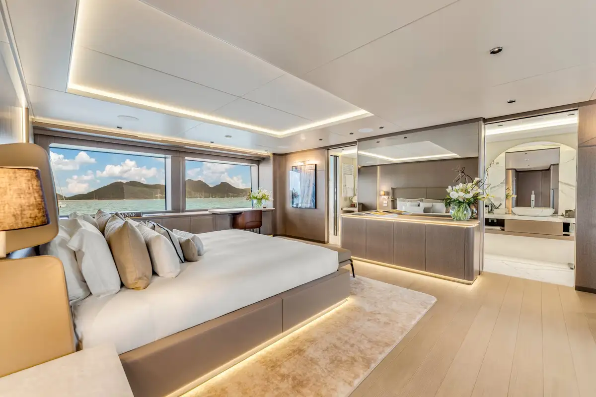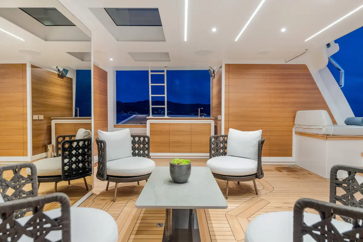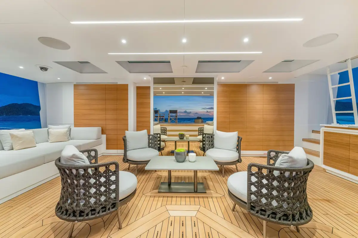 The yacht’s expansive interiors are bathed in natural light, with floor-to-ceiling windows providing stunning views. The seamless flow between indoor and outdoor spaces gives a feeling of openness throughout the yacht.