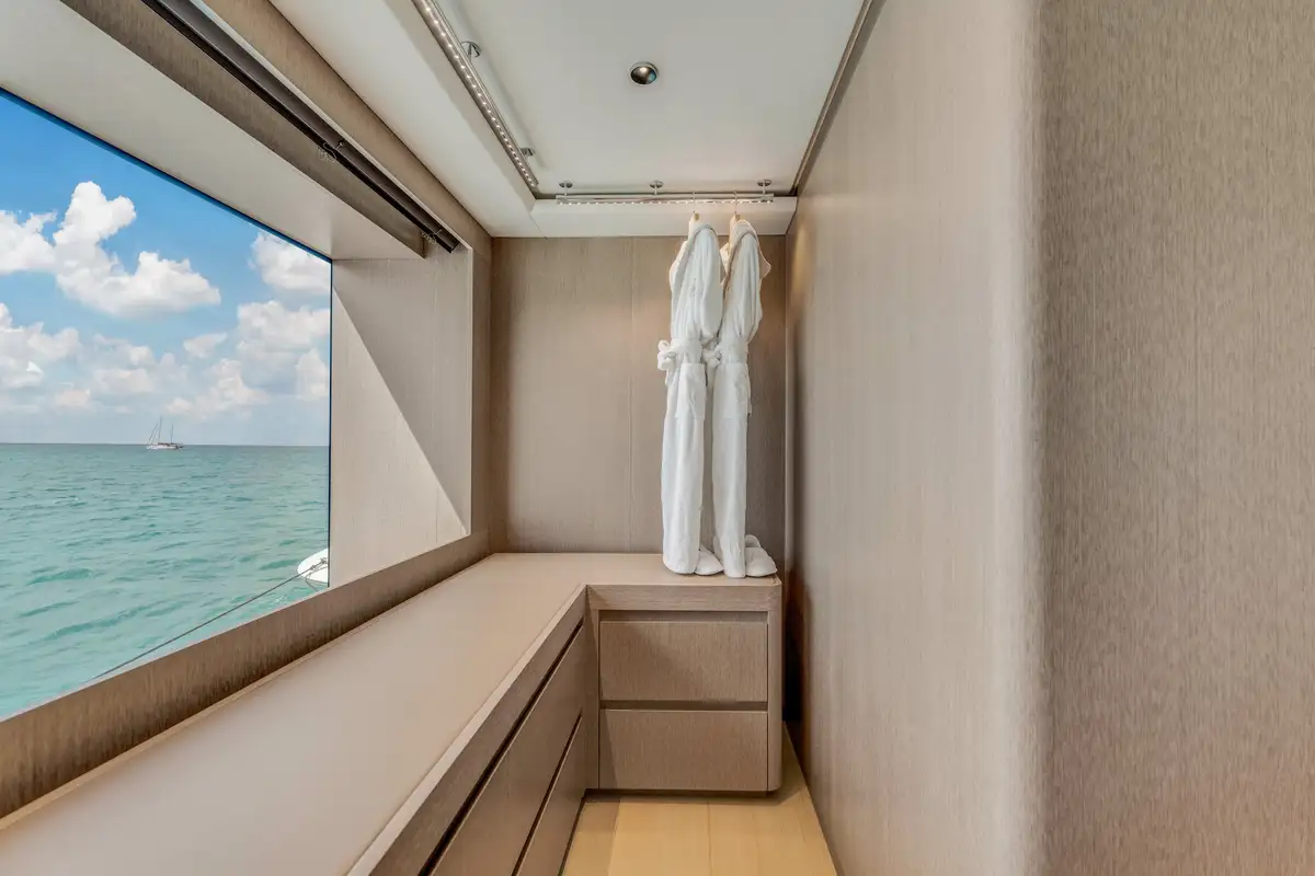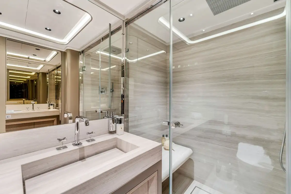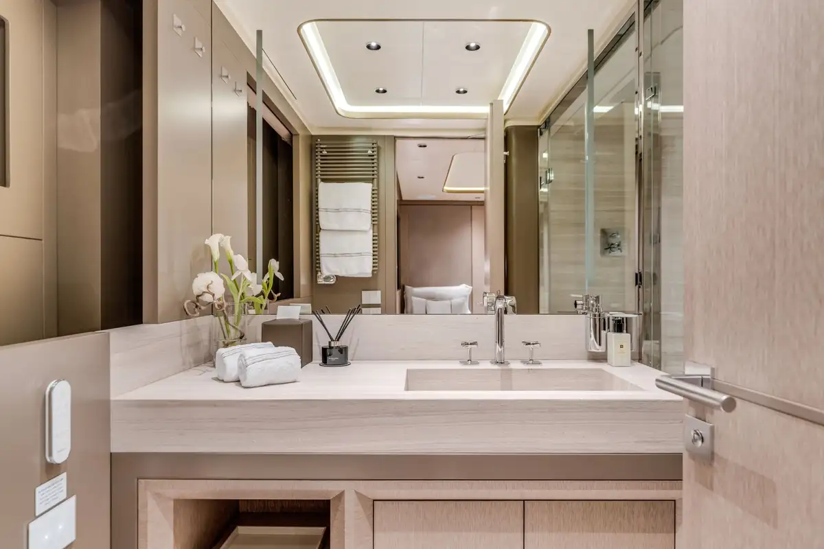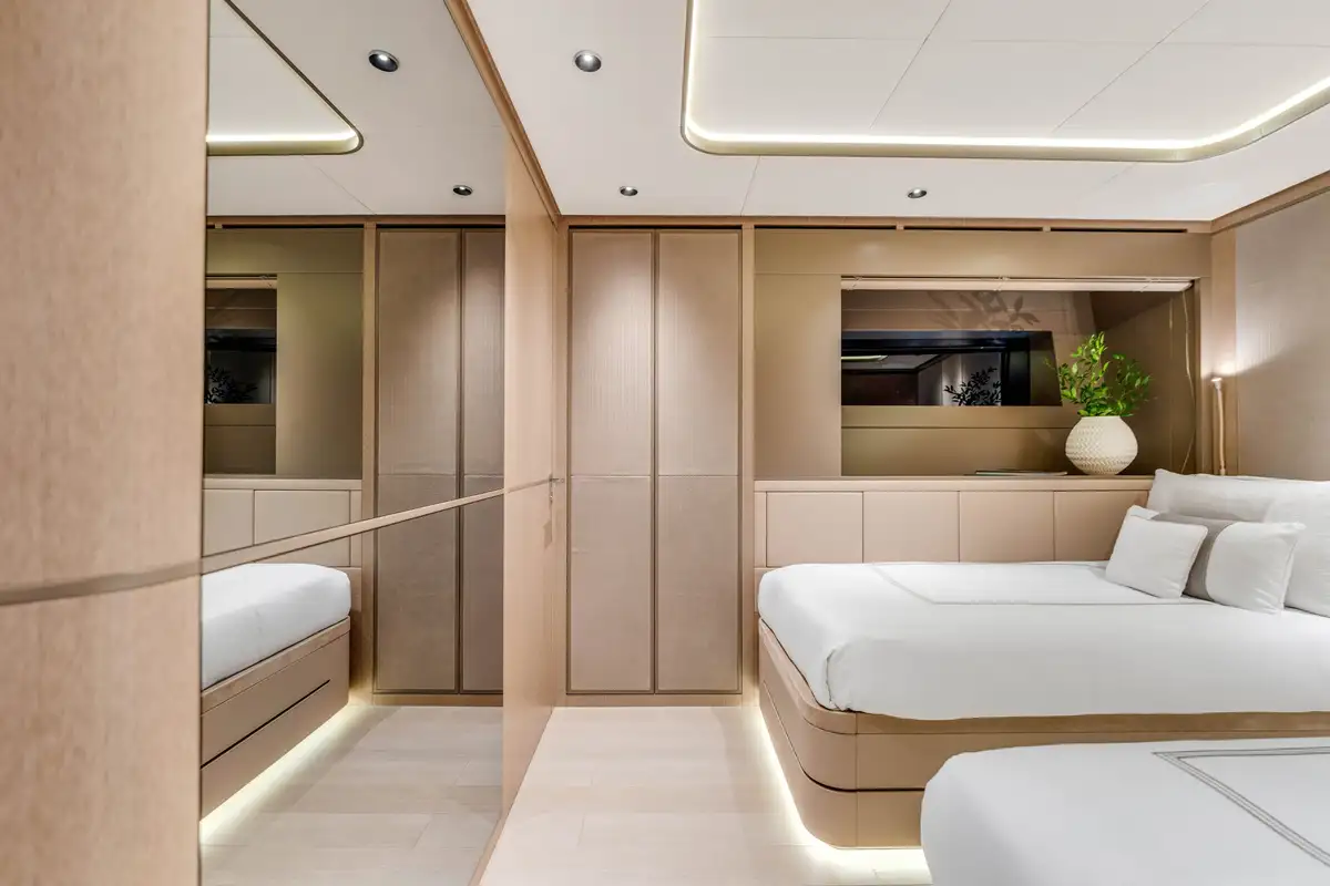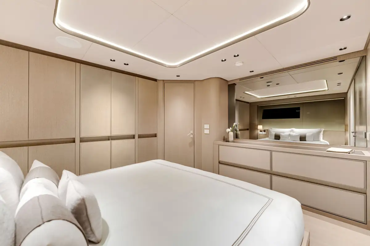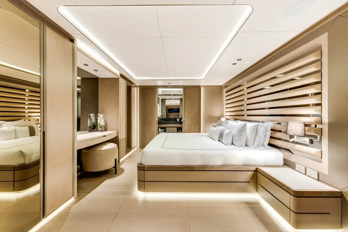 The yacht’s expansive interiors are bathed in natural light, with floor-to-ceiling windows providing stunning views. The seamless flow between indoor and outdoor spaces gives a feeling of openness throughout the yacht.