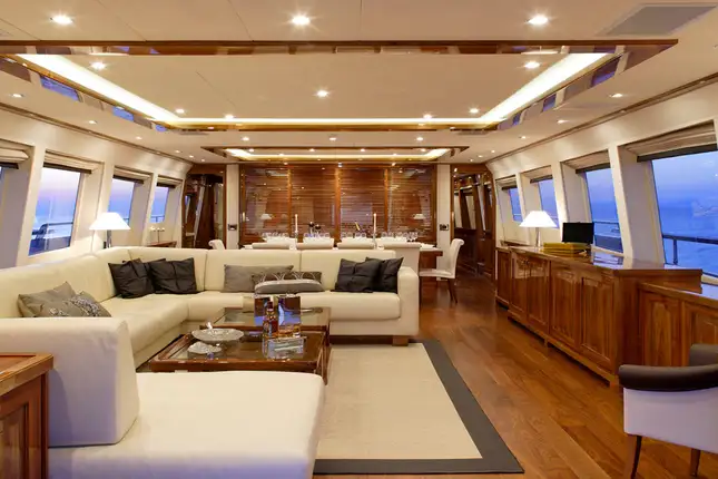 Step into the serene and contemporary interior of DRAGON, where neutral tones and plush furnishings create an inviting atmosphere. The main deck lounge provides a spacious setting for relaxation and entertainment, seamlessly connecting to the formal dining area. State-of-the-art communication and entertainment systems ensure guests remain connected and entertained throughout their journey.