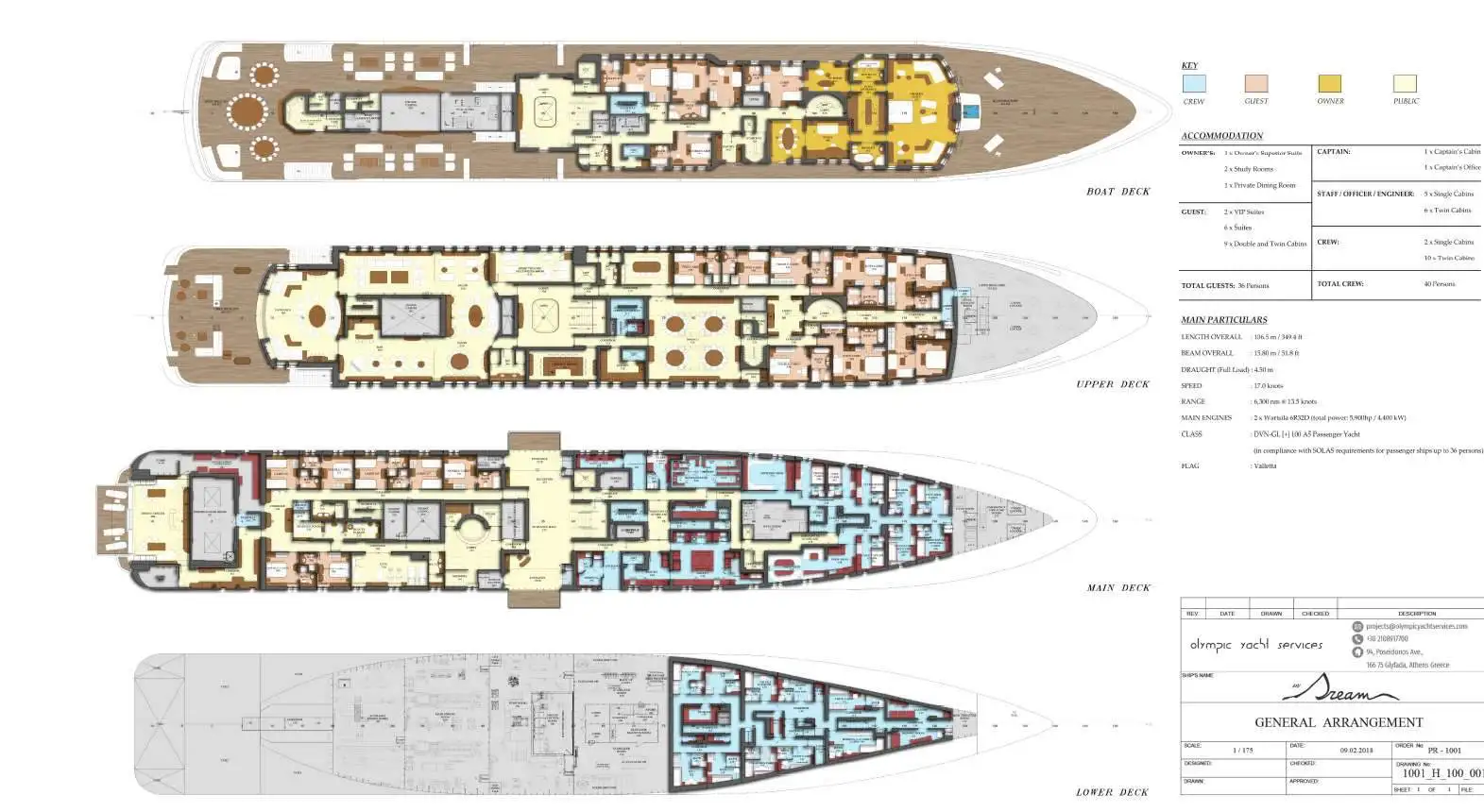 Onboard facilities are of the highest standard and include a wellness centre, business suite, cinema, three formal dining areas, and two bars. She has a fine collection of watersports equipment accessed from the waterside beach club area. There are three Yamaha PWCs, an amphibious vehicle, SeaBobs, sailing dinghies and a collection of towable inflatables, boards, and skis. For those who enjoy diving, DREAM also has an on board dive centre.