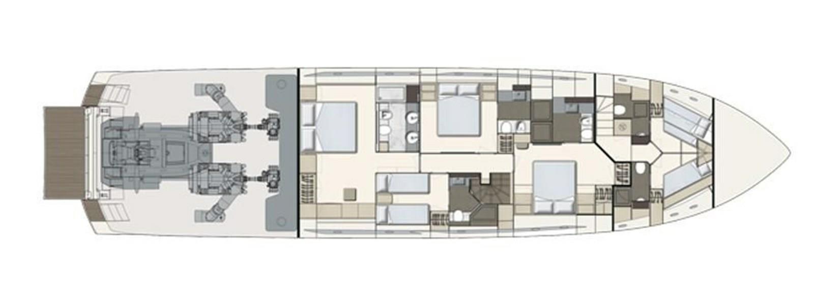 Powered by MAN engines, the Ferretti Yachts 850 E3 delivers remarkable performance, enhanced by stabilizers at anchor and underway to ensure optimal comfort at sea.