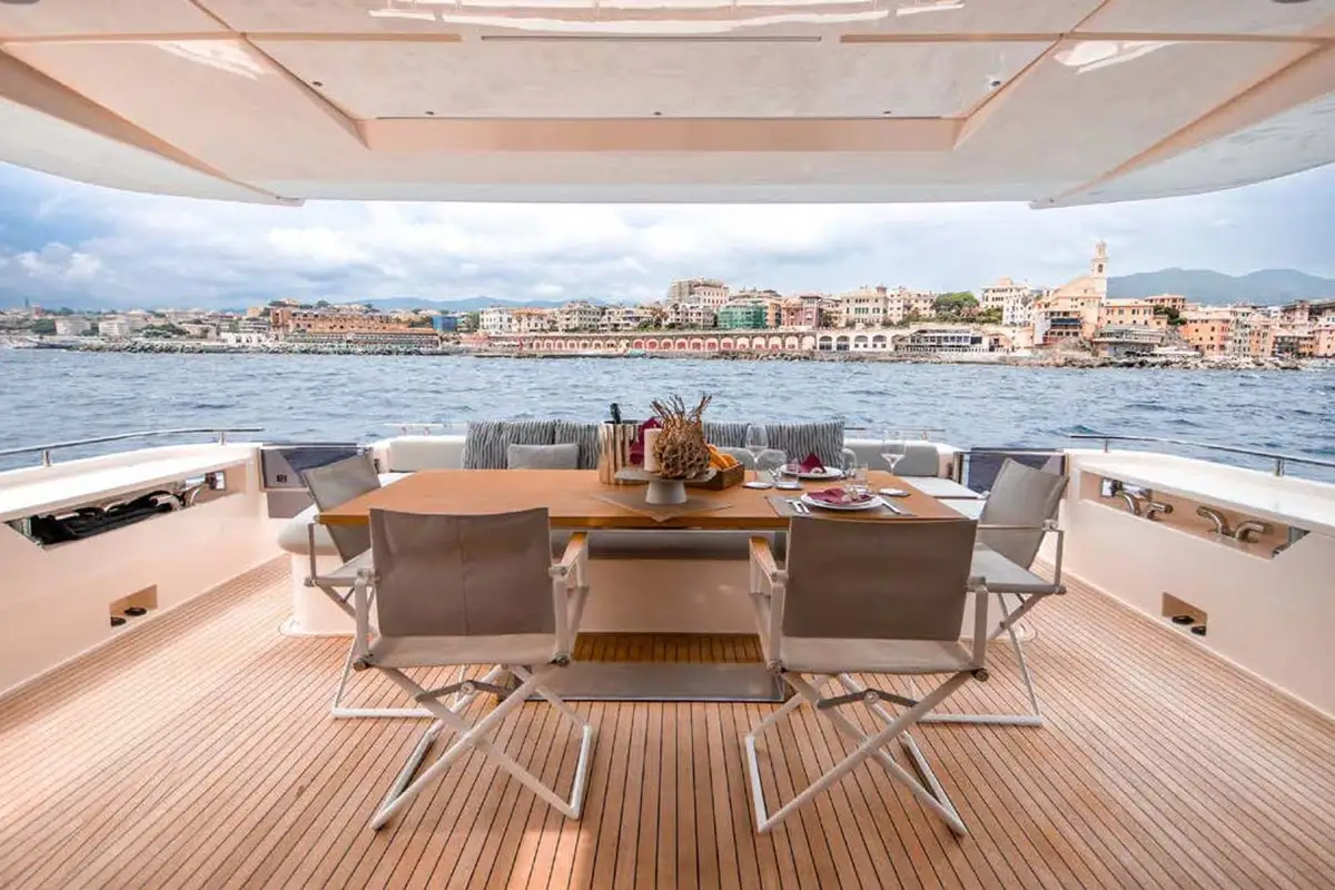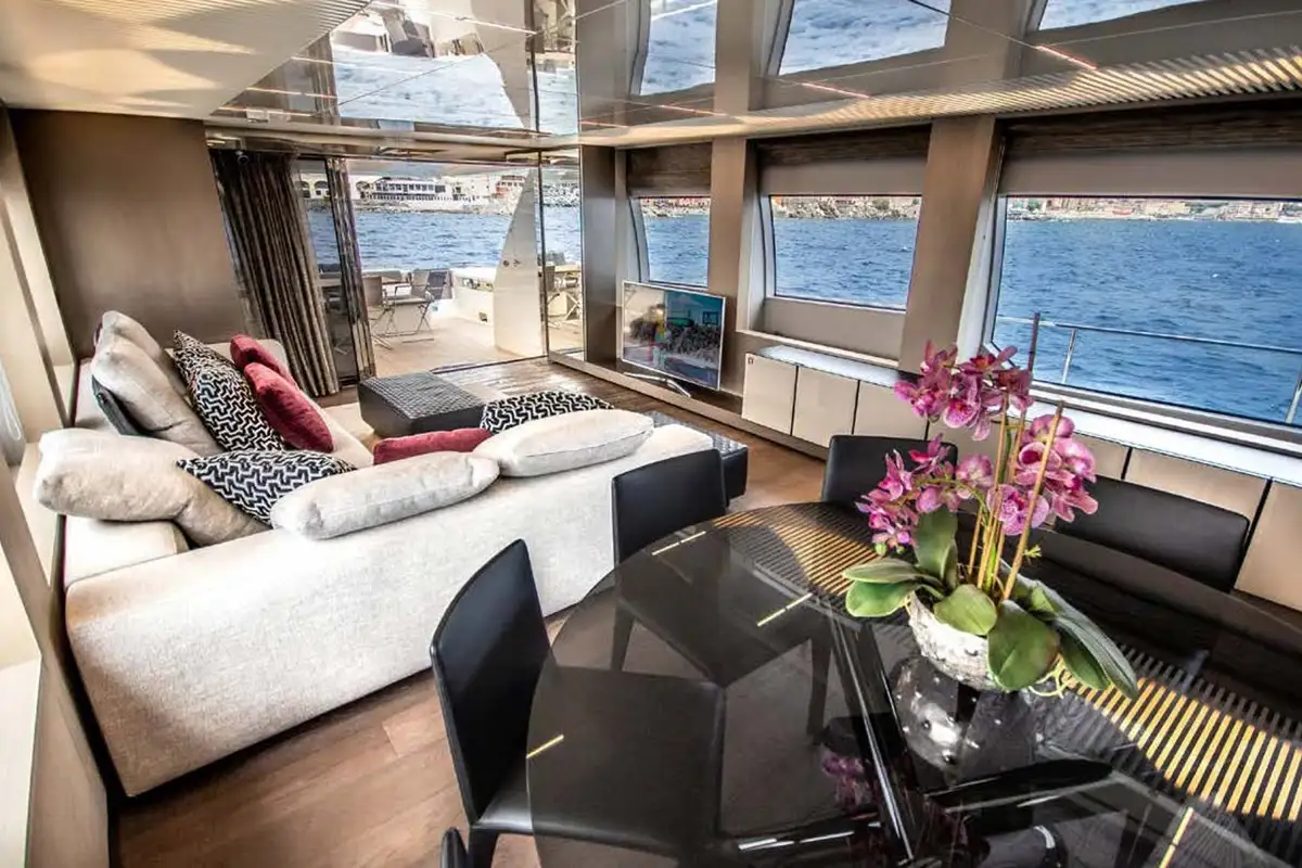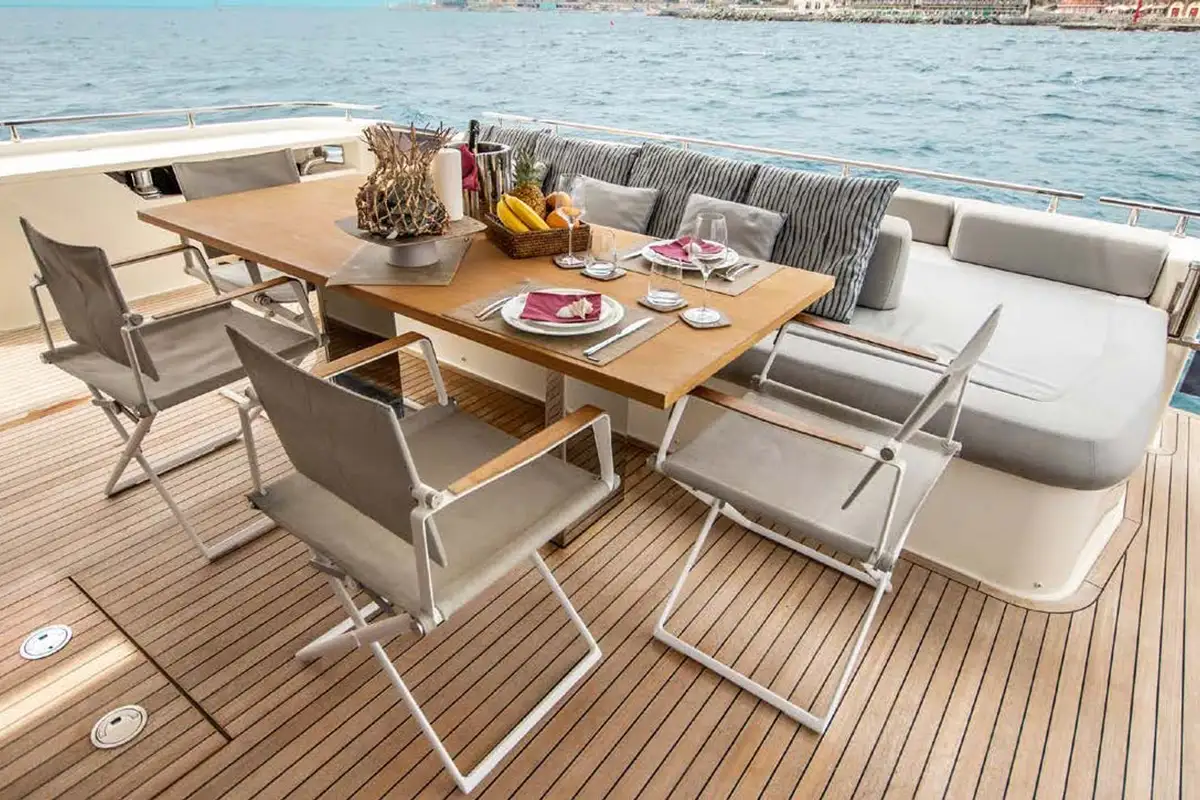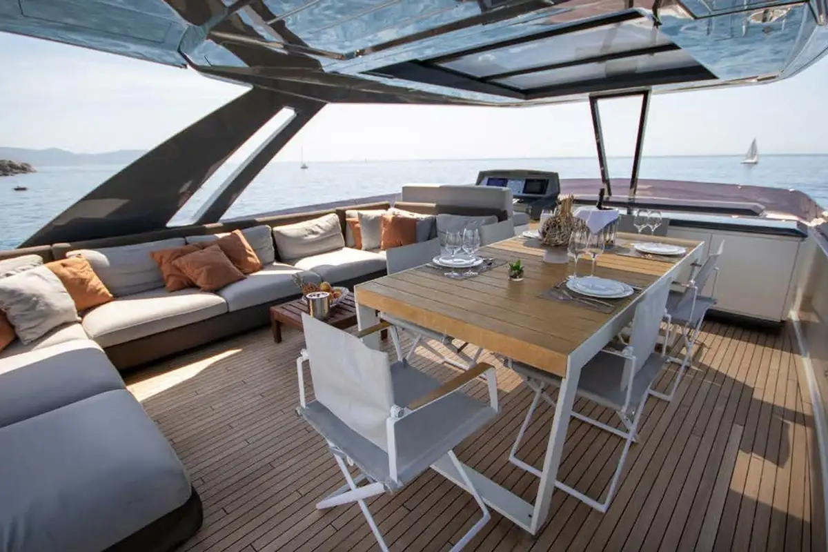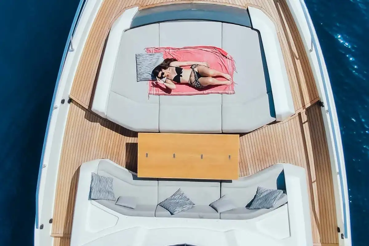 The flybridge extends the living space outdoors, complete with a helm station, bar, and lounging areas. The forward external area features a spacious sun pad and table, perfect for relaxing in privacy.
