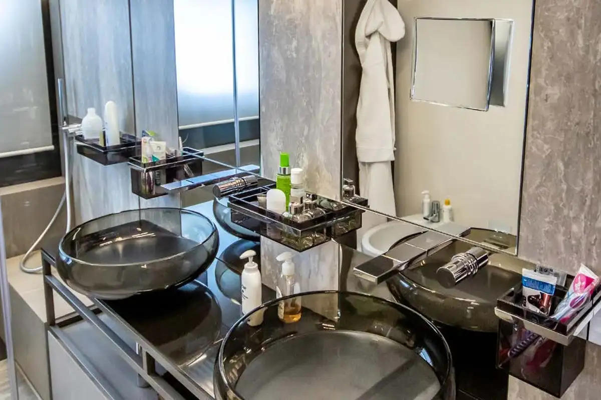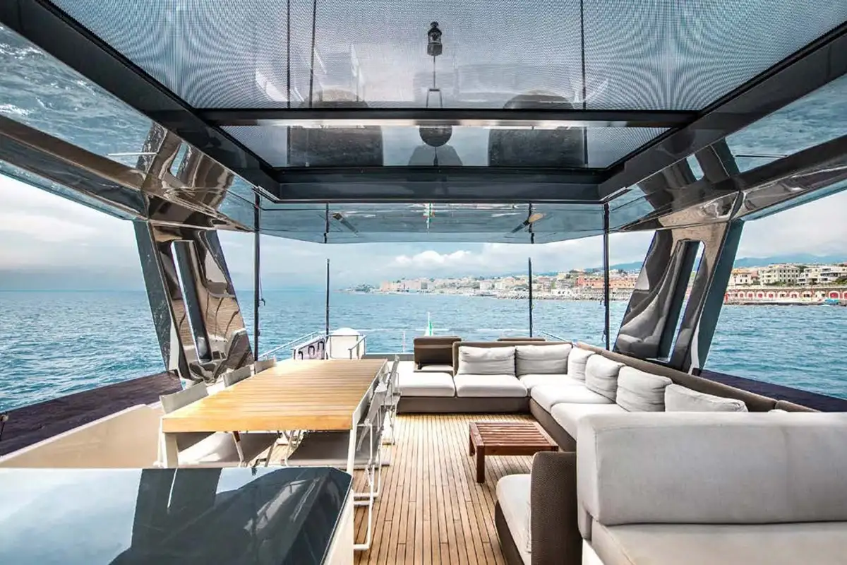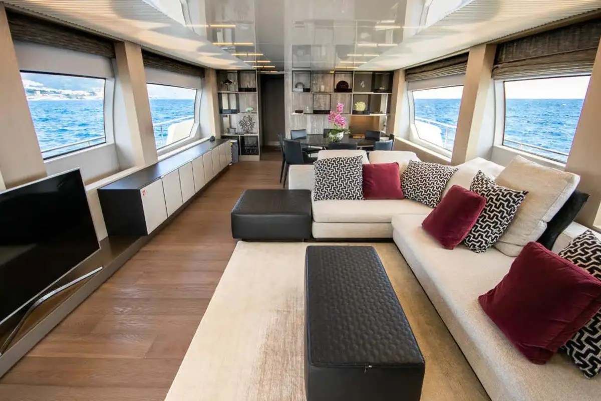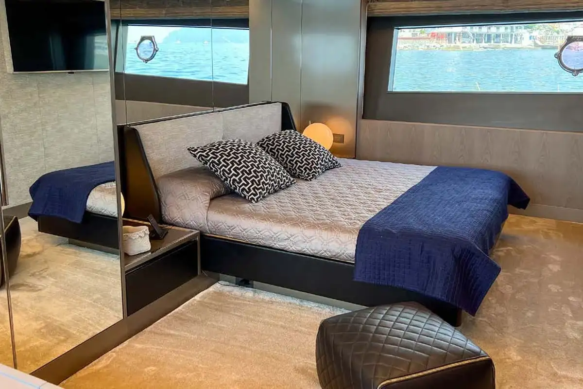 The exterior design of the Ferretti Yachts 850 is both striking and dynamic, with trapezoidal hull windows that flood the interiors with natural light and offer panoramic views of the sea. Inside, the main deck exudes contemporary elegance, with an open salon and dining area extending over 10 meters. The master stateroom, styled after the main deck salon, boasts a study area, spacious wardrobe, and en suite bathroom. Two VIP double cabins and a twin cabin ensure comfort for all, while crew quarters in the bow provide privacy and convenience.