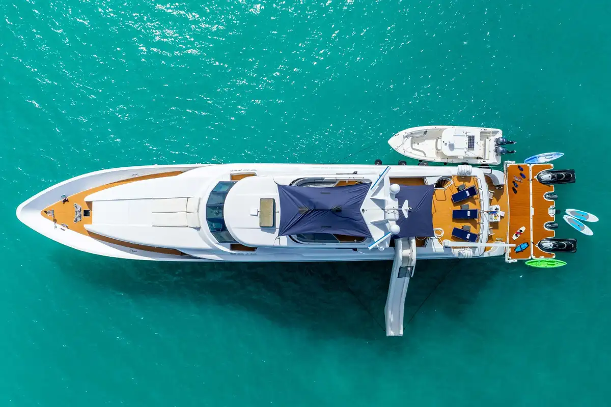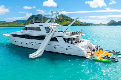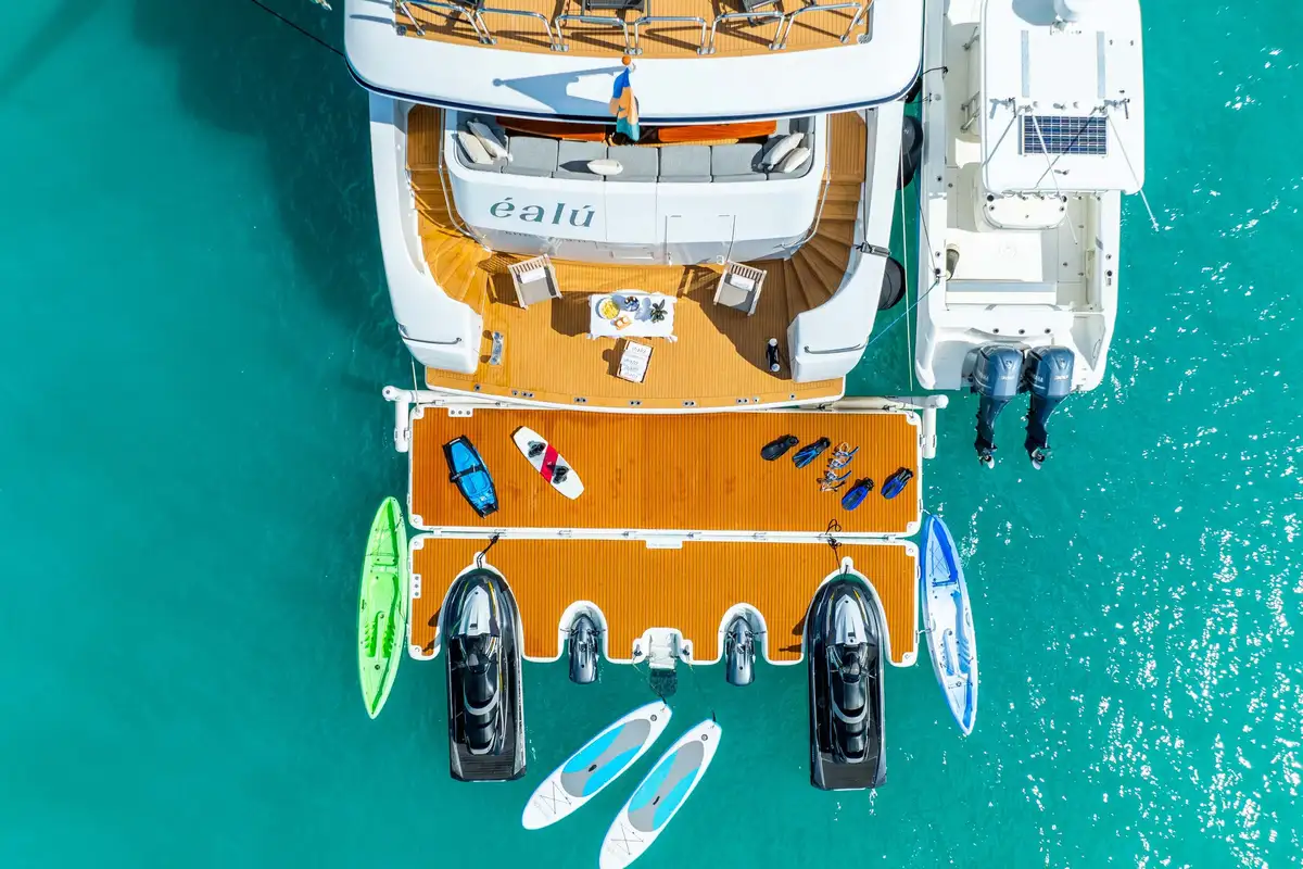 The sundeck is perfect for soaking up the rays while taking in expansive views of the horizon. A central raised jacuzzi and social seating invite intimate conversation or solitary contemplation.EALU has an impressive range of water sports equipment for those seeking excitement. Enjoy swift transfers in the 9.8m (32ft) Boston Whaler, or opt for the thrill of an eFoil board, two Sea-Bob, two SUPs, two jetskis, and two kayaks. Take the water slide from the upper deck to the sea, snorkel, or try out the collection of towable inflatables; on EALU, adventure is always at hand.