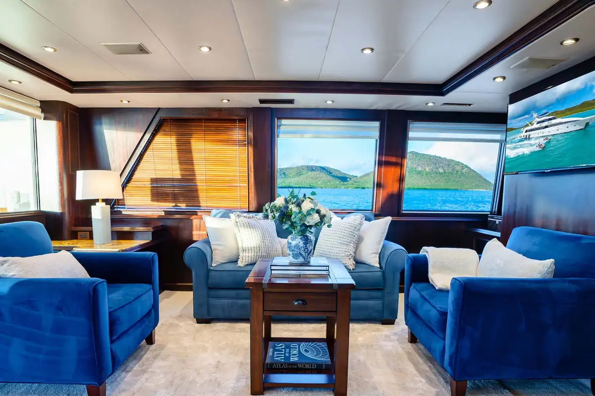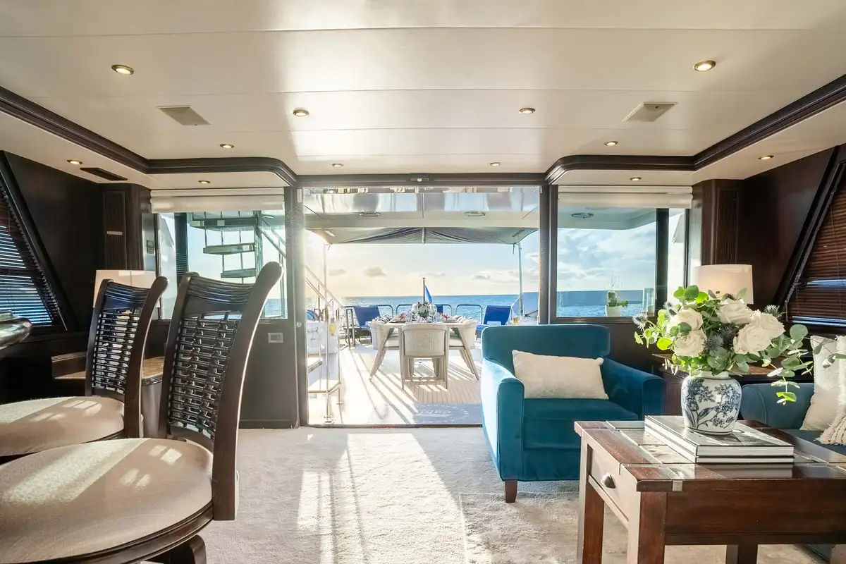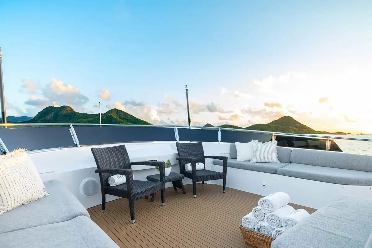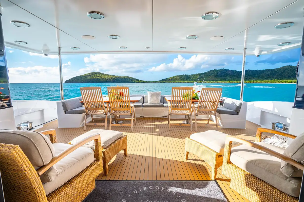 Arriving in the main deck cockpit, you’ll notice it’s designed as a relaxed gathering space. It offers al fresco seating with tables – an ideal setting for a leisurely breakfast or a quiet planning session for the day’s adventures.