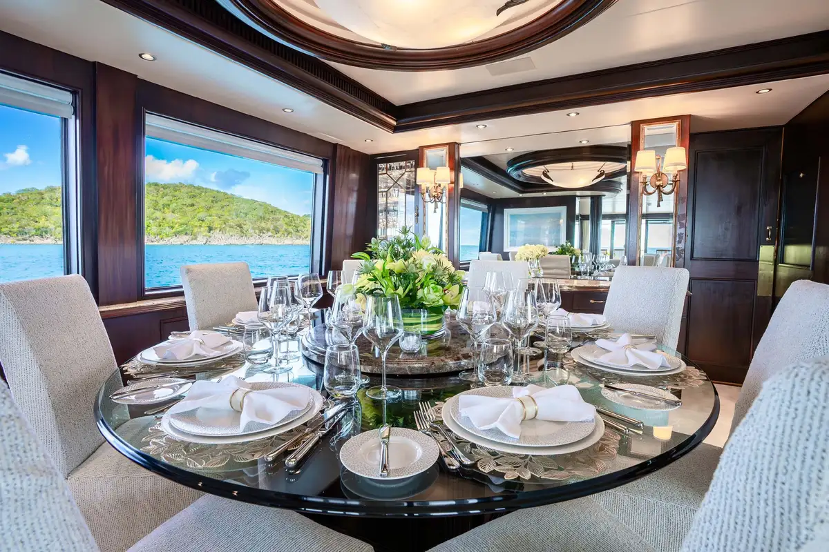 On the main deck, the lounge is a welcoming retreat with a plush sofa and armchairs. A delightful formal dining area is ahead; here, you’ll experience the culinary delights from EALU’s chef.