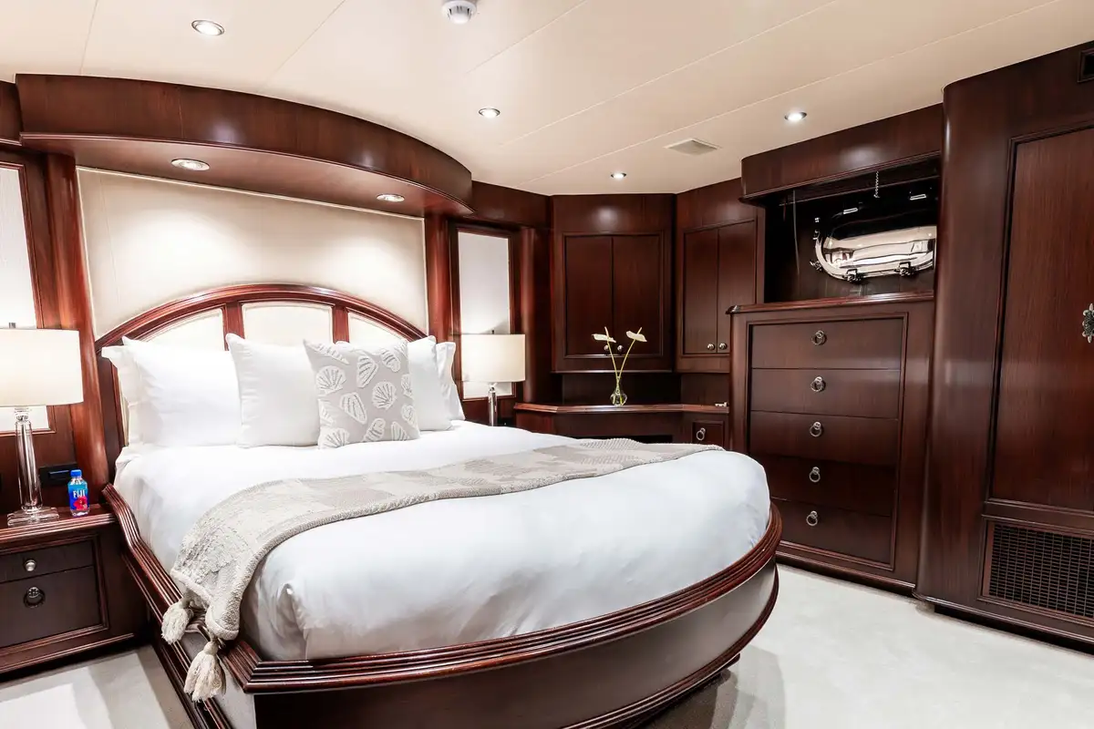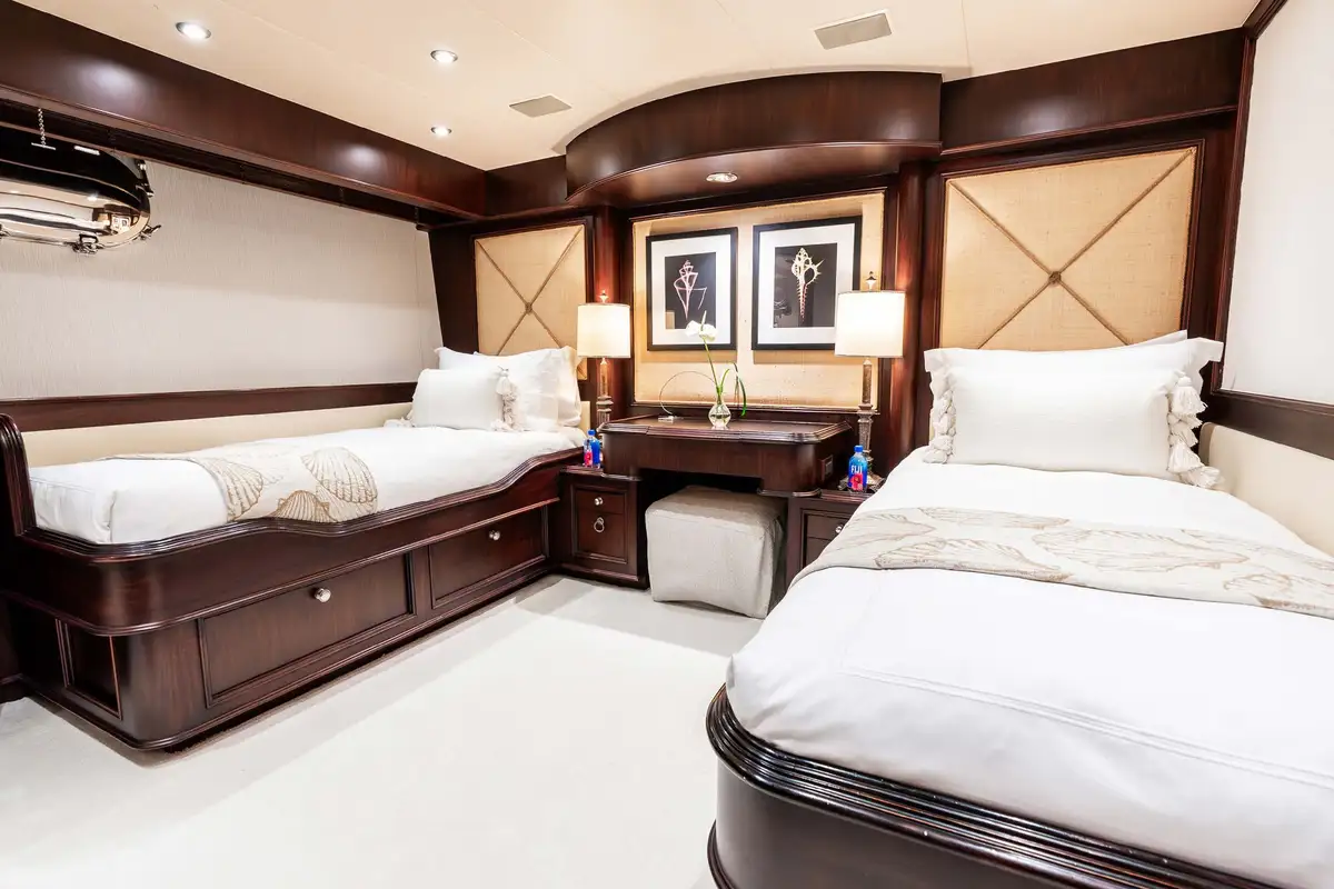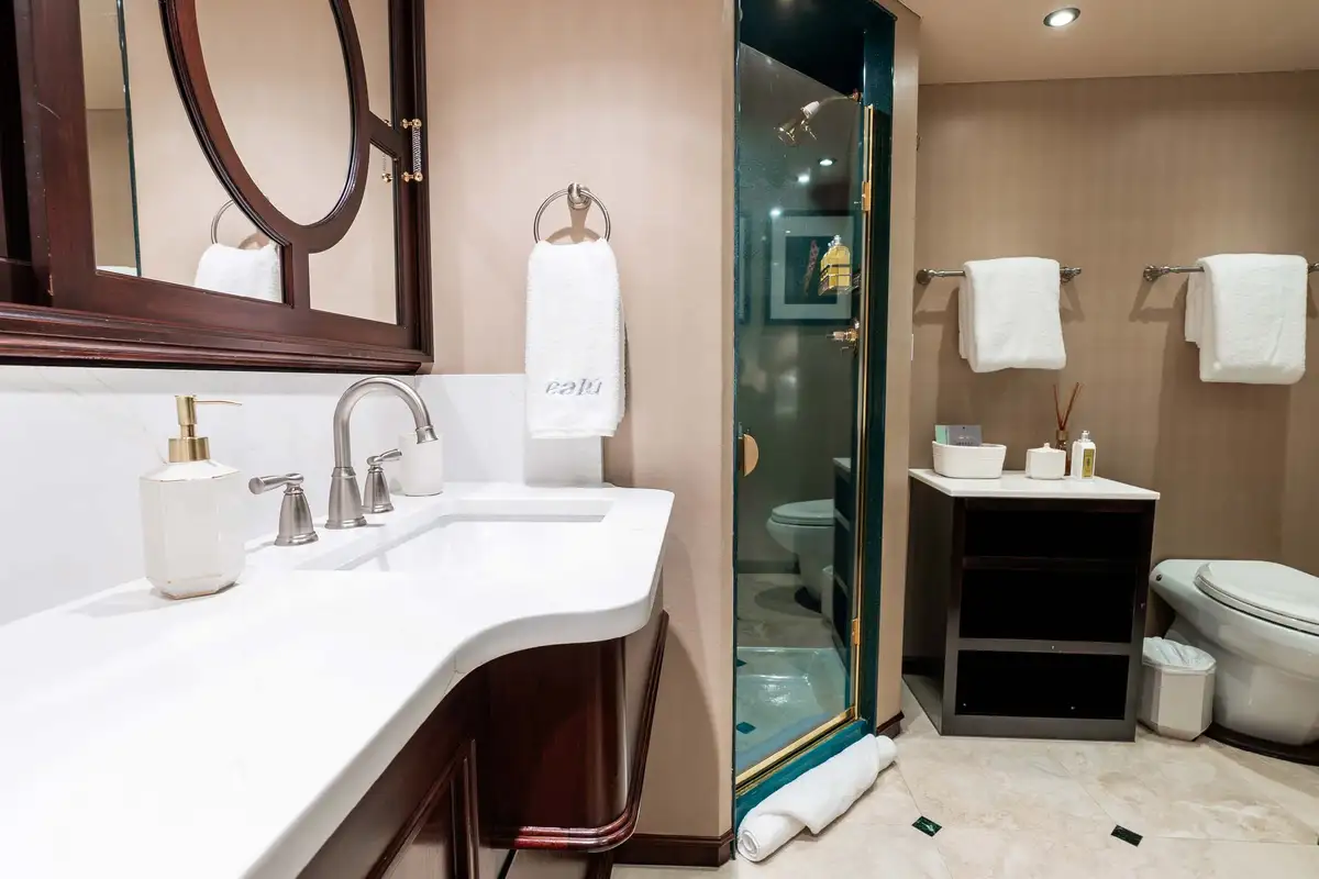 Forward of the guest lobby, the master suite exudes sophistication. It features an en suite bathroom complete with a separate shower compartment and a spa bath – a private sanctuary for unwinding. On the lower deck, four classically styled guest suites present versatile accommodation options: one double VIP suite, two double suites, and one twin-berth suite. Dark wood accents paired with light furnishings create a timeless yet contemporary feel throughout.