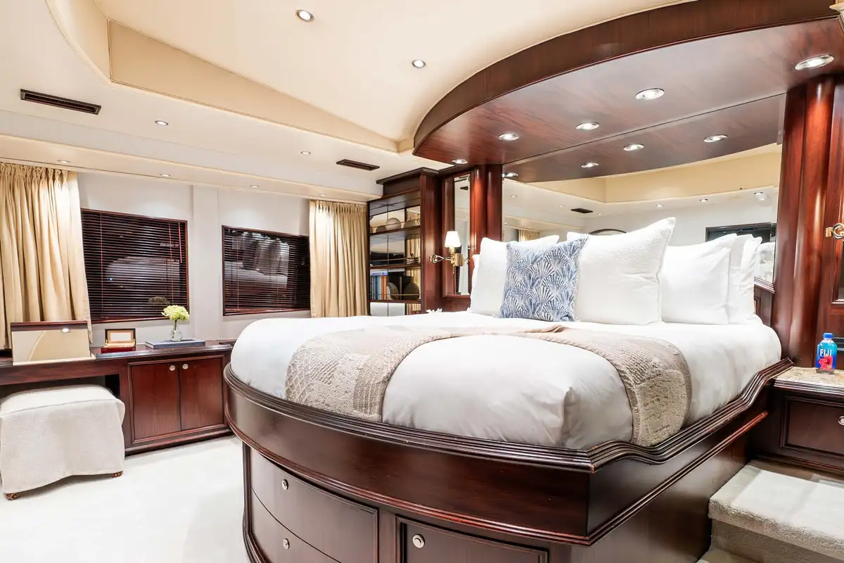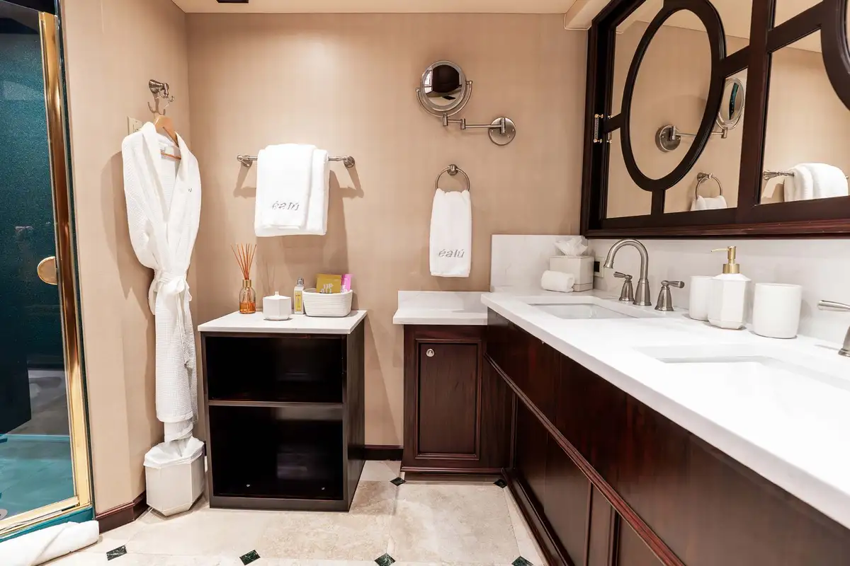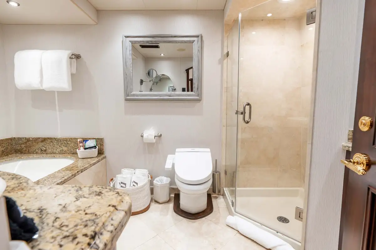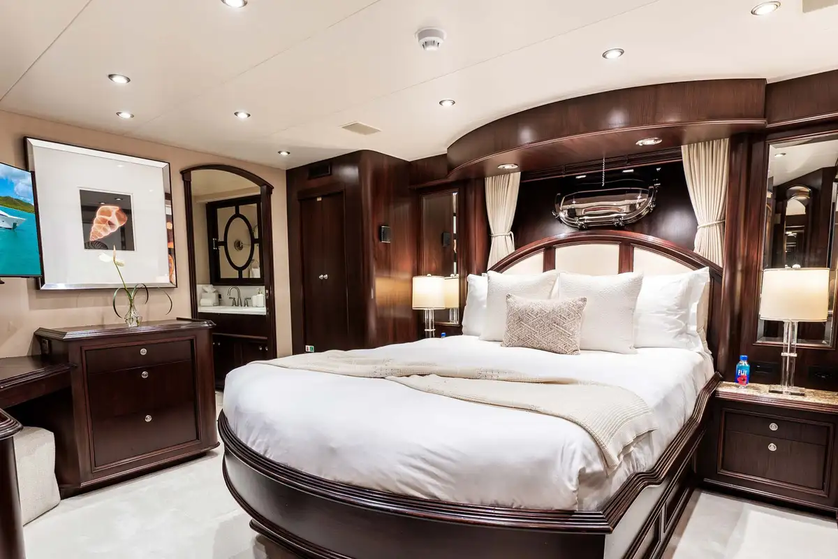 Forward of the guest lobby, the master suite exudes sophistication. It features an en suite bathroom complete with a separate shower compartment and a spa bath – a private sanctuary for unwinding. On the lower deck, four classically styled guest suites present versatile accommodation options: one double VIP suite, two double suites, and one twin-berth suite. Dark wood accents paired with light furnishings create a timeless yet contemporary feel throughout.