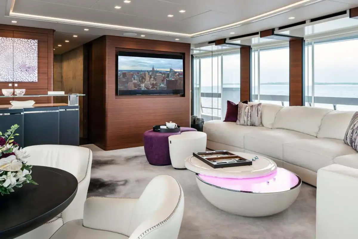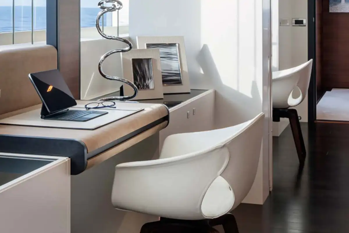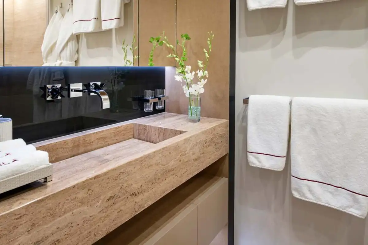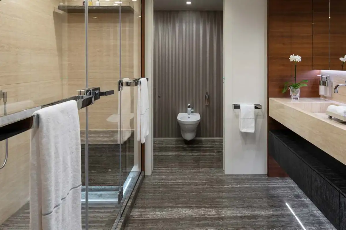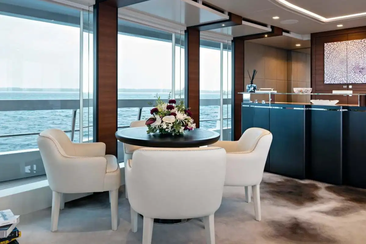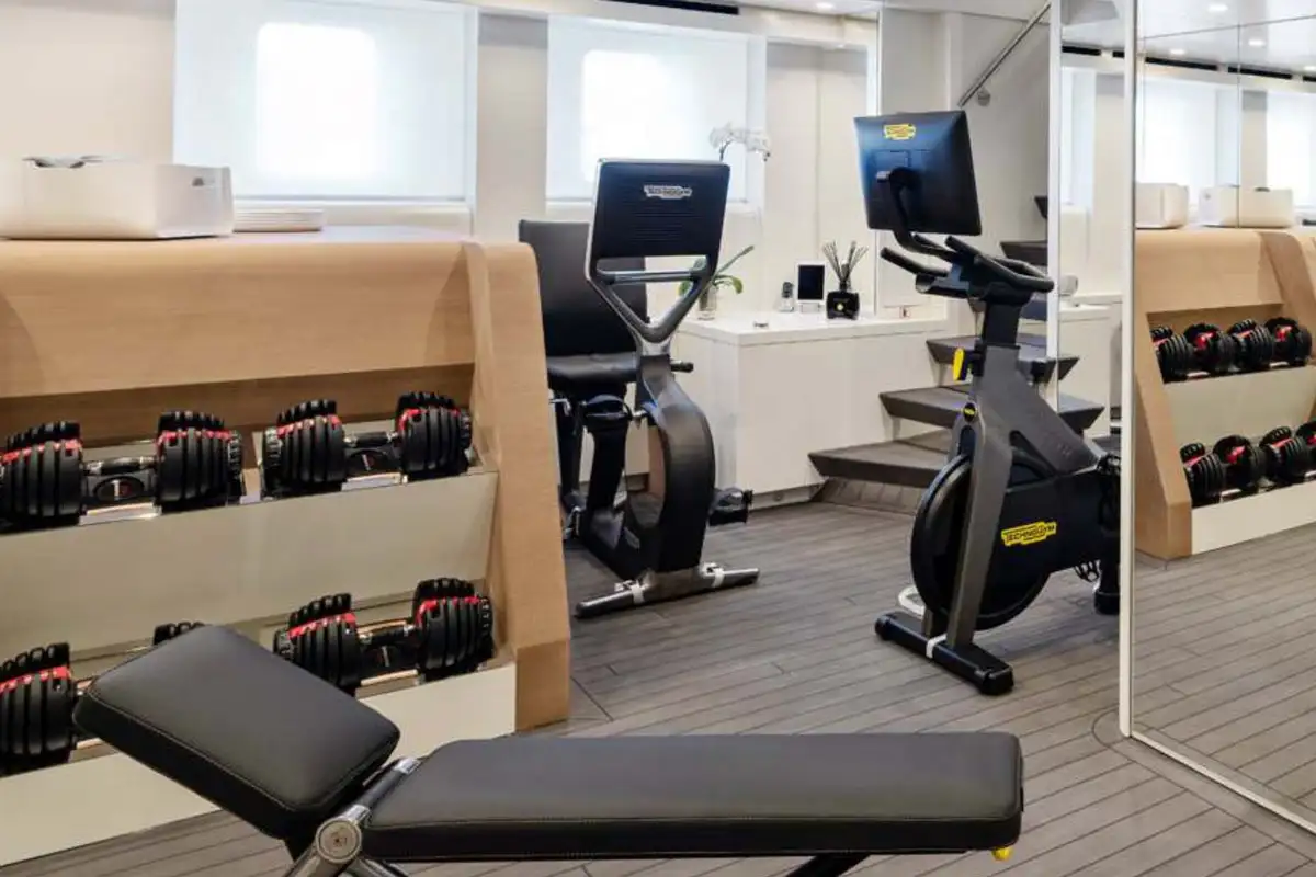 The gym is on the lower deck, accessed from the lower deck lobby and ELA’s five wonderful guest suites (three en suite doubles suites and two en suite twin-berth cabins). The forward-most suite is the full-beam double VIP suite with its en suite luxury bathroom. The fabulous master suite is on the main deck and completes her 12-guest capacity. Like the rest of the main deck and sky lounge, this capacious suite is lined on each side with floor-to-ceiling windows – from when you wake until you sleep, you’ll benefit from unbeatable views of your surroundings.