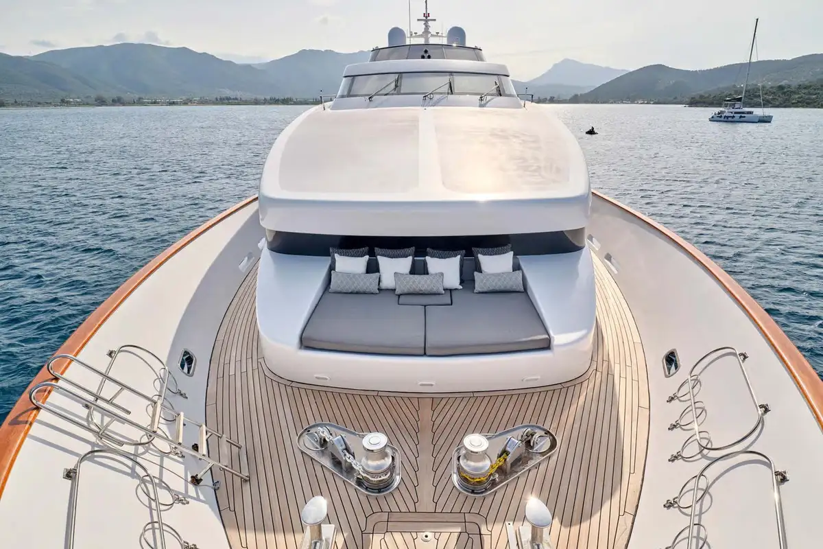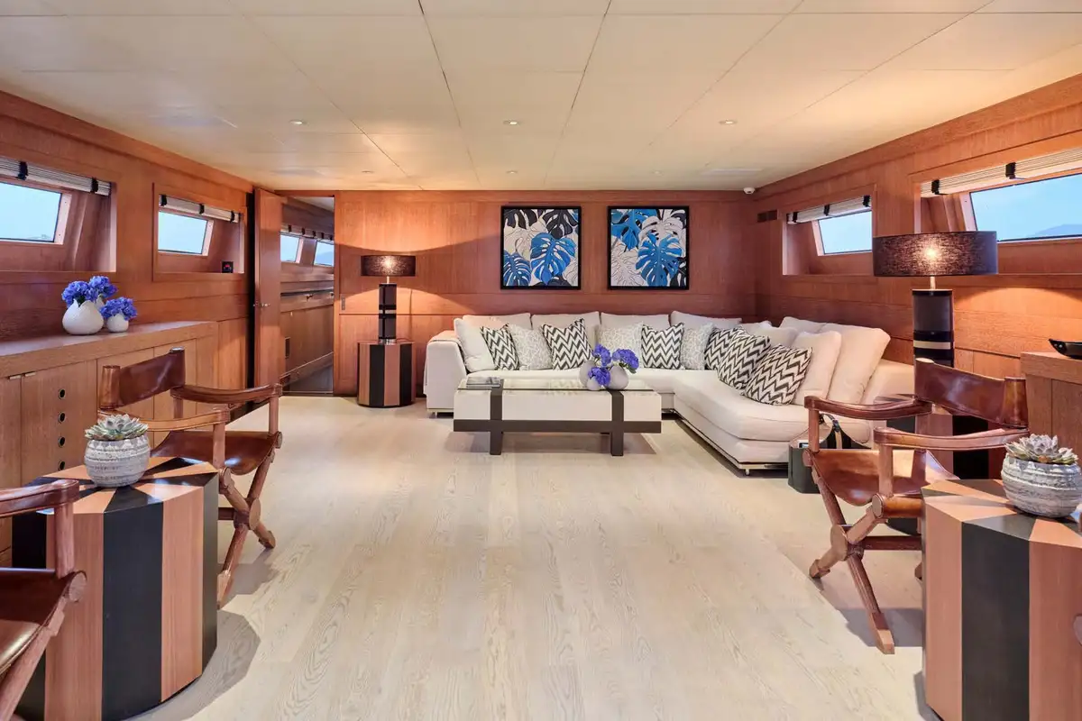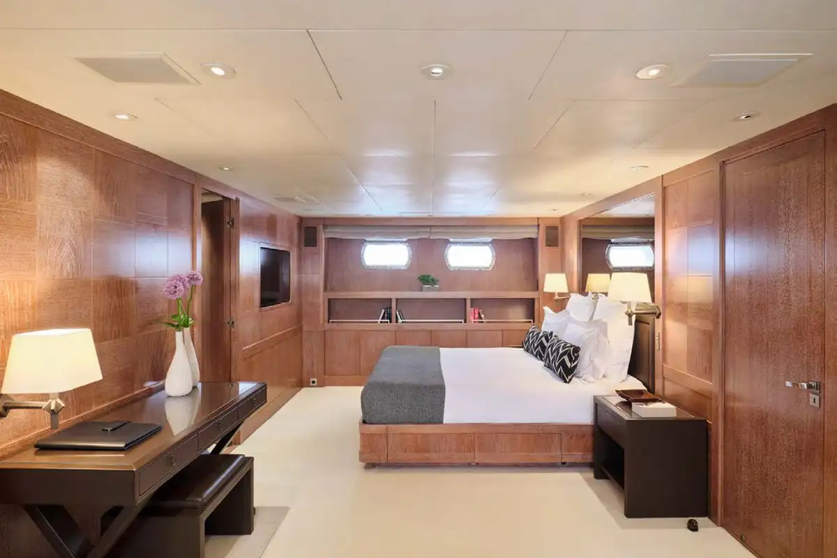 Designed to host 12 guests in four luxurious double cabins and two twin cabins, her versatile accommodation makes her perfect for you and a party of family and friends to enjoy. There is a sumptuous full-beam VIP suite on the lower deck. On the main deck, the elegant full-beam master suite benefits from his and hers bathrooms a dressing room and a private office and lounge.