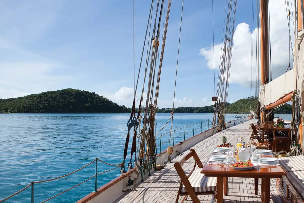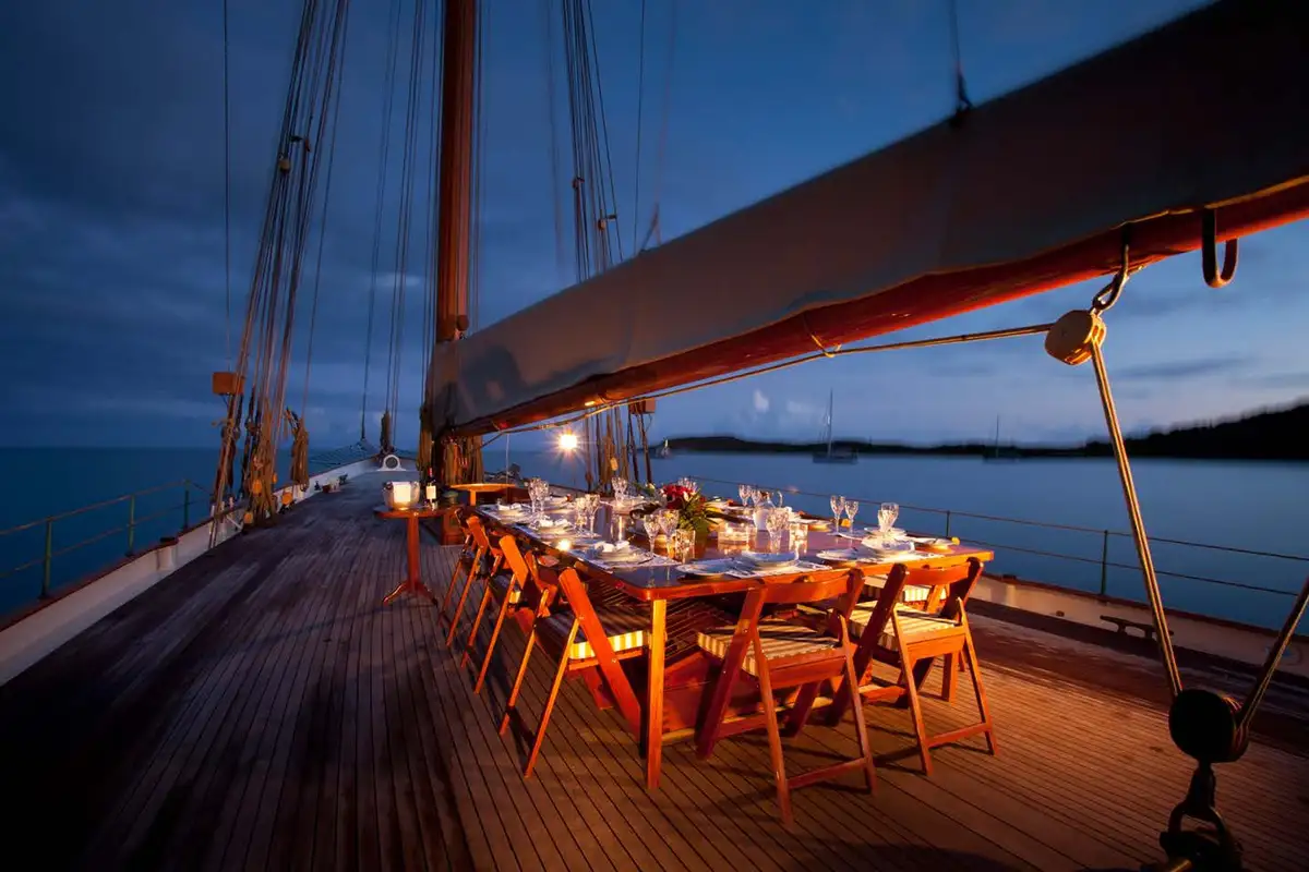 Her impressive profile under a cloud of powerful white sails tells much about her capabilities and the unique cruise that awaits. When stepping on board, the flawless deck gives an impression of freedom and space with uncluttered views and various lounging areas available. A comfortable dining table on deck will become the preferred spot for breakfast and for al fresco dining under the stars. An awning above the boom can provide shade making this area the social heart of the yacht.