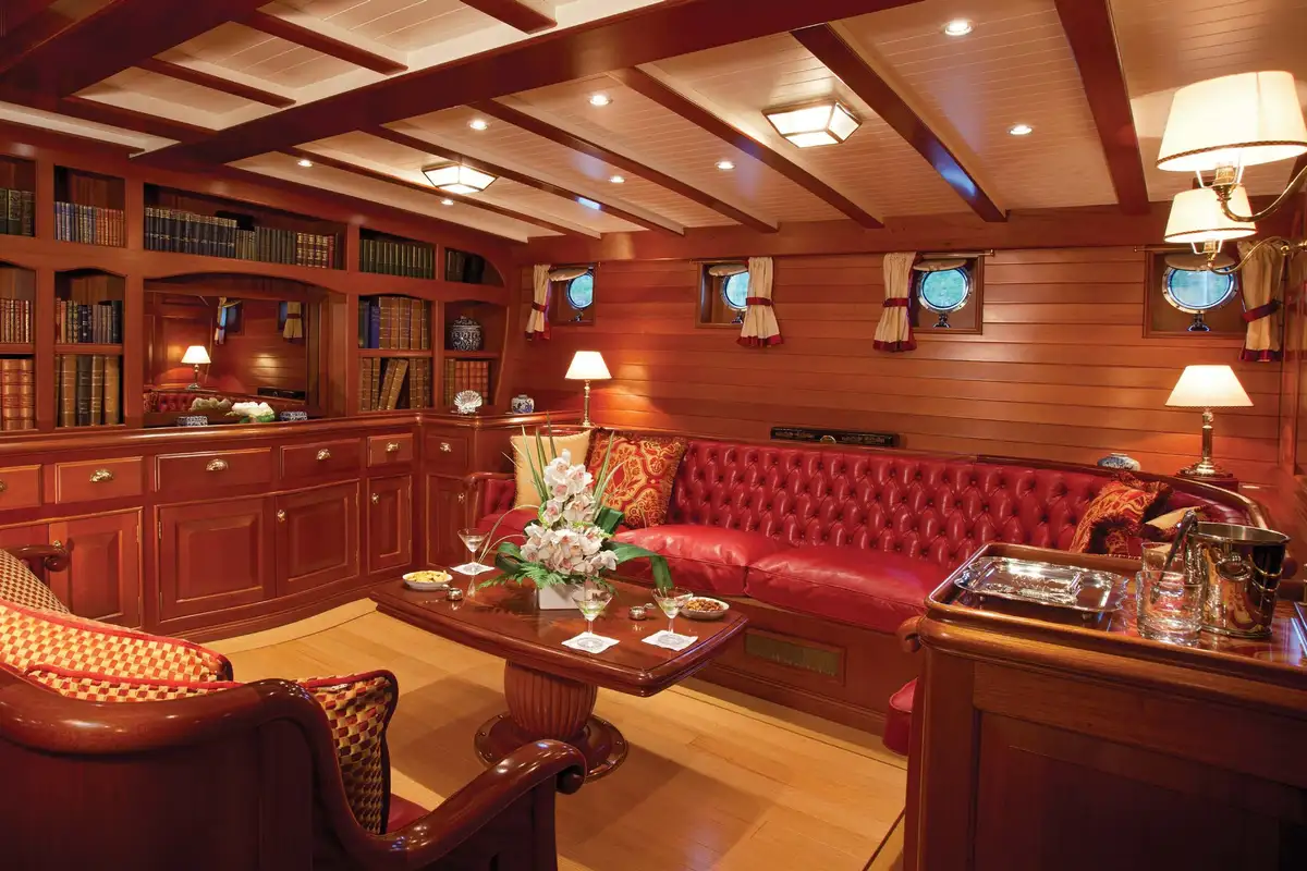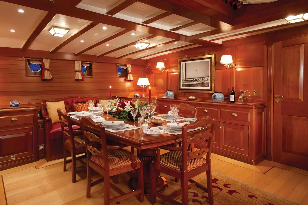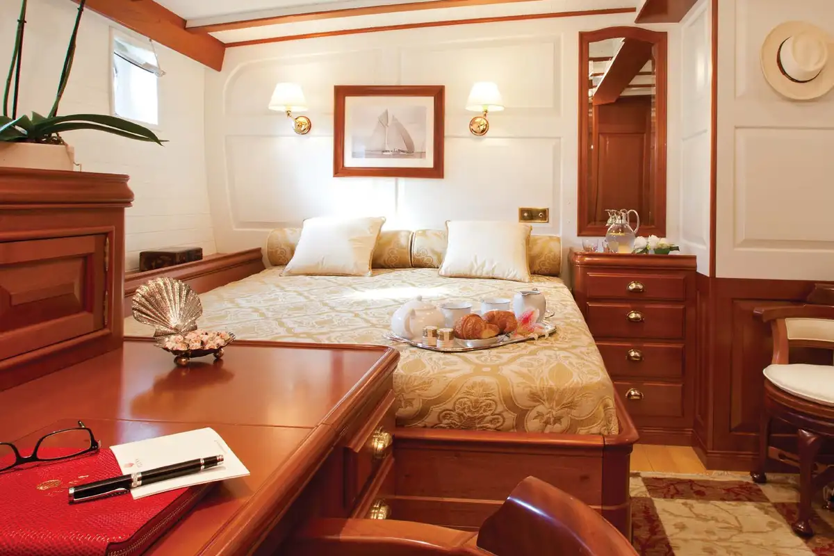 Guest accommodation consists of a comfortable master suite with a spacious bathroom with his and her sinks, and a further one double cabin and two twin cabins. All cabins get plenty of daylight through numerous portholes and are beautifully decorated in classic and elegant style.
