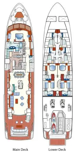 The upper deck has a bright sky lounge with a bar and seating area to unwind in the shade and cool. The aft deck is the favourite spot for al fresco lunches and dinners with panoramic sea views.