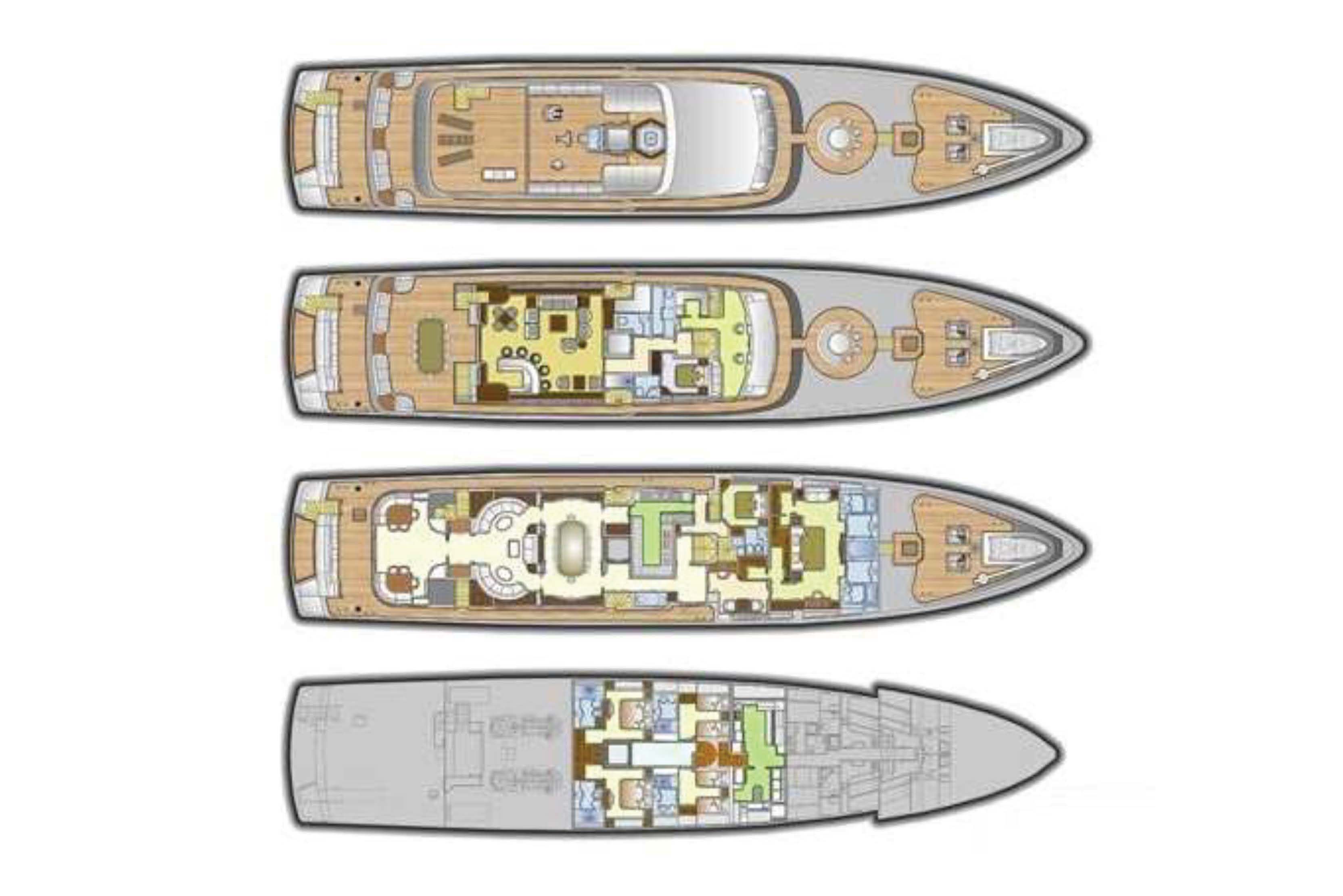 She is a family-friendly yacht with a full-beam master suite forward on the main deck with his and hers bathrooms sharing a bath and a VIP suite on the upper deck with elevated views. Two double cabins and two twin cabins on the lower deck complete her accommodation.