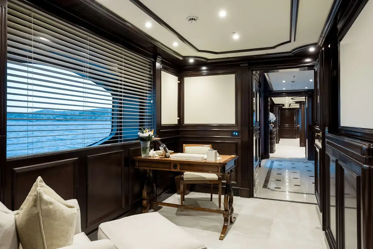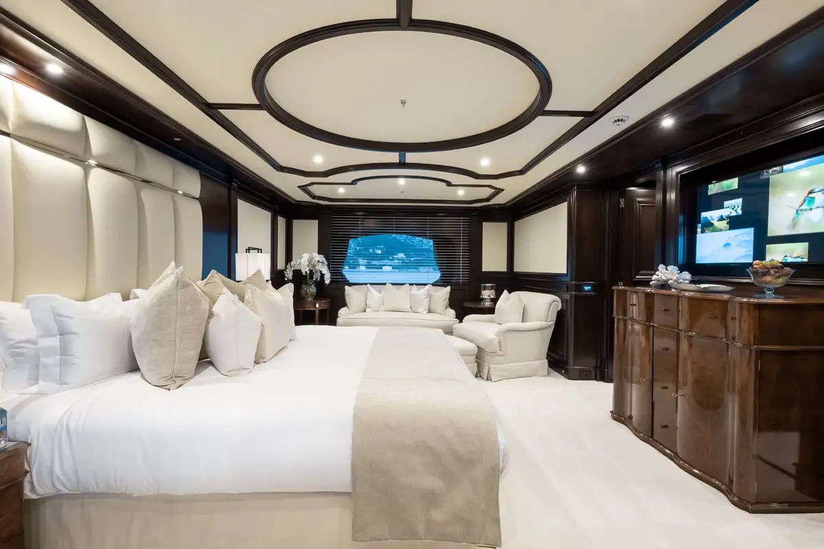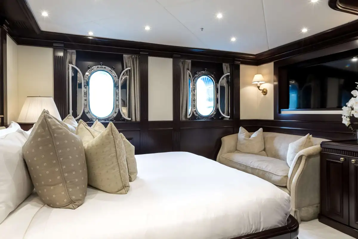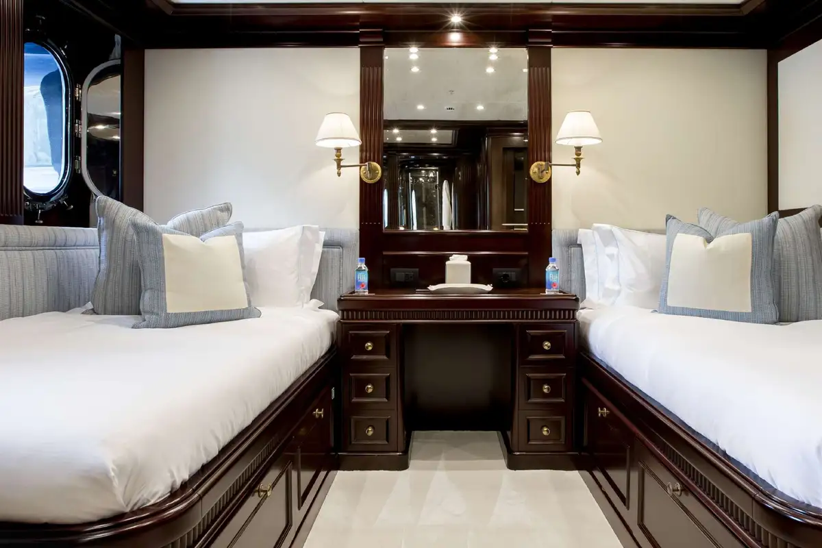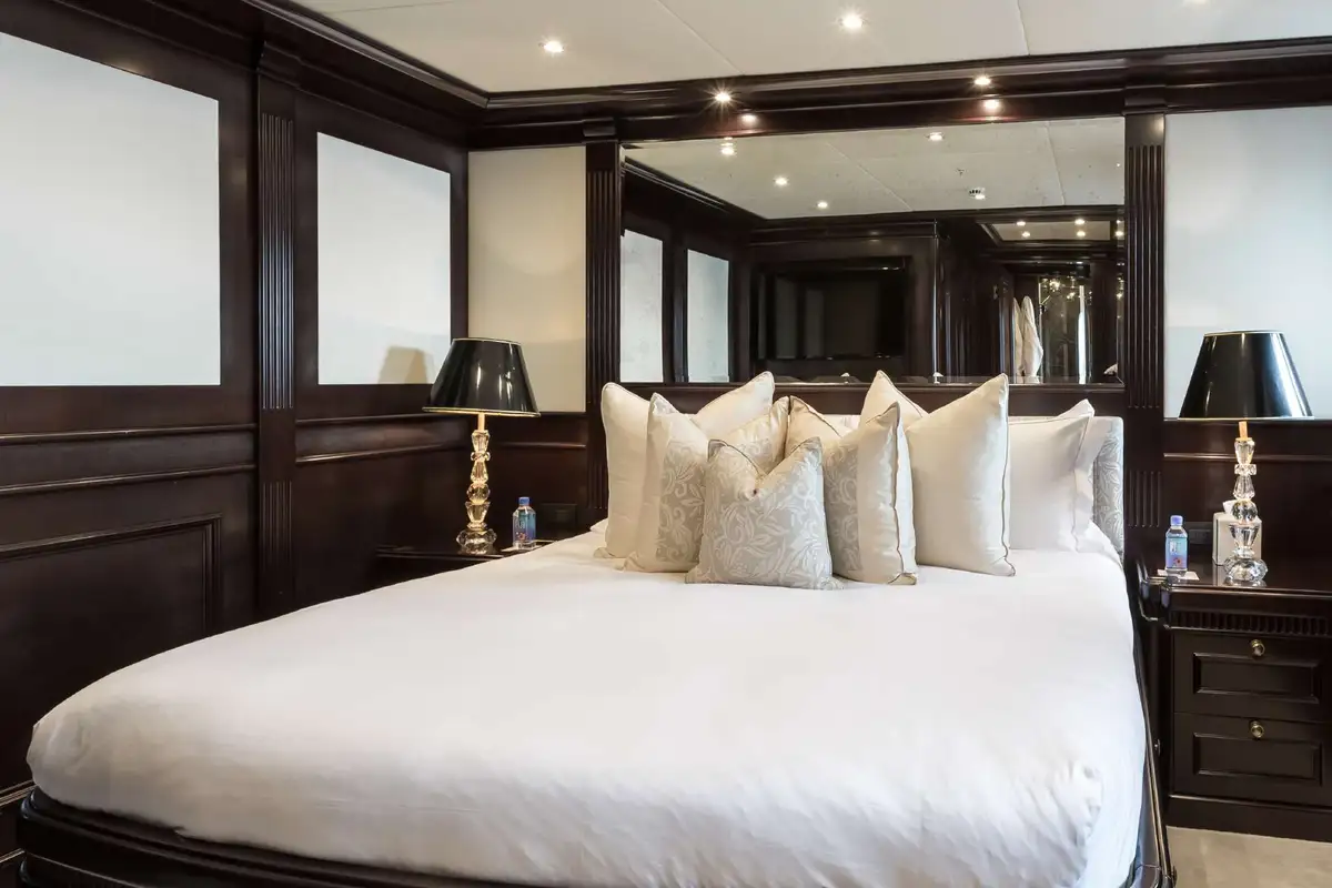 ELENI offers accommodation for up to 12 guests in six luxurious ensuite staterooms, all with rich wood panelling, sumptuous beds and immaculate bathrooms. The spacious, full beam master stateroom on the main deck has a king size bed, sofas, his and hers bathrooms with a jacuzzi en suite and a private study area. One double guest stateroom on the upper deck, two VIP staterooms with en suite bathroom (Jacuzzi bath) and one double guest stateroom on the lower deck as well as a twin stateroom. All staterooms are beautifully furnished and have en suite facilities.
